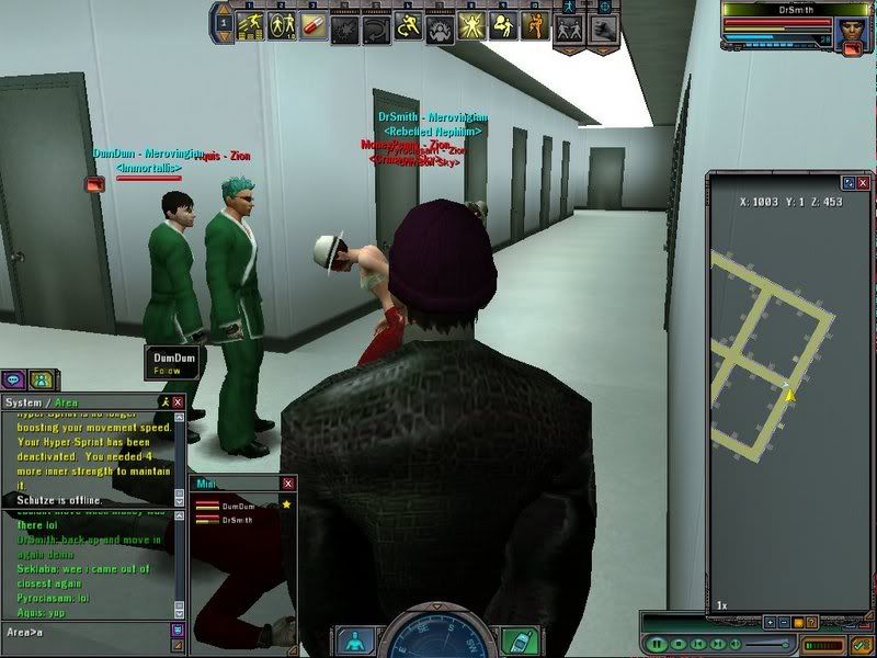 To answer everyones question about the trial account issues, I shall explain. The whole reason behind the trial is to get a bigger player base, right? So in order to do that you need to give the would be MxO player something to actually make him want to play. When Matrix is mentioned what is the first thing you think of? Bullet time and Hyper Jumping. So why not let the player experience this when he signs up? Considering he only has what 10, maybe 14 days of game time? Not everyone has the time to get up to level 10 in 14 days if there busy in RL and don't know how to play the game in the first place. Secondly Mobius code, well since you can't buy health pills anymore ( I think that was a beta thing anyways) what is the point in playing if you and the npc your fighting have barely any health and the npc gets the lucky hit and kills you? Well if you had a pill you might have won that fight right? But where to get a pill... oh the guide give out a pill! Wait but you have to give the guide something for the pill, so that means you have to fight, again. Well if we give them Mobius code then they have sort of a fighting chance right? Plus they get to see a cool animation when they use it (something else to look forward too, cool animations). So now they can HJ and get some health back in a losing battle, hmmm maybe they'll sub after the trial and give the game a shot.