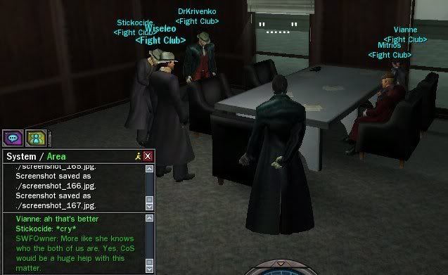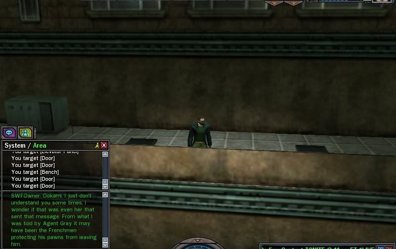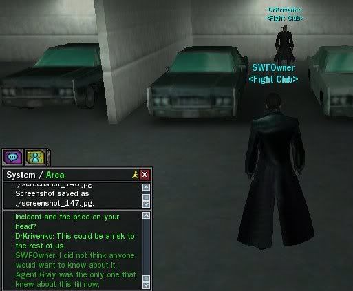 Out of the time I have had this on other forums this story/event I have been doing turned out pretty good and the others seemed to like it so I decided to bring it to the show and here it is: I have been searching for my wife for a long time with the help of Agent Gray. He has helped me more then I thought a Machine would, I am greatful for this. I my findings have lead me to a new Lupine leader by the Name of Ookami, she my know what happened to my wife. After going there to meet with Ookami is relized she nearly looked exactly like my wife, I was stunned. As she slamed my emotions all I could do was stare at her, she thought I was ignoring her and saw this as a rude act. She told me that she will put a 100,000,000 $i bounty on my head and that if I din't leave she would tell the group of party goers in Club Hel above that I was down there so I had no other choice then to leave. During the few months after this everything was going smooth till around the time that Morpheus was killed. Lupines started to show in my missions Agent Gray was sending me on, was it that Agent Gray was trying to kill me or was it Ookami? I had to find out so I went back to Club Hel when I heard about a party from a Merv. friend I have. I asked the guard to tell Ookami an old friend was here. When she came down she started yelling at me so I just came out and said. "I know who you were when you were a blue pill, if you are who I think you are then you know who I am." She responded with, "I...I...Idon't know what you're talking about Machinist! I would never be with a Machinist!! You are giving your self too much credit." So I responded. "I never said I was with you, you do know who I am! Stop denying it, you know who you are too." She responded back. "I assumed that's what you were trying to get at, by Machinist! Never come here again or else I will make sure my Lupines take you out!" She walked back into the elevator and went back to the Club. I turned and walked away. After a few weeks I noticed another large amount of Lupines on my missions but this time there were way more so I walked back to Club Hel fighting through the Suits exlie gang they had protecting it. I made quick work of them and got to the elevator of Club Hel but when I got to it they shut it down so I couldn't get up there. I picked up a radio from one of the Suits and listened to what they were saying. It turned out Ookami took off when she heard I was coming. I was furious but I didn't let it get the best of me so I walked back out of the area and went back with Fight Club to do some missions. Yesterday I went back to Club Hel again and fought my way to the parking lot. When I got there they locked the elevator again but she was still in the building this time so I picked up a radio and started trying to talk to her but just as I said something about my wife I heard a voice say "Mr. Masters! What in gods name does that scum Ookami have to do with your bluepill wife?" I turned to see who it was and it turned out to me Dr. Krivenko. The faction had finally cought me, I thought I was doing good at hiding what I was doing but I guess I slipped up some where. We talked a while about what I have found out and we decided to tell the rest of the faction. We all met at our Headquarters building and were joined by Vianne, Wiseleo, Stickocide, and Mitrios. We informed them on the situation . We came up with a plan to get Ookami alone so I would be able to talk to her with no pressure on her from the other Mervs. but in order to do this we will need more help. We have planned a meeting with the CoS faction to ask for further assistance with this matter.... http://img.photobucket.com/albums/v624/SWFOwner/Ookami%20and%20Steve%20Event/screenshot_202.jpghttp://img.photobucket.com/albums/v624/SWFOwner/Ookami%20and%20Steve%20Event/screenshot_205.jpghttp://img.photobucket.com/albums/v624/SWFOwner/Ookami%20and%20Steve%20Event/screenshot_134.jpghttp://img.photobucket.com/albums/v624/SWFOwner/Ookami%20and%20Steve%20Event/screenshot_148.jpghttp://img.photobucket.com/albums/v624/SWFOwner/Ookami%20and%20Steve%20Event/screenshot_168.jpgUpon waiting for CoS to meet with us I decided to to talk with Ookami via private messages. She said to me that she'll make sure that I'm dead because I need to be killed. Later on I sent a message to Agent Pace about my little problem with Ookami and she informed me to stock up on silver bullets and to keep my eyes open for whatever she may come up with. I felt as though I was starting to be alone in this situation at this point so I decided to head off to fo some more missions that Agent Gray had for anyone that could do them. During these missions I joined with a fellow faction mate (Alex16) and during the last few phases of the mission we were attacked by nearly 10 Lupines. We looked at them and looked at each other in disbelief. We toughened up and dove right into the army of Lupines, I took what Agent Pace had told me and got some silver bullets before I started doing the missions just in case. I pulled out my gun and fired the bullets into three out of the ten that attacked us, the rest we finished off with a combo of Karate and Kung Fu. We continued the missions and kept getting Lupines trying to attack us. I am worried that I may have cursed my fellow faction mate with the Lupines after him, we'll soon find out. After doing tons of missions we went our seperate way and I headed to the Club near the Mara Central hardline because my faction mate Dubzilla was having a party/contest. I hungout with him for awhile till I heard that Ookami was at a Merv. party, I quickly headed for the door and headed to the Club that they were at. When I arrived I saw people running out of the Club, it turns out that some Zionites started a club shooting and they were at war inside. After standing there for a little bit I saw Ookami so I was going to walk over and talk with her since that was my chance with no other Mervs. around to pressure her b