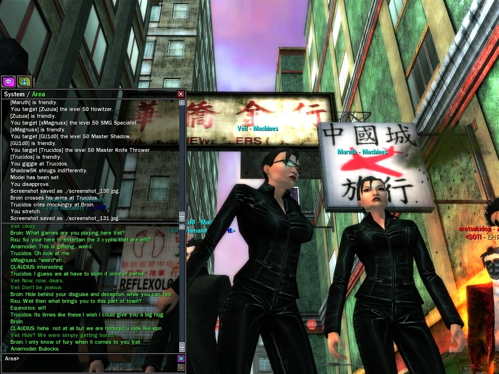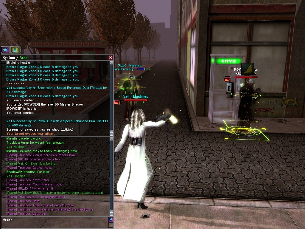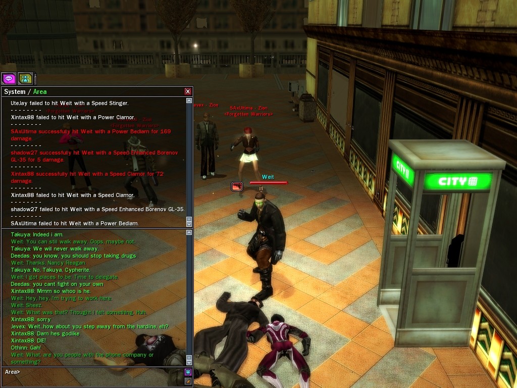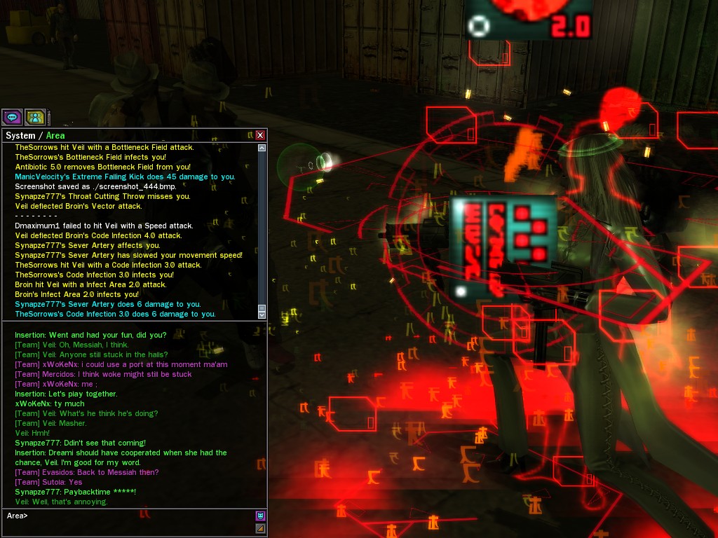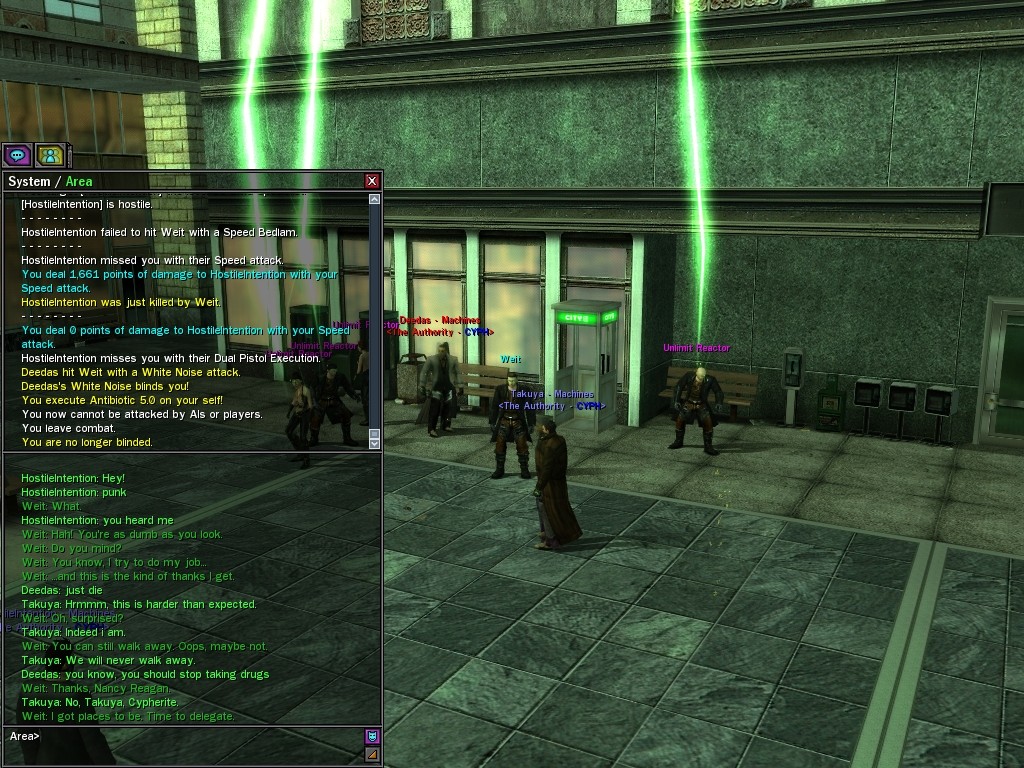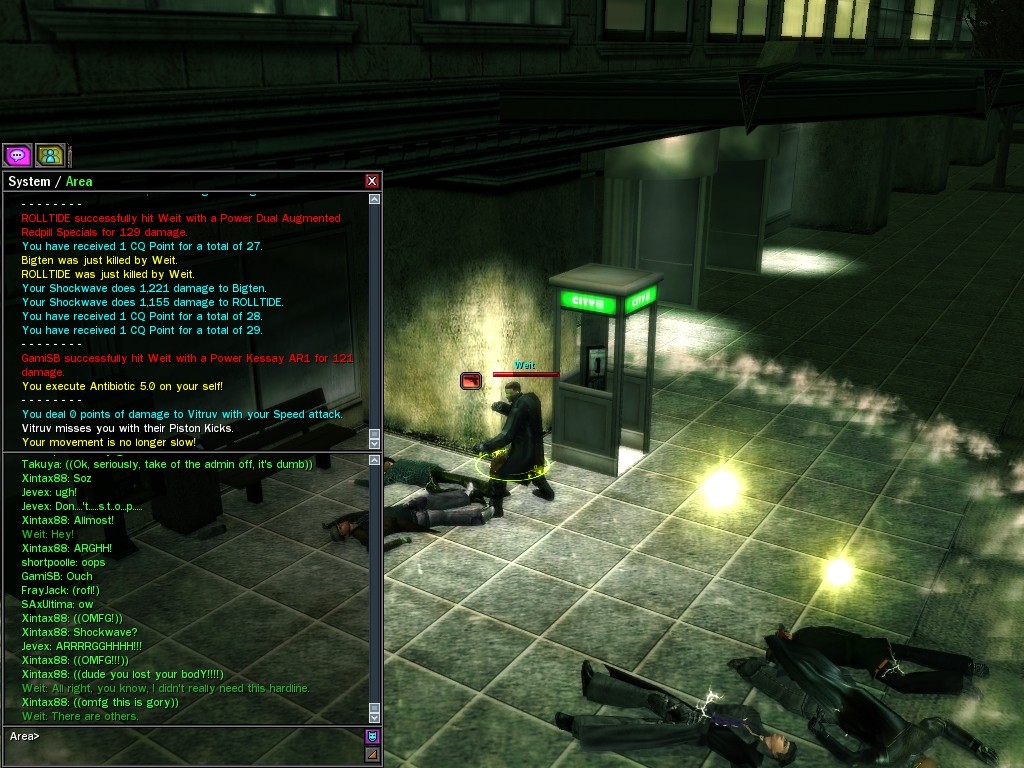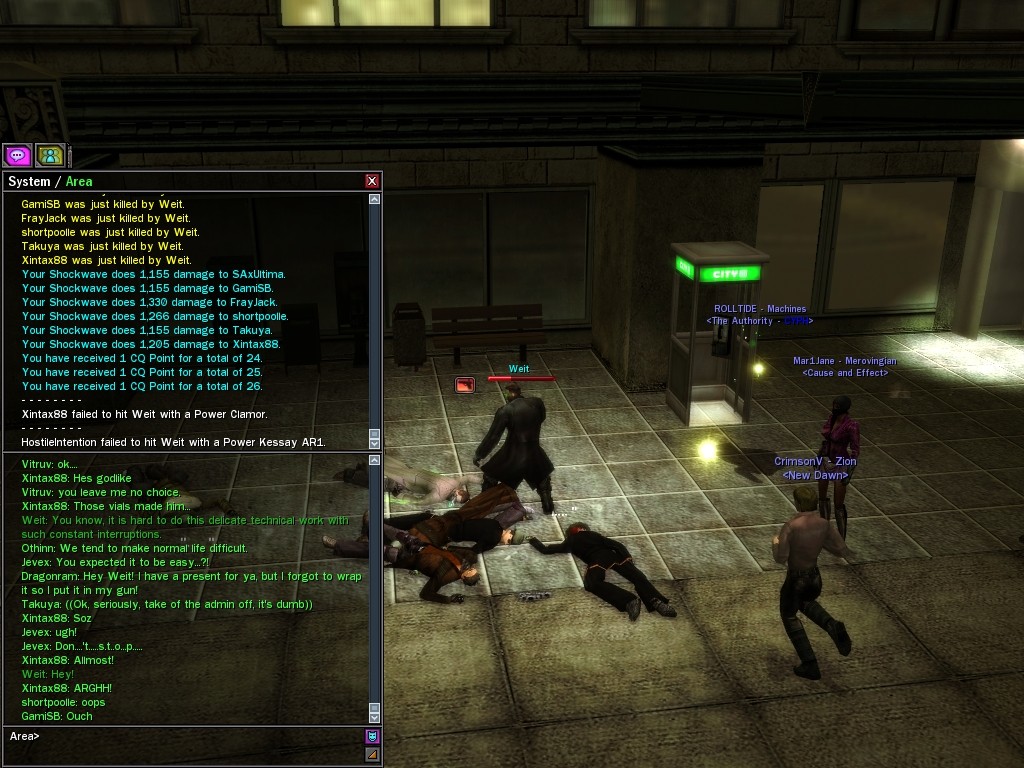 My dears, Anome's man, Weit, showed up in Downtown just the other day, mucking about with hardlines. He was able to rewire a few before operatives could stop him, and when that happened, immediately afterwards a whole truckload of his men would port in through the line, clearing out the whole area. Fortunately, we got wise to him, and pretty soon he found that he didn't quite have the leisure he needed to rewire the phone booths. He ran off in frustration, leaving a trail of high-powered soldiers across northwestern Downtown. Not to worry, though! They were soon cleared up. And I'm sure we'll get Weit pretty soon, too, unless he wises up (which seems awfully unlikely). Kisses! Veil