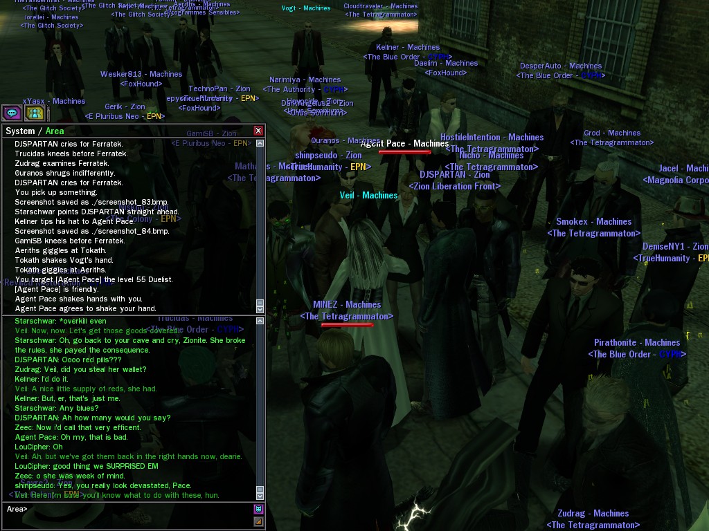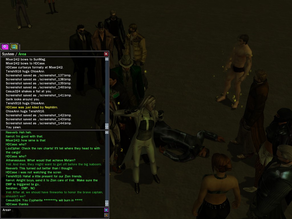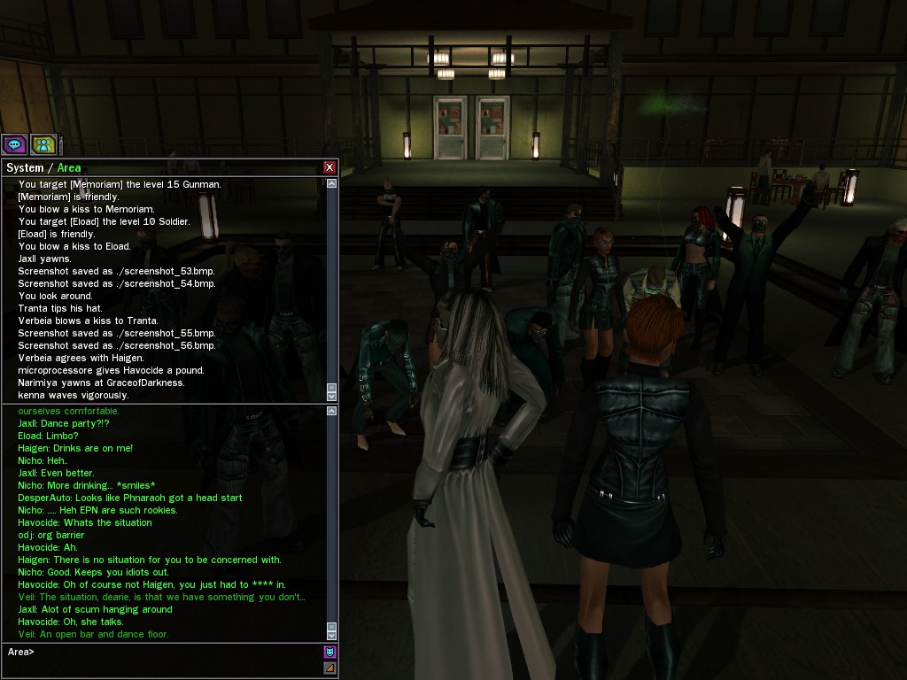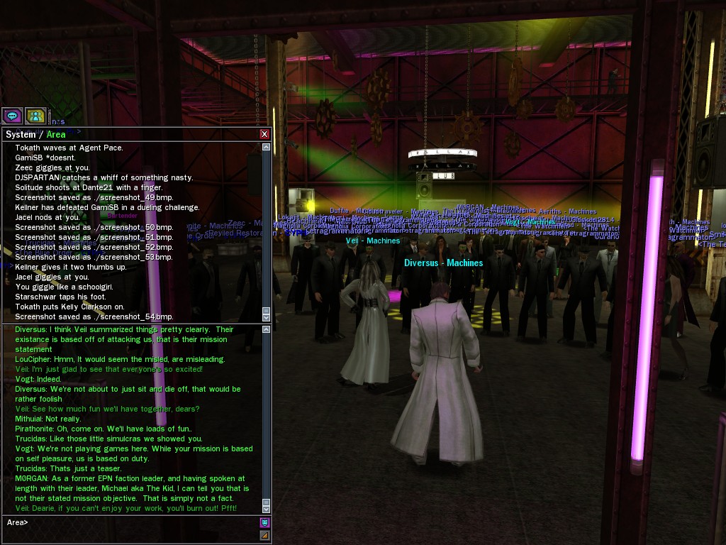 After snacking on some small fry, Evasidos, Mercidos, and I just happened to stumble across a big drum-beating held by those annoying EPN people down by the wharves. Their cute little new officer was there, and everything! Now, we certainly couldn't pass up a chance like that to put in a word or two, and I think we succeeded in livening up their evening a wee bit.
