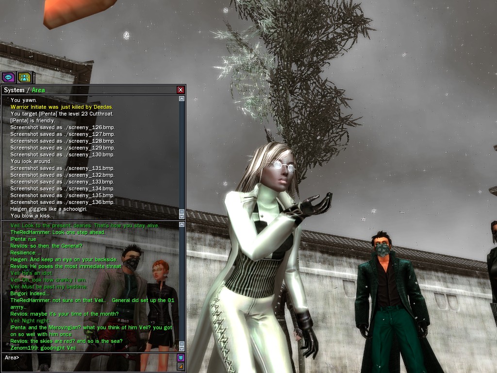 Well, dearies! A few of us were lucky enough to have a night out on the town with our new liaison officer, Maruth! And what a time we had, clearing those pesky EPNs off the public telephones! We just won't stand for this kind of disturbing the peace in our town, no sir! Some dull Zionites showed up, but we played a little joke on them to give them the slip. It was a close call, though--they almost bored us to death! Have fun with Maruth, sweeties! 'Til next time, xoxox Veil