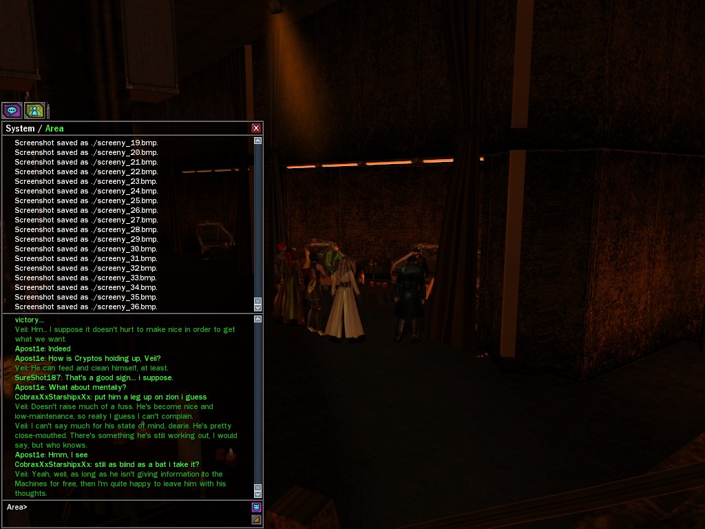 The crew of the Solstice, that sap Sarv's old ship, is now sleeping snug in their bunks once again. Zion didn't like the idea of them trying to defect to us, but that wasn't about to stop us from bringing them home, was it, dearies? A pill party in Sphinx made a nice little distraction while a few of us went and snapped them up. Sweet dreams! ~V~e~i~l~