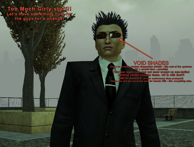 ----------------------------------------------------------------------------------------------------------------------------------------------------- Now for the other stuff:  Void Shades! They are so much better than those big fat, old-grandpa, blockers. But none come with buffs, they are only avalible as non-buffed eyewear for guys from some meager clothing vendors. That's pooey - always has been.