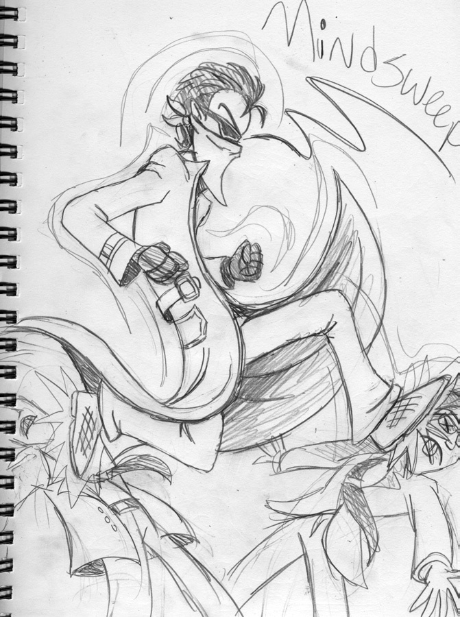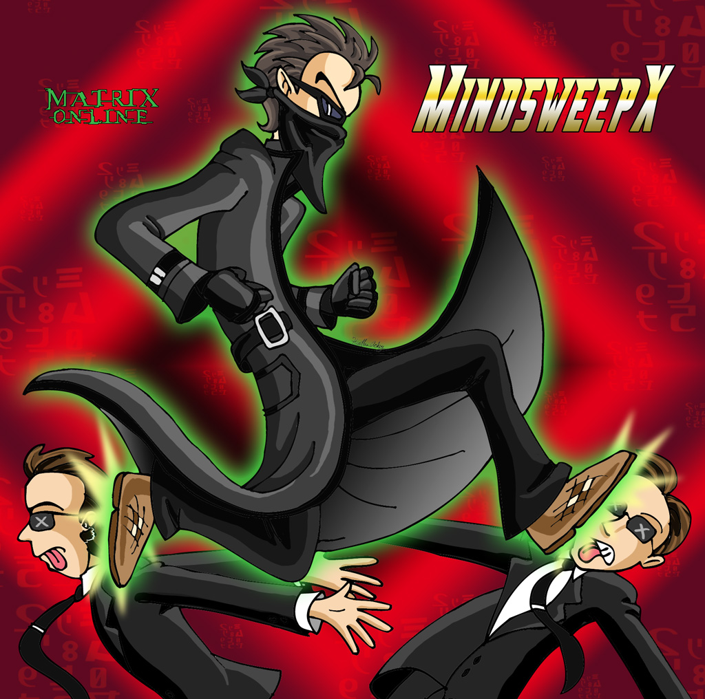 Sketches, all cleaned up and stuff. The finals coming real quick. I think the toughest part is thinking of the poses and the expression to put each person in. Everyone has their own expression for their character, or what they want to be in the Matrix - so that's the most challenging thing. I was re-watching Matrix Re-Loaded to get some screenshots, and I was inspired to use a pose For Mindsweepx:  Mindsweep pulling a "Neo" move. It was a move I saw in Reloaded, where Neo fights the 3 Agents after Smith gstops by that underground meeting to drop off the earpiece. darn ... no eyelasers. He's awesome at fighting s I figured that Neo jump would suit Mindsweepx best. The outfit I had pictures of Mindsweep in was kind of a Neo-ish outfit, so the idea fit.