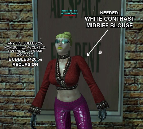 Heehee, don't worry Mr. Greeny-Jeans, I got your picture coming right up. Along with a couple of others. I just wanted to get these up real quick. ------------------------------------------------------------------------------------------------------------------------------------------- Oh, I'm really looking for a certain style of blouse - I REALLY love the blouses in MxO. I dunno, they are pretty, sexy without being overly - how you say ... slutty? They are tastefully pretty. Some of the blouses are kinda Goth - the "Spider" ones are anyway - I like the flared sleeves, and they have a variety of styles and colors. But there is one that I am really looking for DH has a black Contrast Midriff Blouse on - but for my other characters, and probably DH also - I need more of them! I'm very much look in in particular on Recursion for a WHITE Constrast Midriff Blouse for Bubbles. So, here's the ad - kinda cross posted. If anyone can make one - lemme know! I'll see what kinda deal we can work out.  Bubbles is so silly - she's just funny ^.^