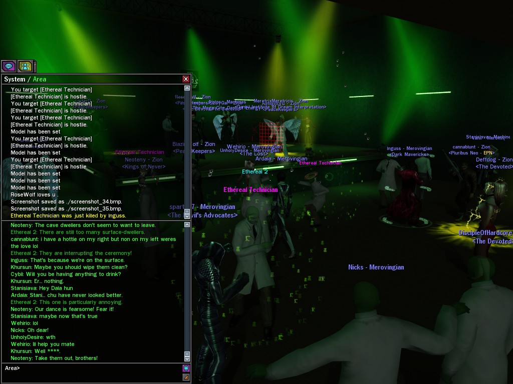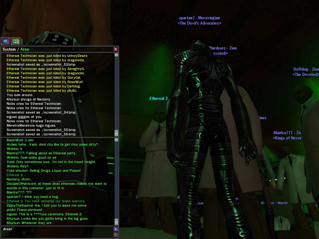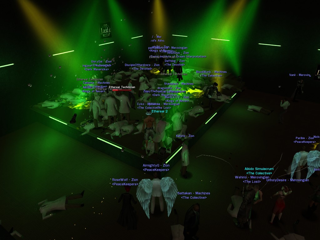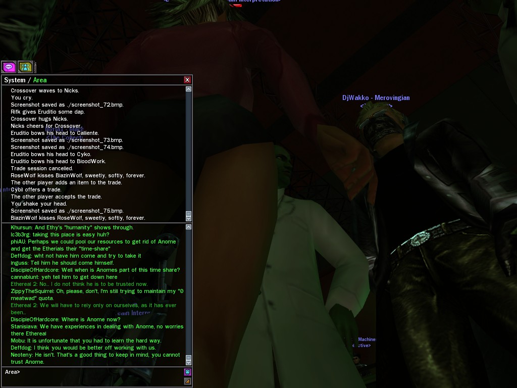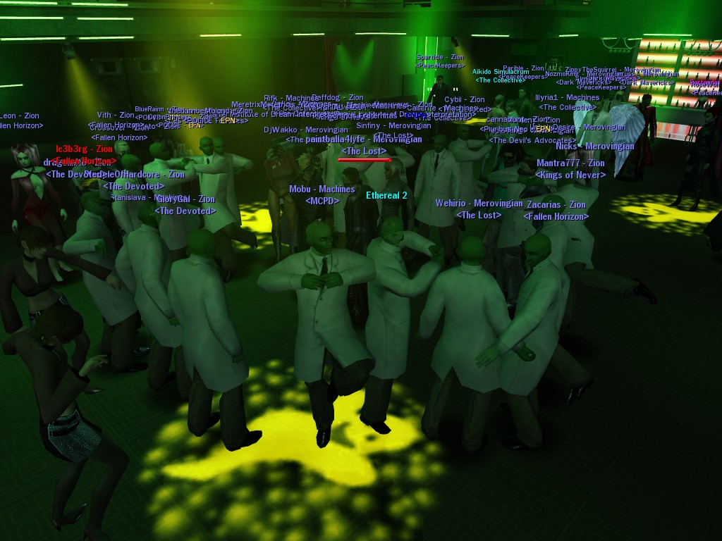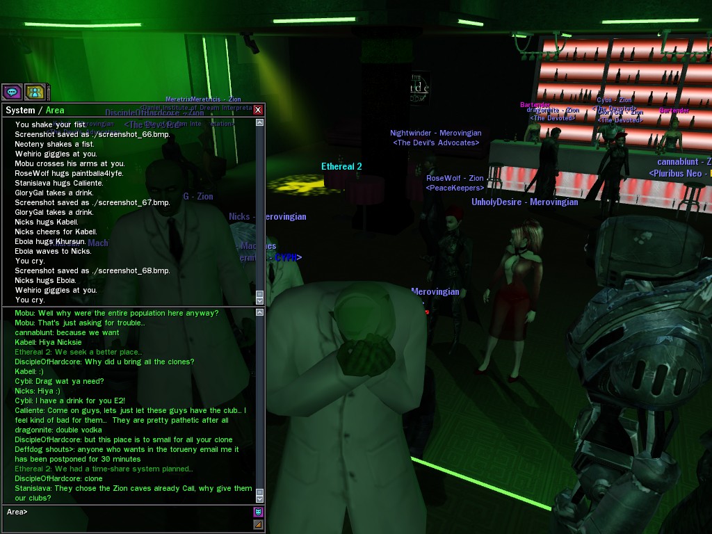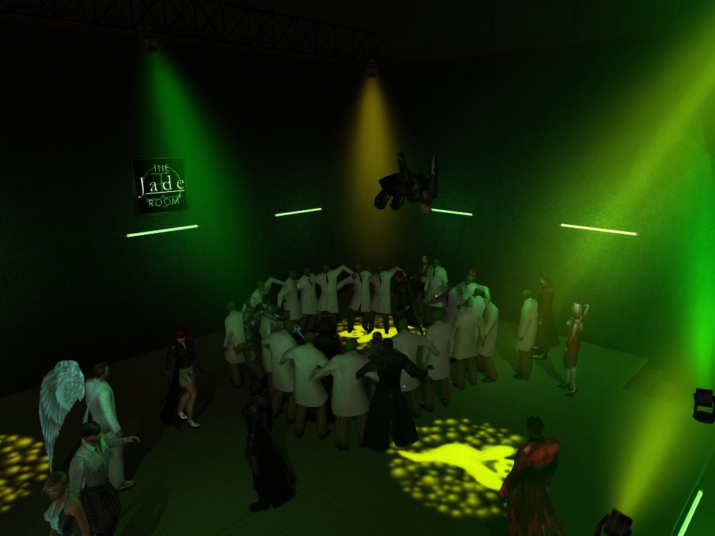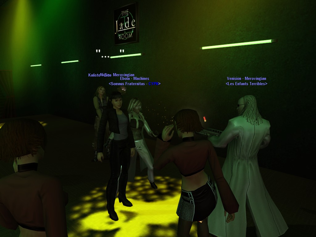 The leader of the reclusive Ethereals made a bold raid on Club Jade, apparently having been convinced by Anome that seizing it for his people would be an easy matter. A group of operatives who happened to be having a party there soon showed him the error of his ways. It is a sad day when even programs are fooled by the viper tongue of one of the worst examples of humanity this simulation has seen.