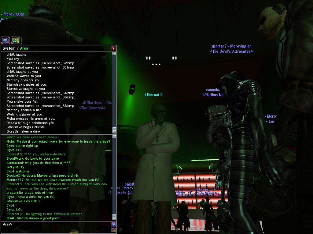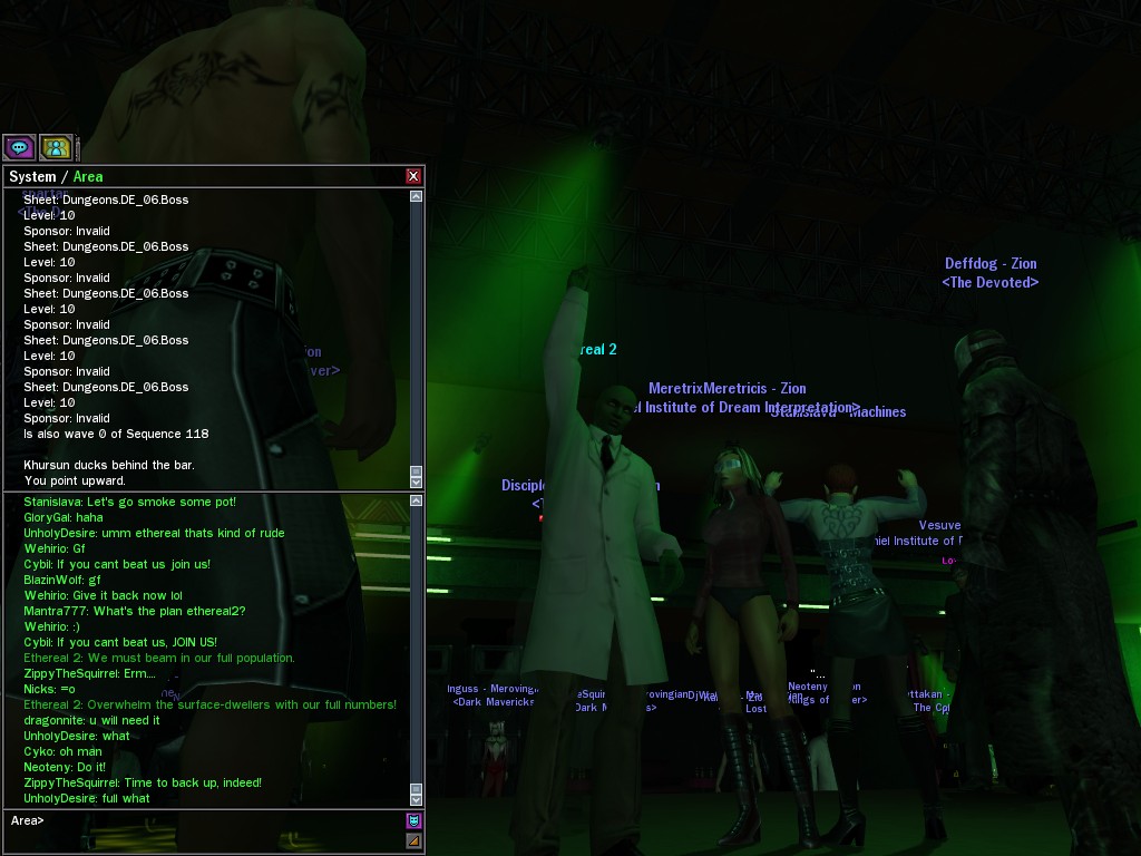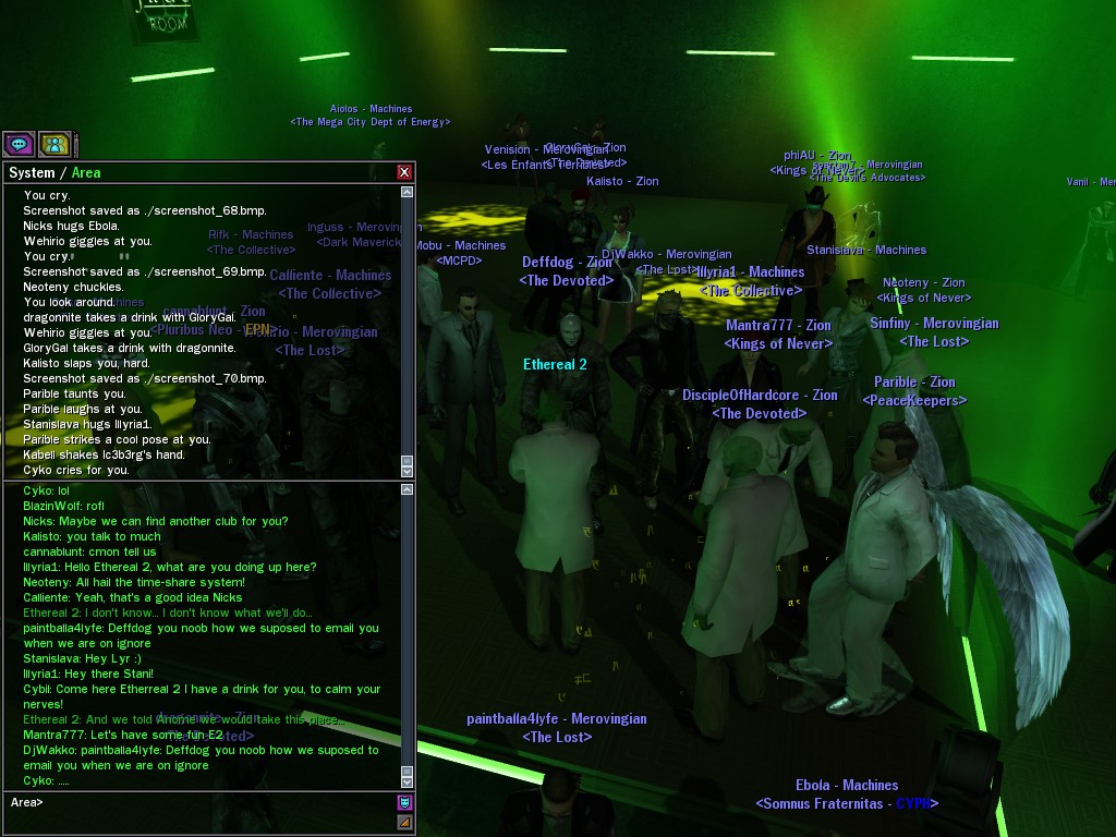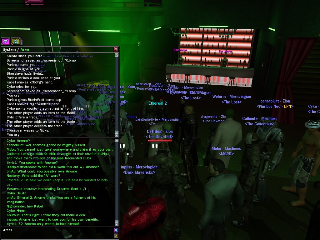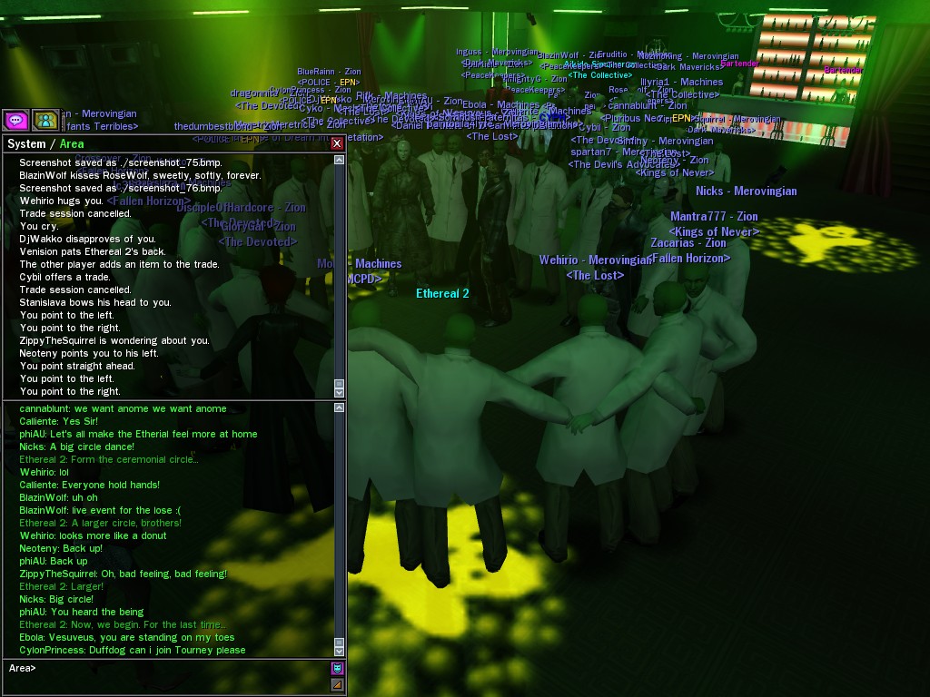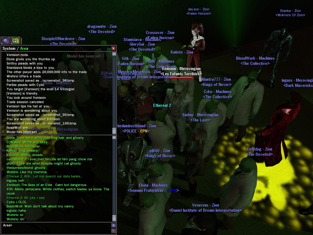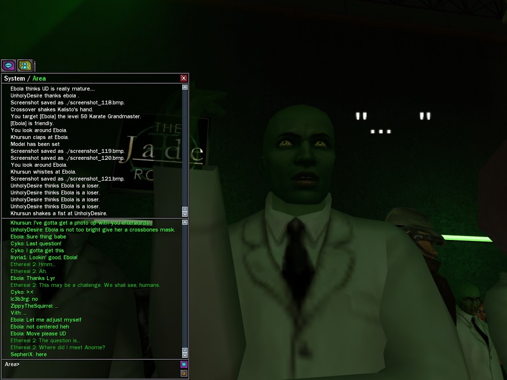 The leader of the reclusive Ethereals made a bold raid on Club Jade, apparently having been convinced by Anome that seizing it for his people would be an easy matter. A group of operatives who happened to be having a party there soon showed him the error of his ways. It is a sad day when even programs are fooled by the viper tongue of one of the worst examples of humanity this simulation has seen.