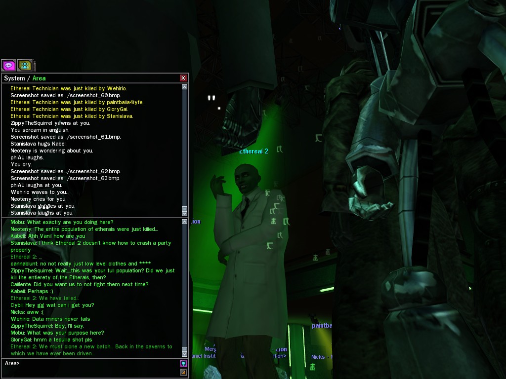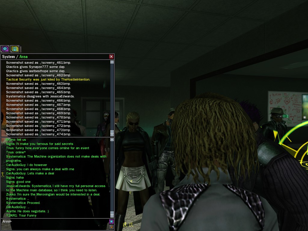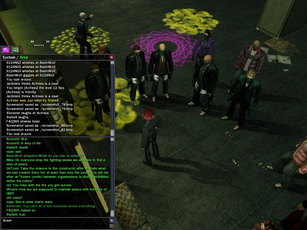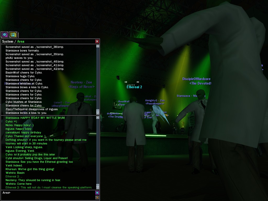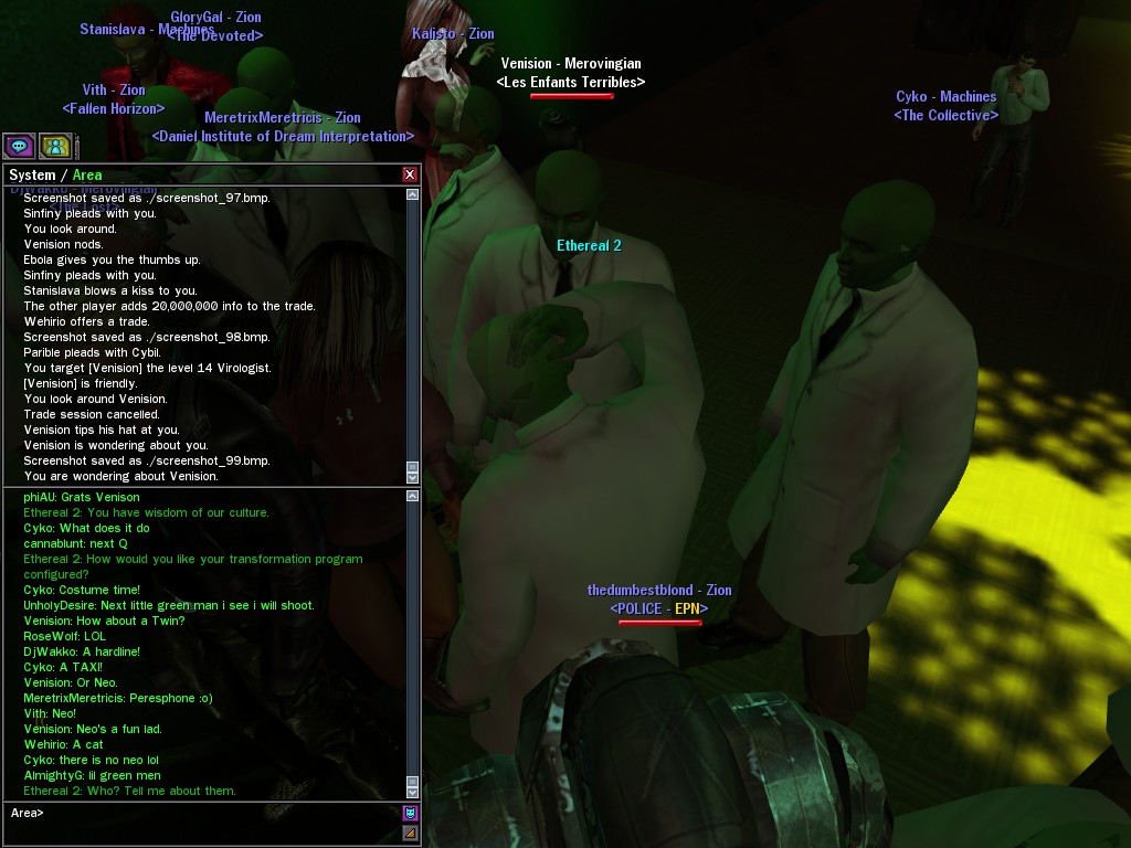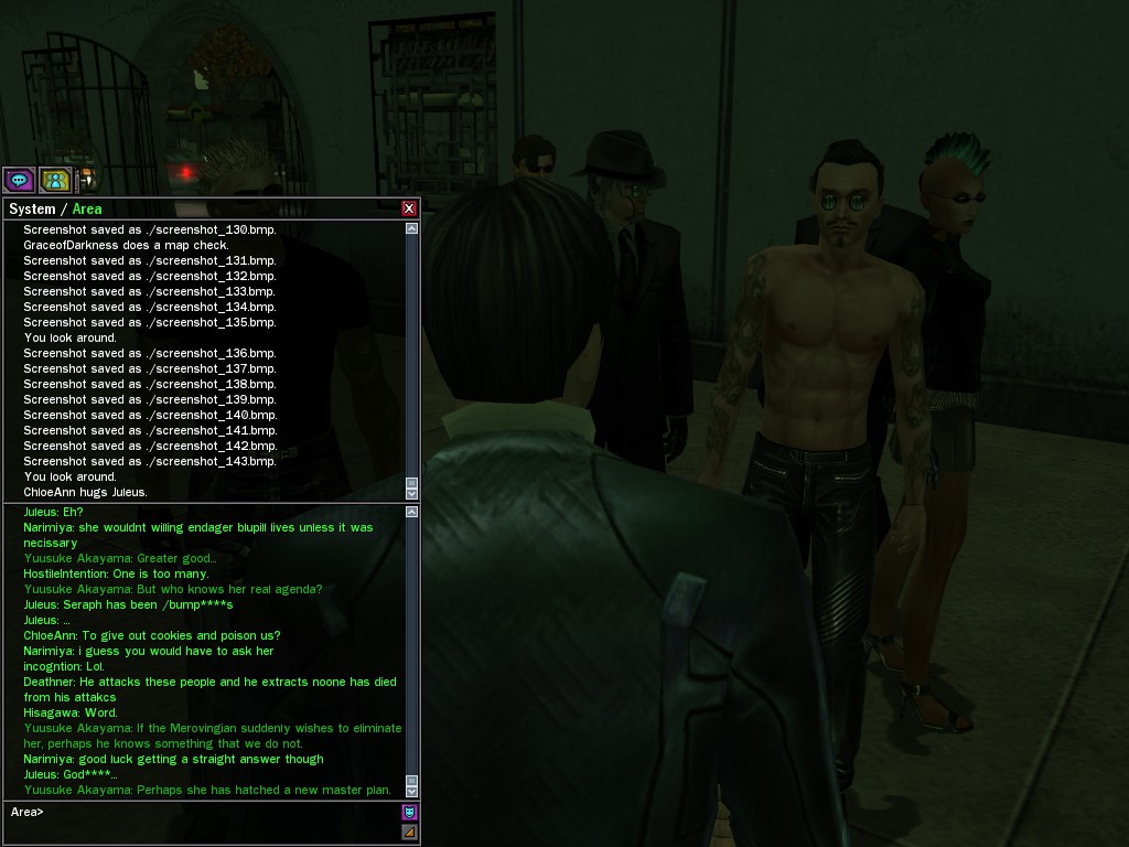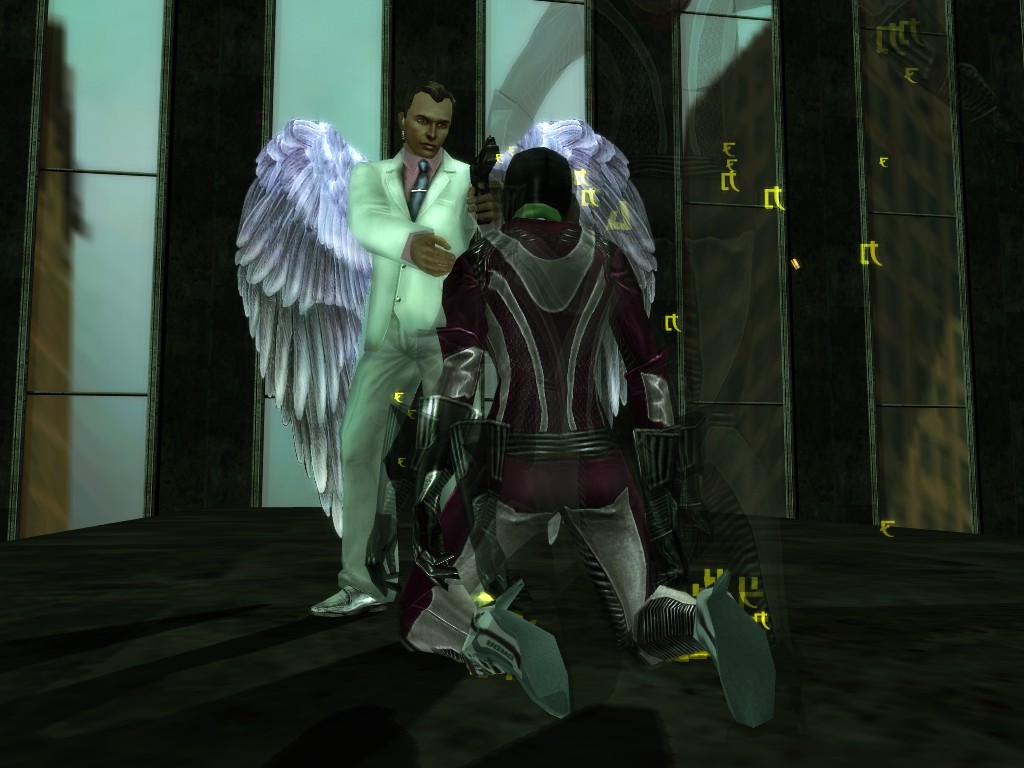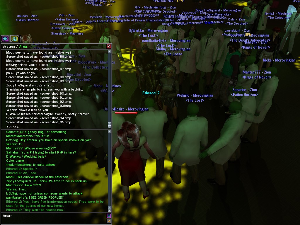 The leader of the reclusive Ethereals made a bold raid on Club Jade, apparently having been convinced by Anome that seizing it for his people would be an easy matter. A group of operatives who happened to be having a party there soon showed him the error of his ways. It is a sad day when even programs are fooled by the viper tongue of one of the worst examples of humanity this simulation has seen.