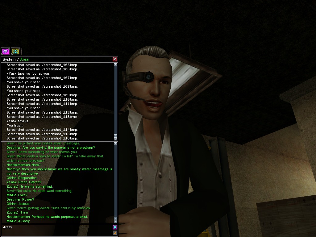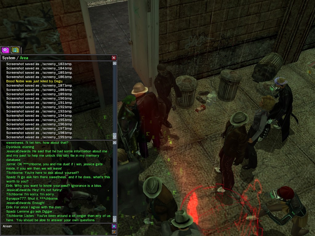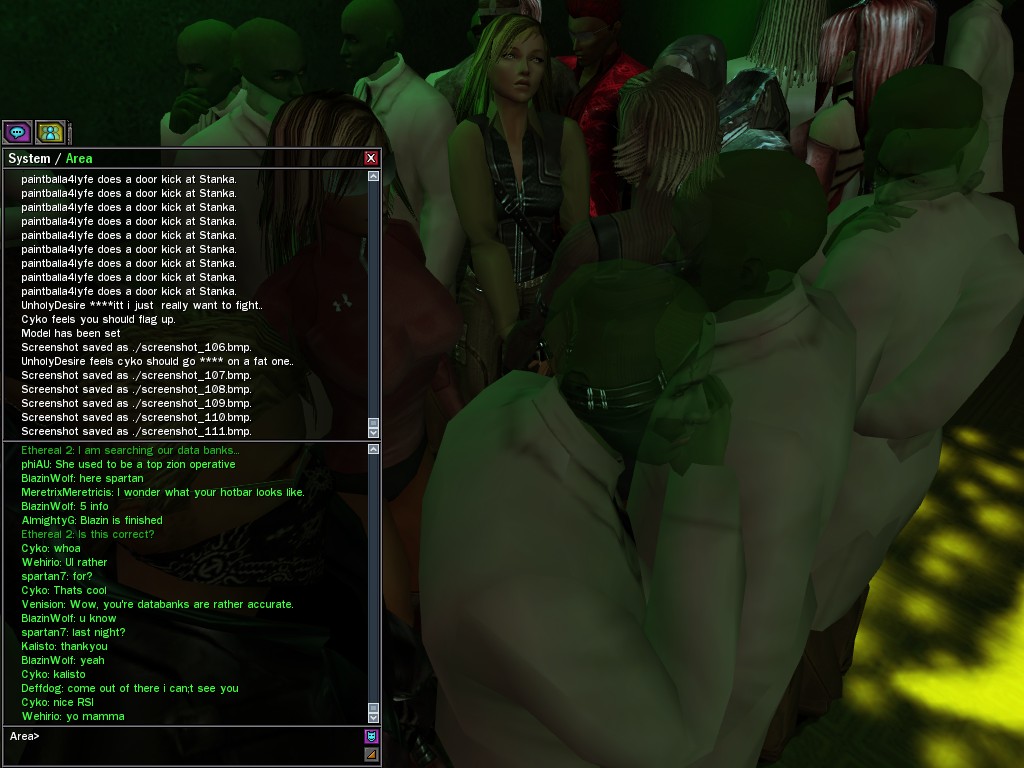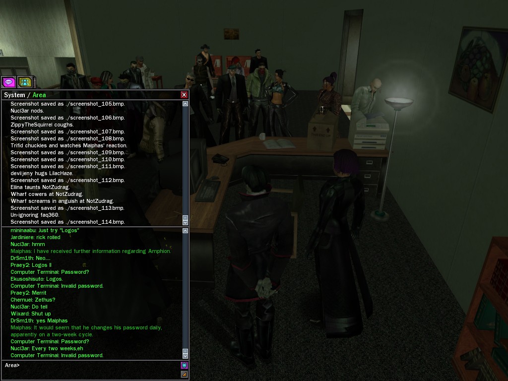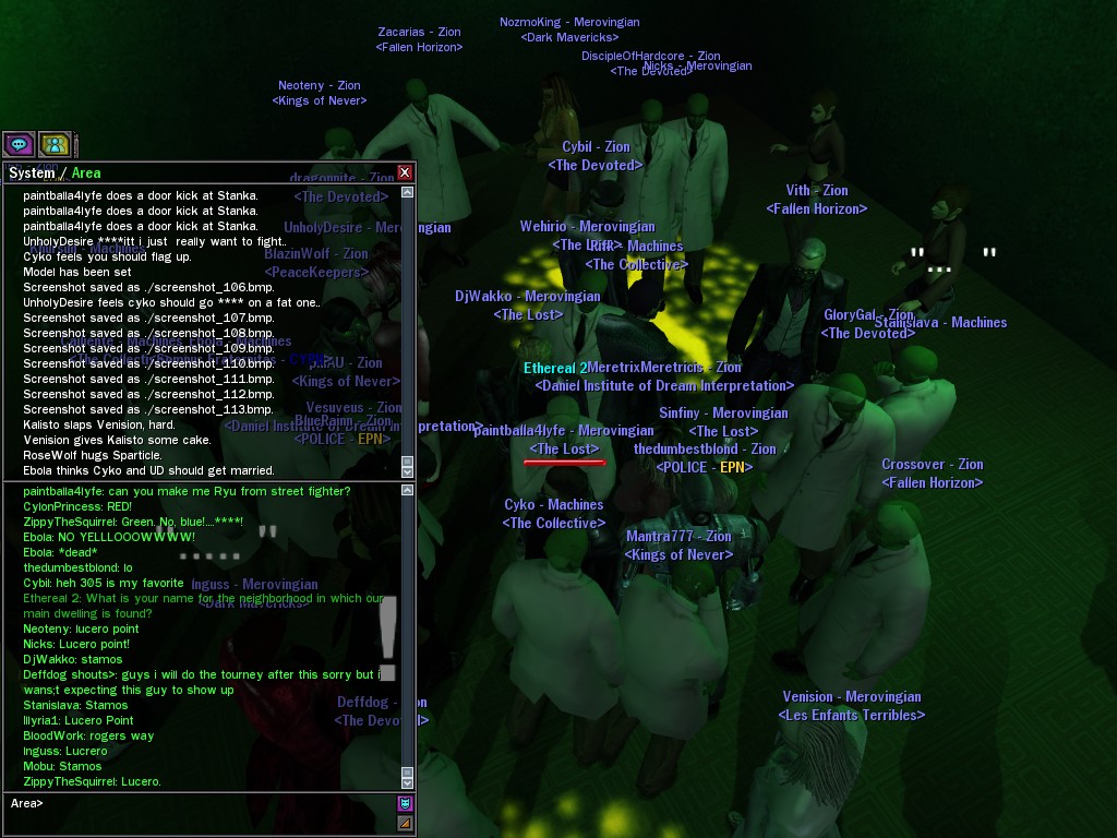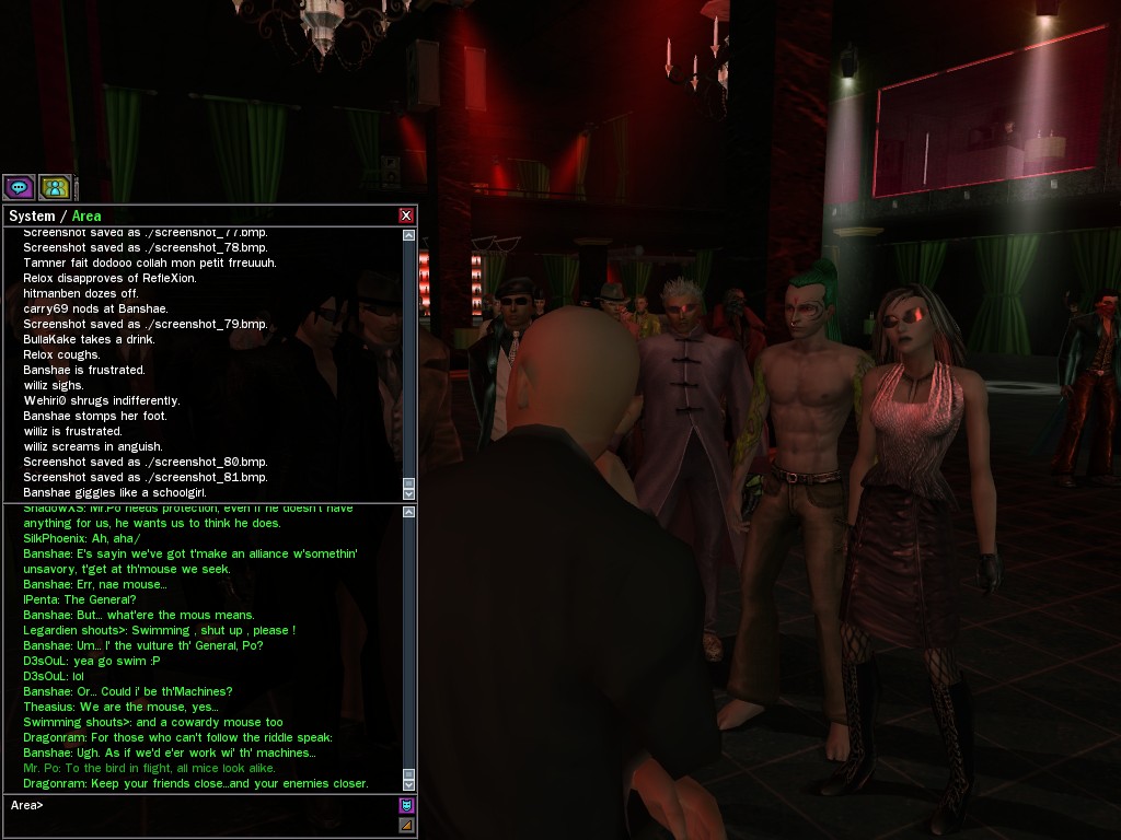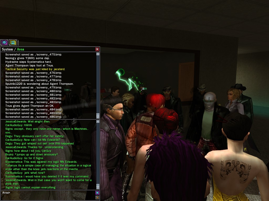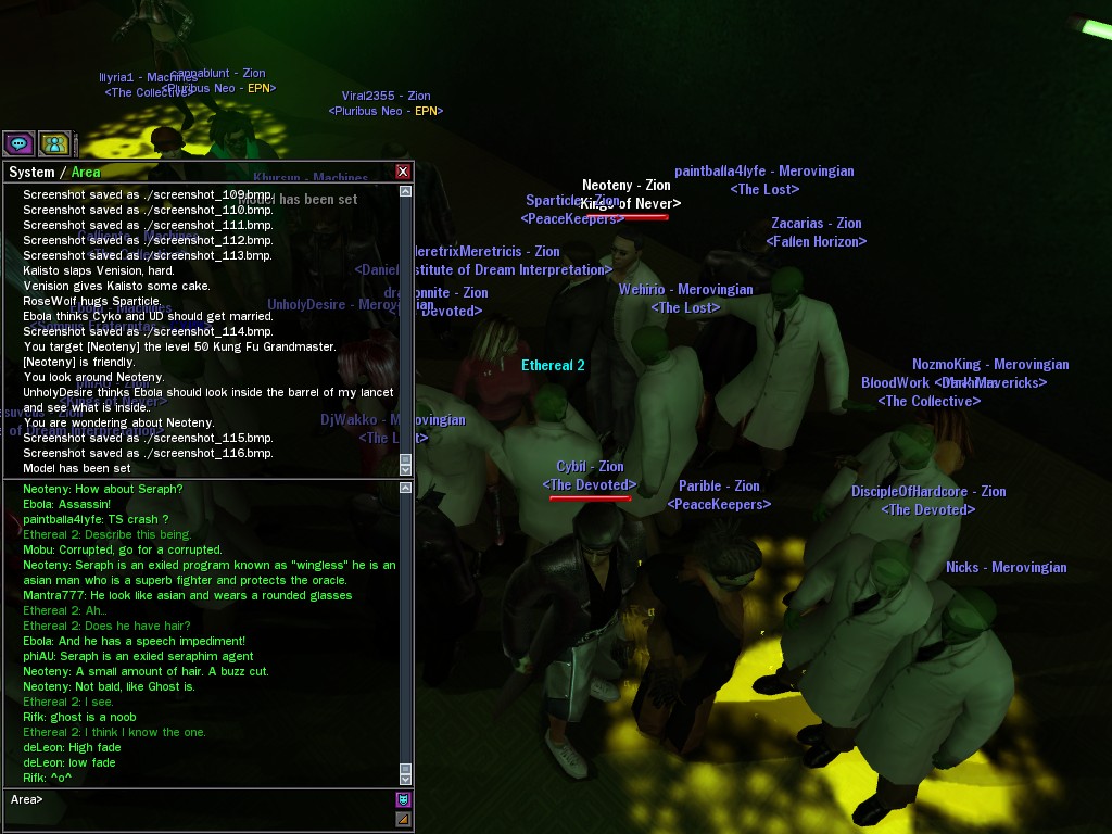 The leader of the reclusive Ethereals made a bold raid on Club Jade, apparently having been convinced by Anome that seizing it for his people would be an easy matter. A group of operatives who happened to be having a party there soon showed him the error of his ways. It is a sad day when even programs are fooled by the viper tongue of one of the worst examples of humanity this simulation has seen.