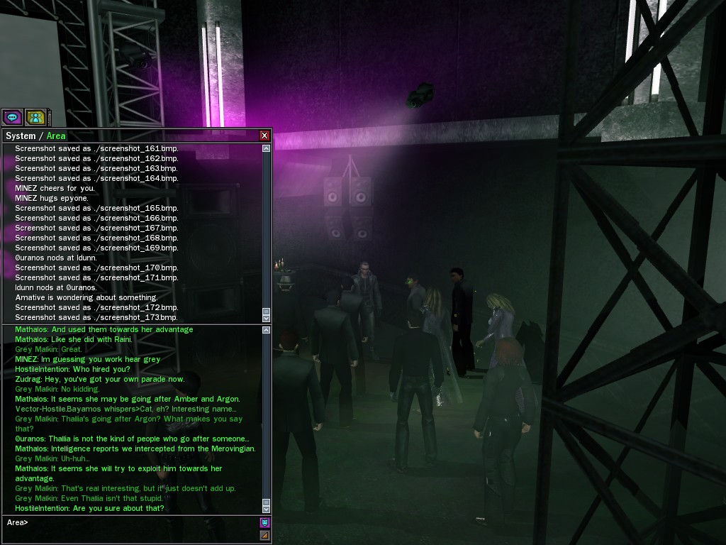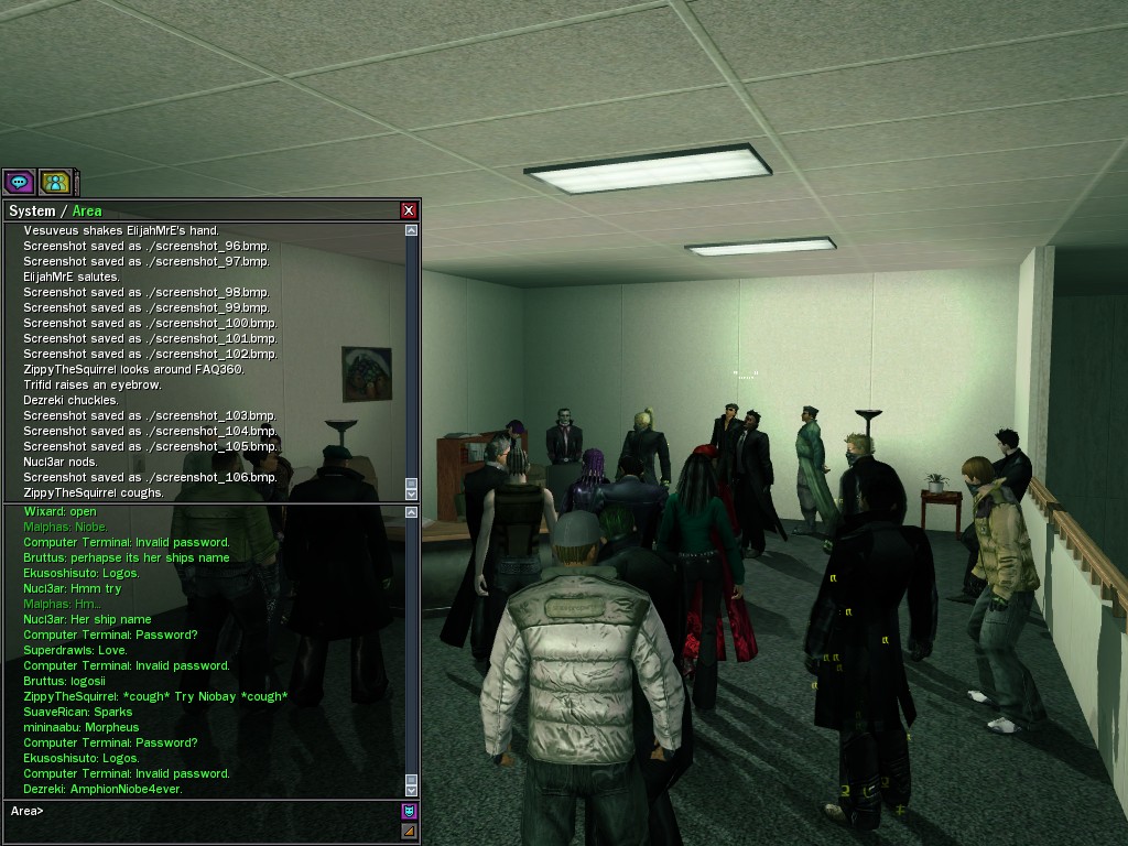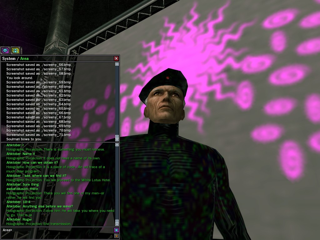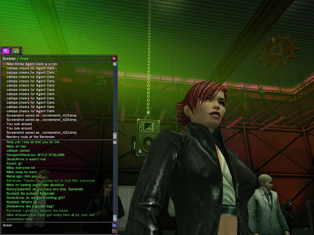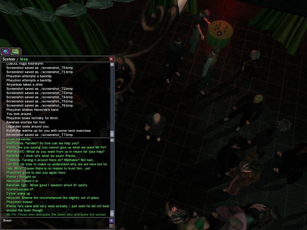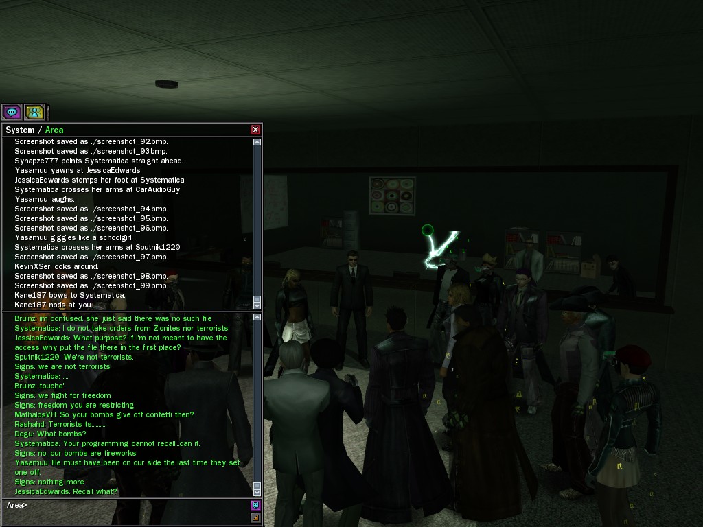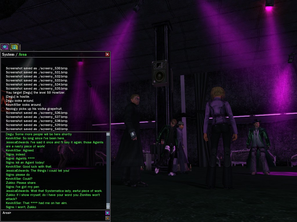 The leader of the reclusive Ethereals made a bold raid on Club Jade, apparently having been convinced by Anome that seizing it for his people would be an easy matter. A group of operatives who happened to be having a party there soon showed him the error of his ways. It is a sad day when even programs are fooled by the viper tongue of one of the worst examples of humanity this simulation has seen.