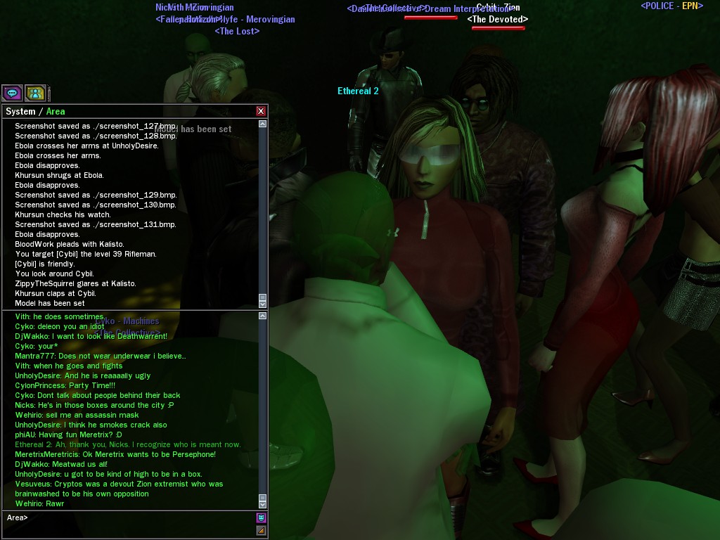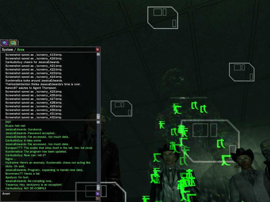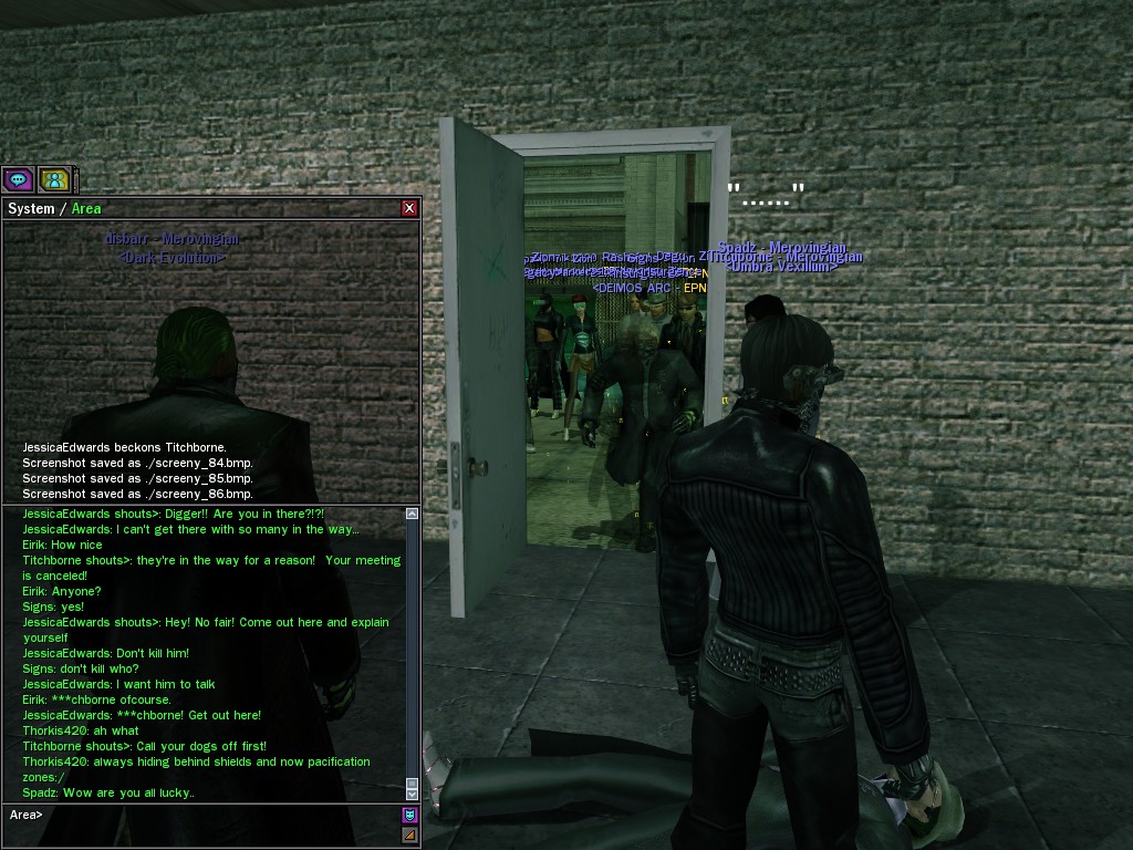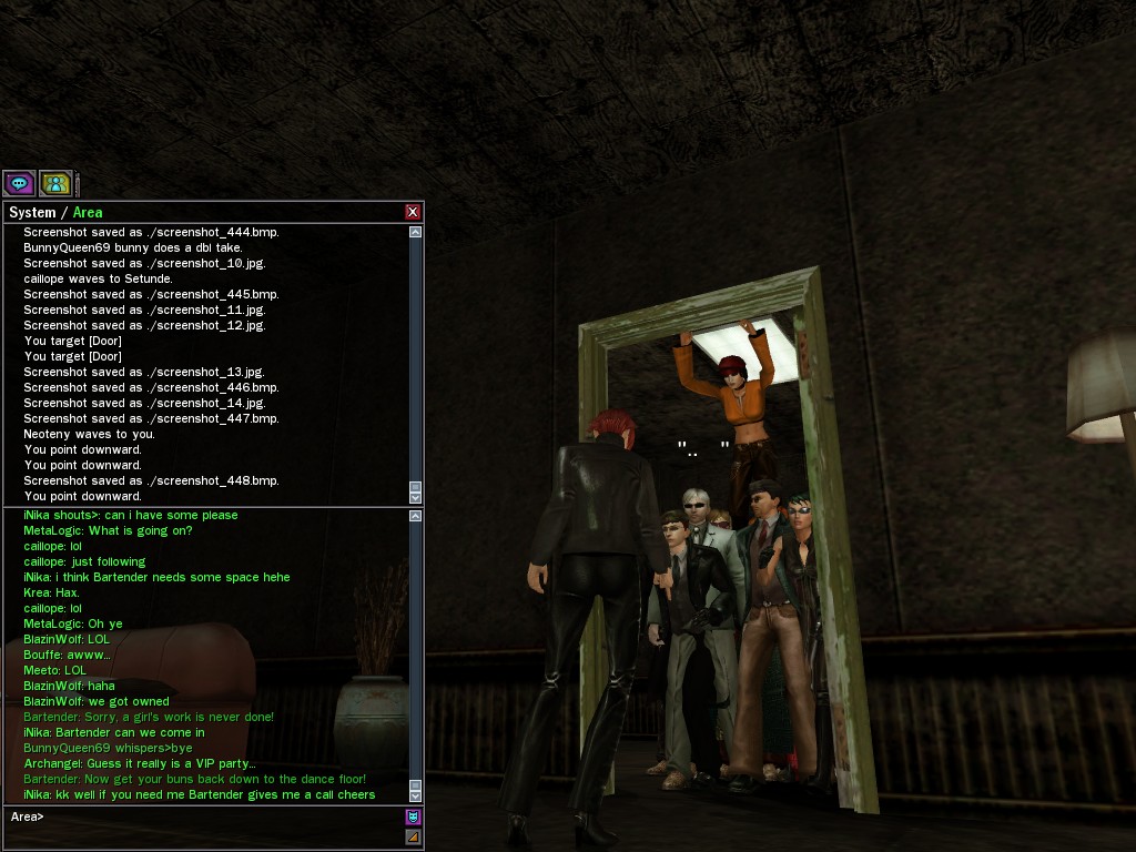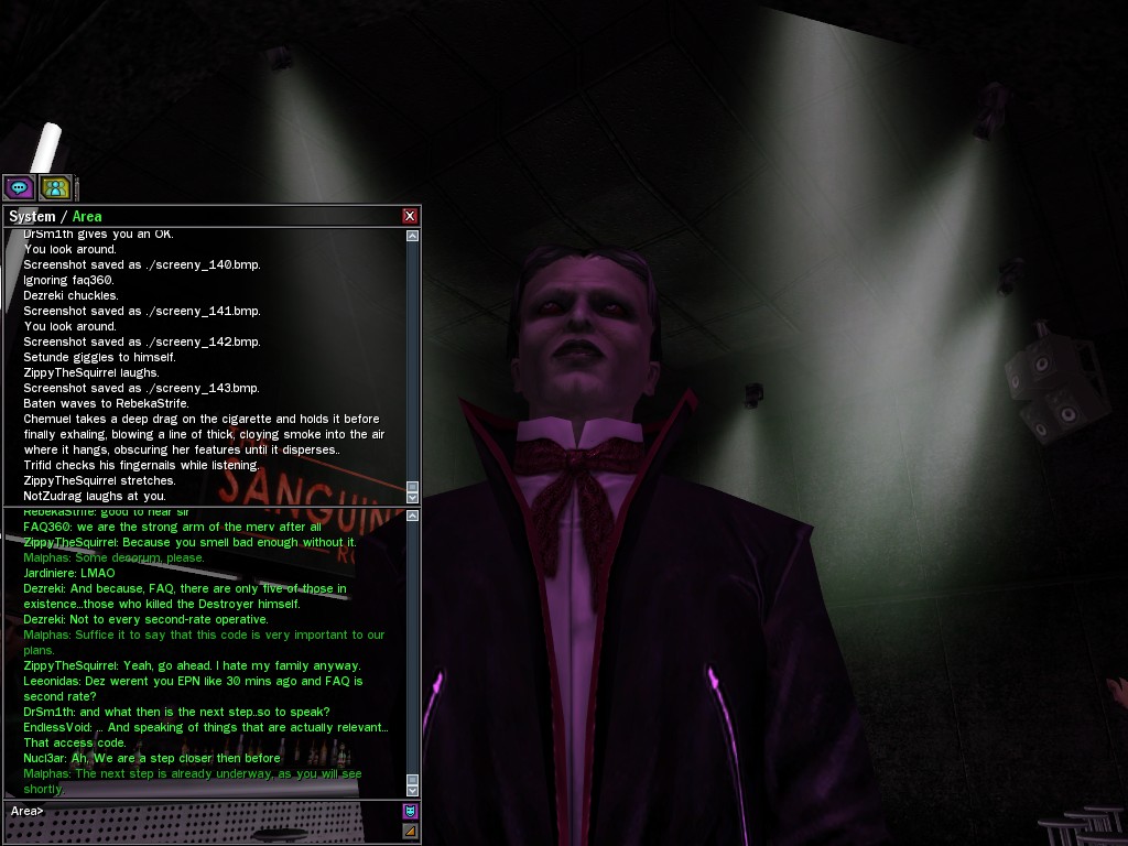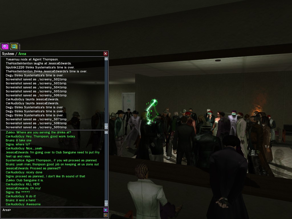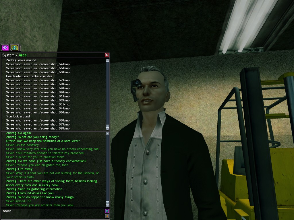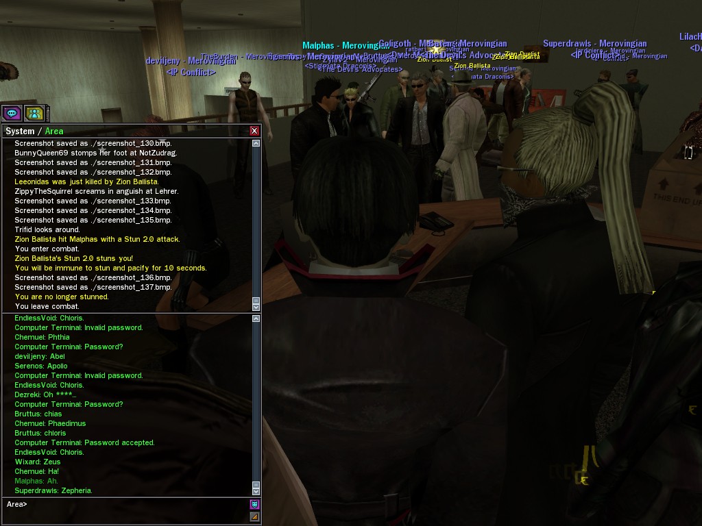 The leader of the reclusive Ethereals made a bold raid on Club Jade, apparently having been convinced by Anome that seizing it for his people would be an easy matter. A group of operatives who happened to be having a party there soon showed him the error of his ways. It is a sad day when even programs are fooled by the viper tongue of one of the worst examples of humanity this simulation has seen.