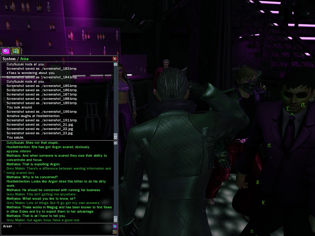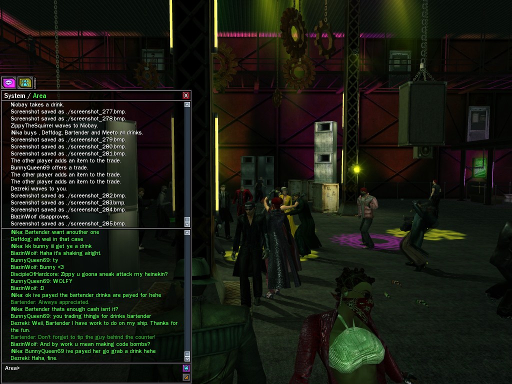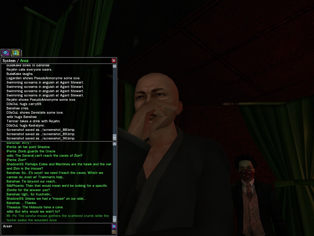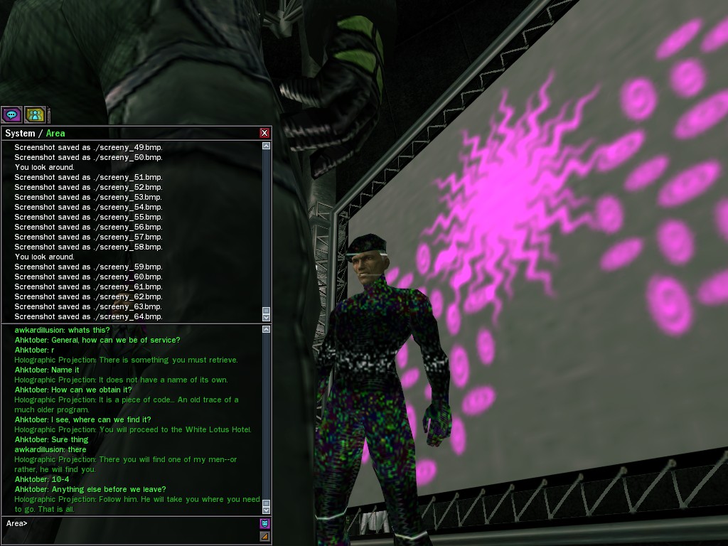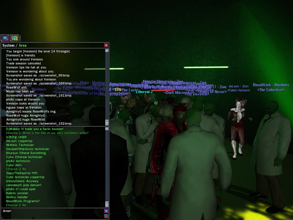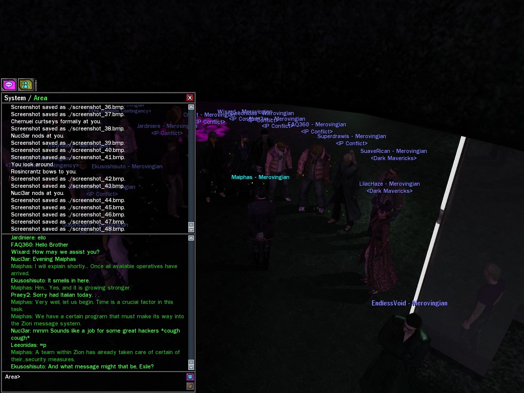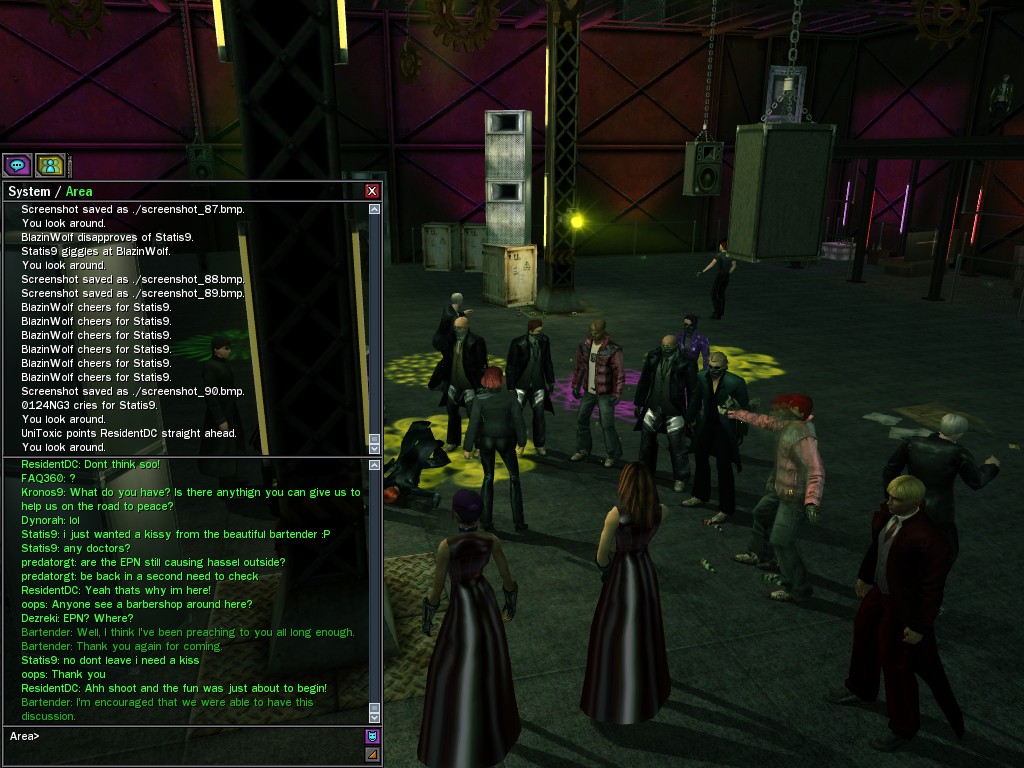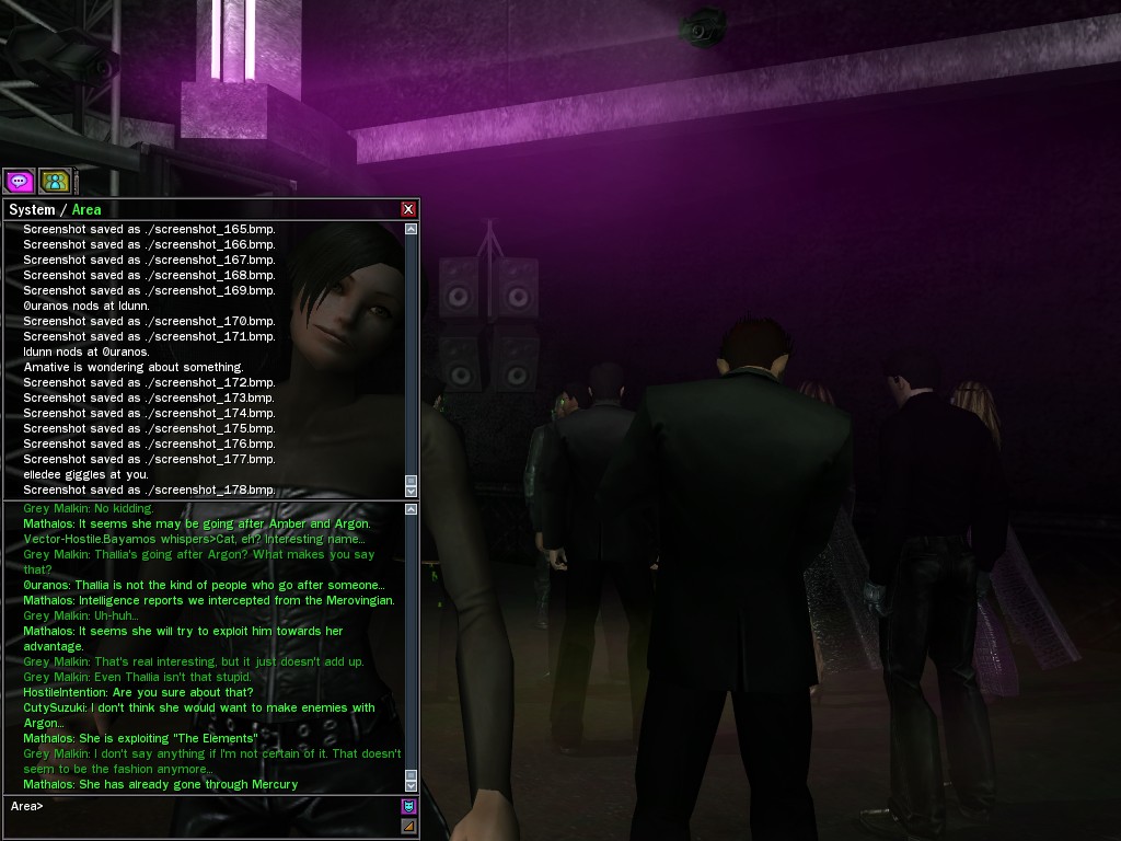 The leader of the reclusive Ethereals made a bold raid on Club Jade, apparently having been convinced by Anome that seizing it for his people would be an easy matter. A group of operatives who happened to be having a party there soon showed him the error of his ways. It is a sad day when even programs are fooled by the viper tongue of one of the worst examples of humanity this simulation has seen.