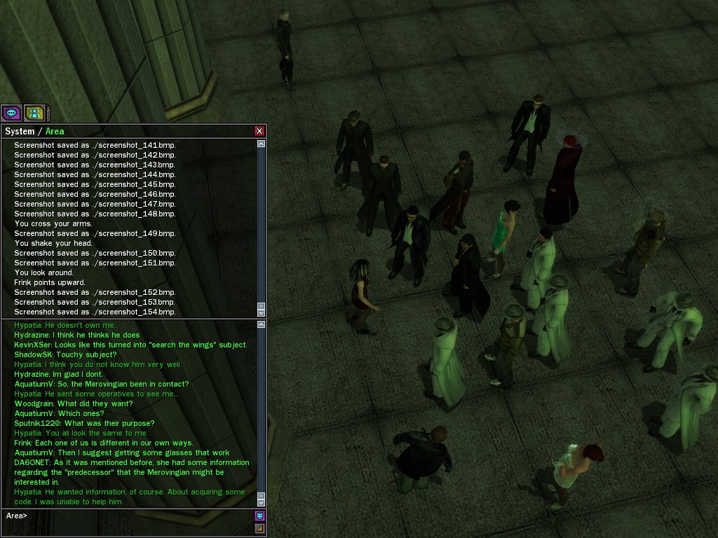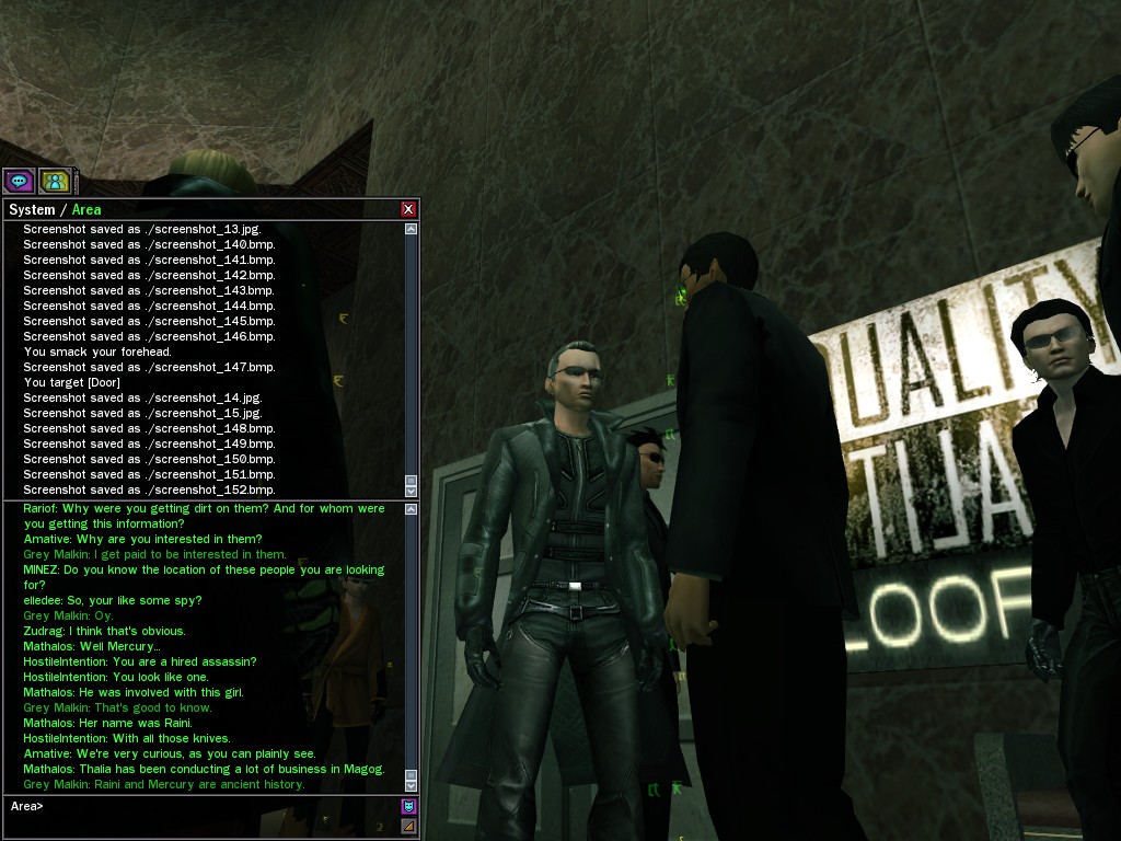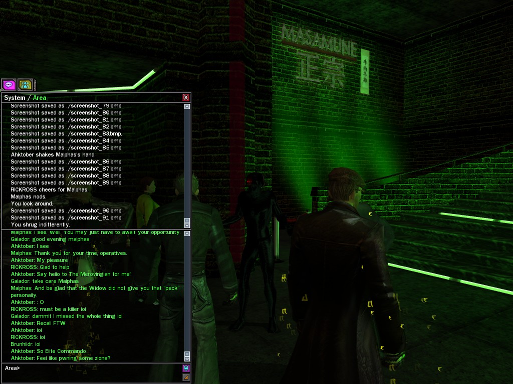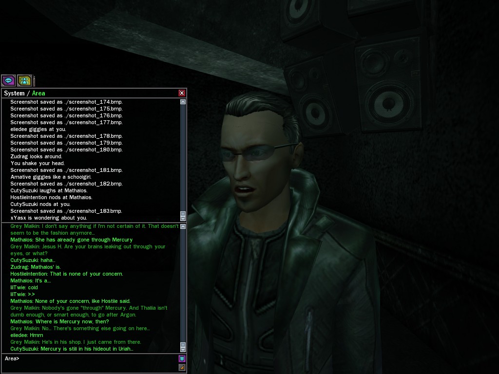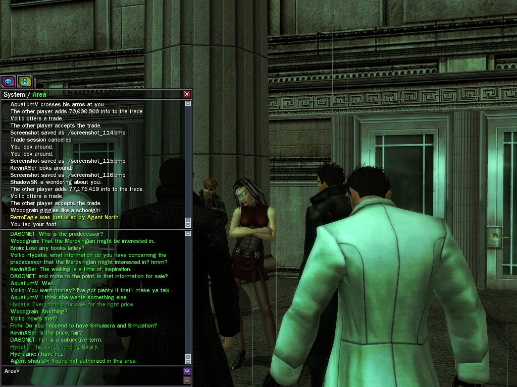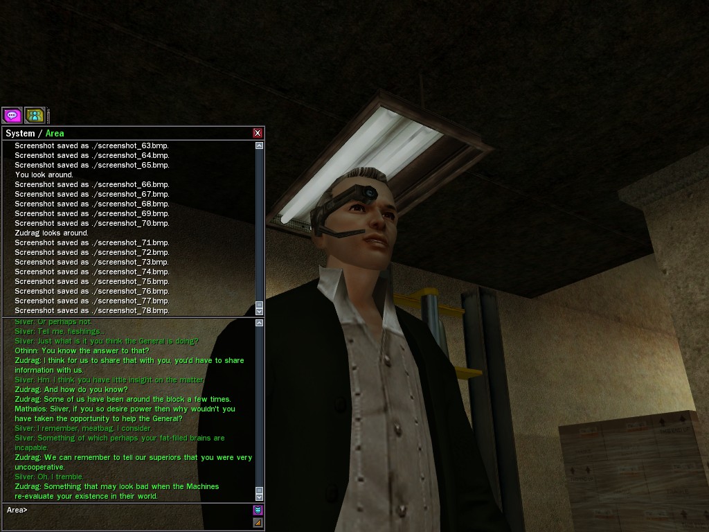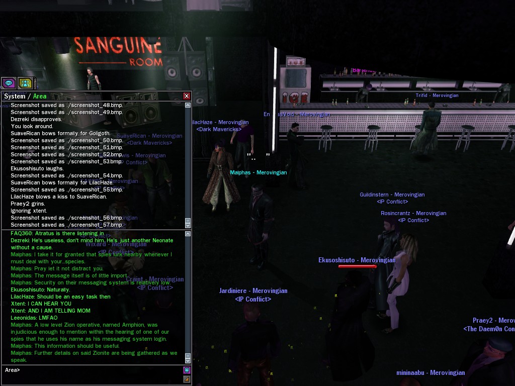 The leader of the reclusive Ethereals made a bold raid on Club Jade, apparently having been convinced by Anome that seizing it for his people would be an easy matter. A group of operatives who happened to be having a party there soon showed him the error of his ways. It is a sad day when even programs are fooled by the viper tongue of one of the worst examples of humanity this simulation has seen.