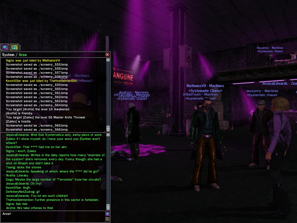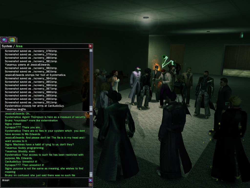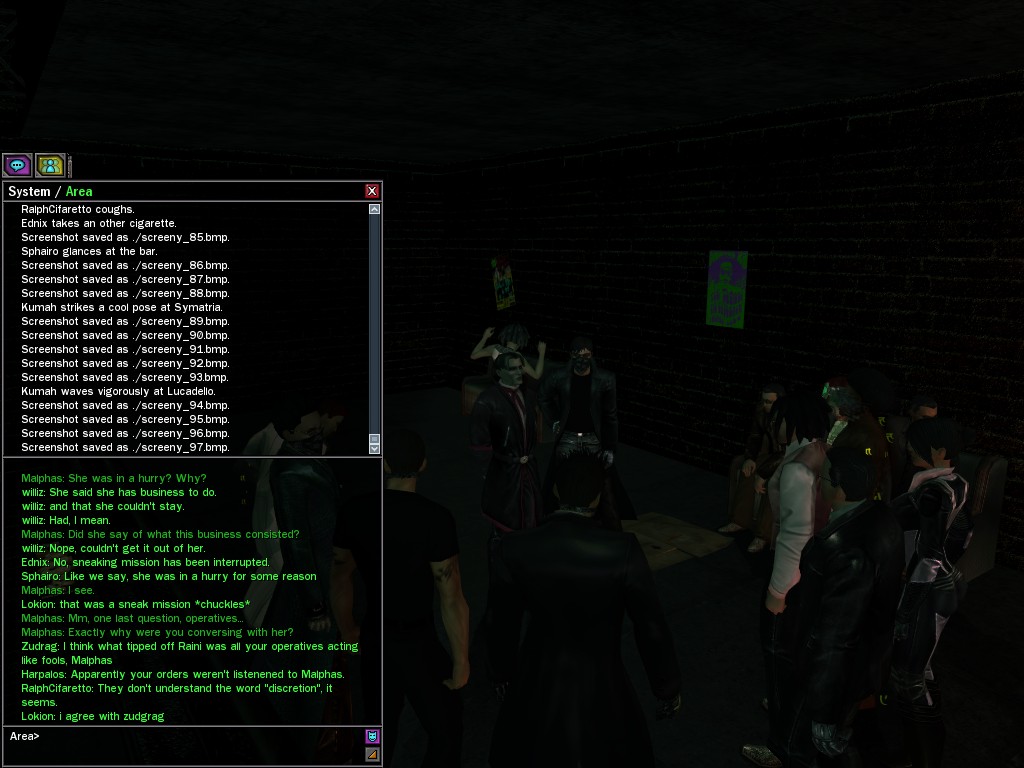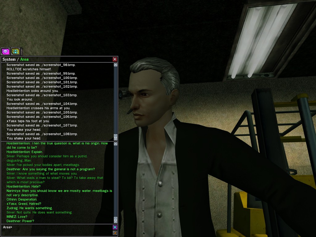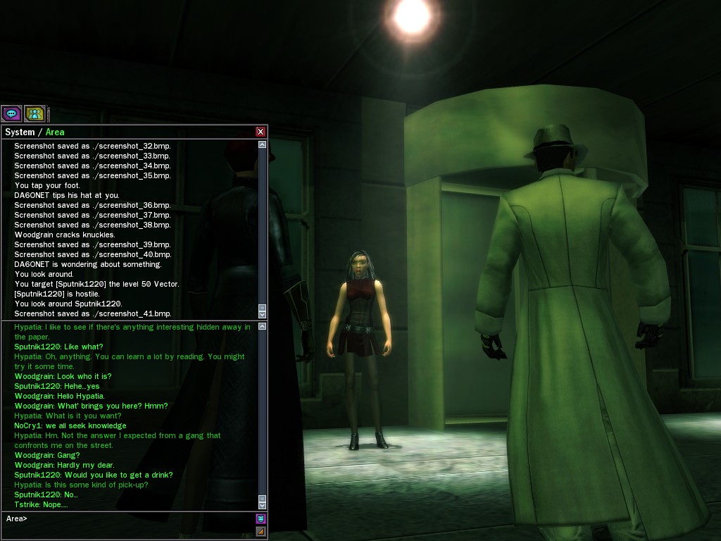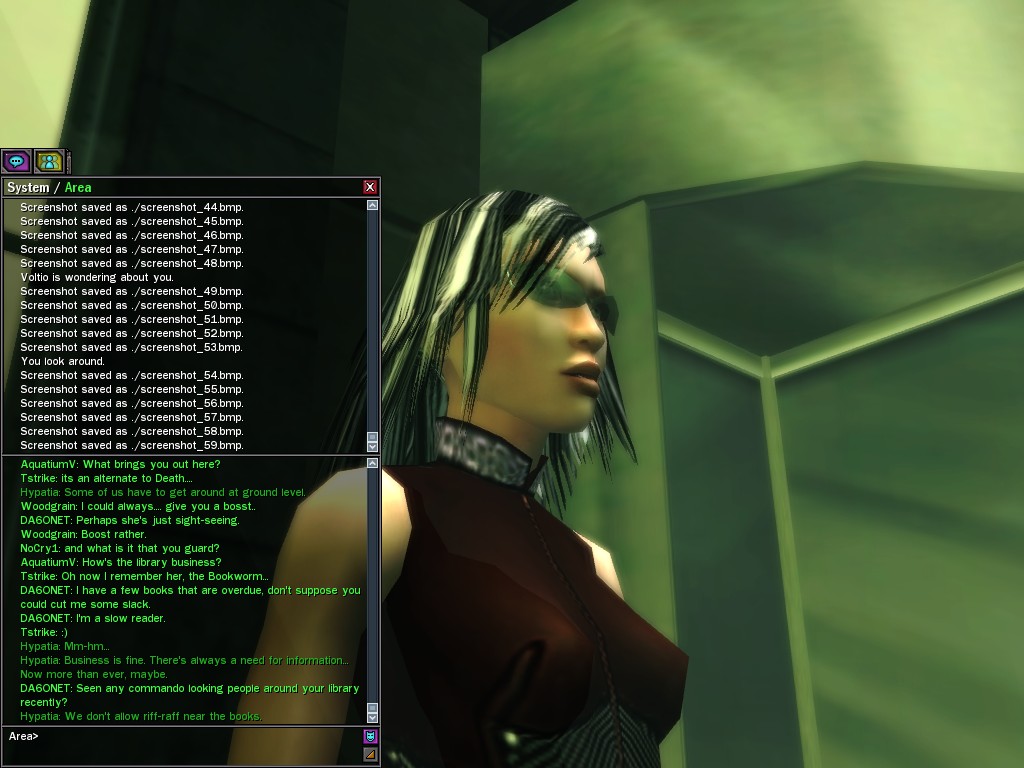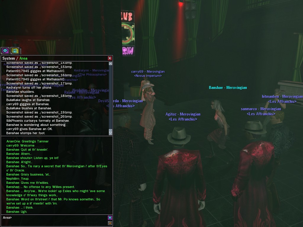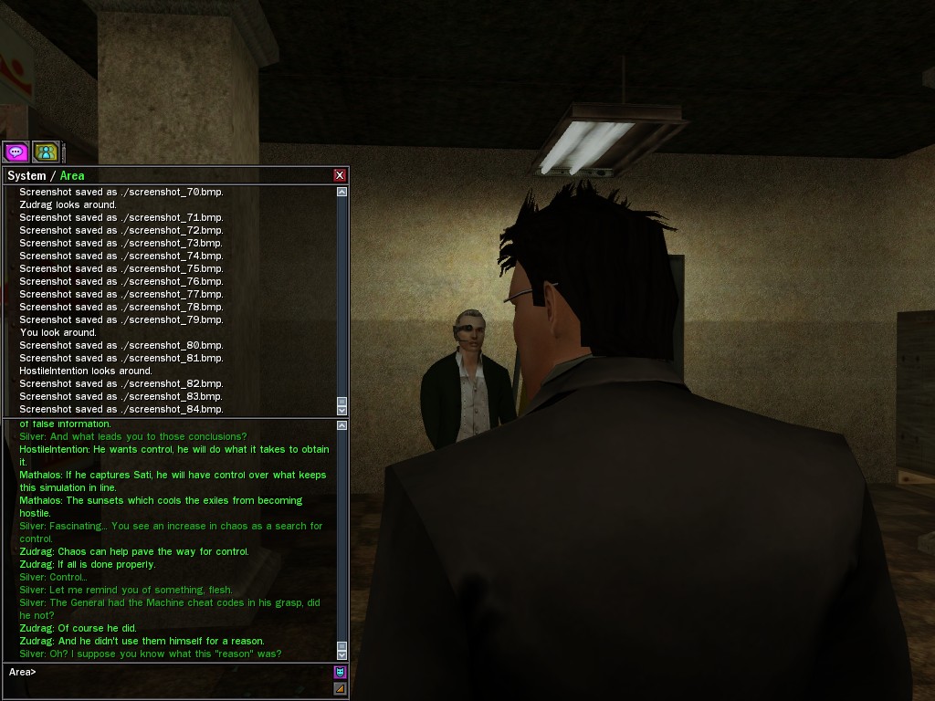 The leader of the reclusive Ethereals made a bold raid on Club Jade, apparently having been convinced by Anome that seizing it for his people would be an easy matter. A group of operatives who happened to be having a party there soon showed him the error of his ways. It is a sad day when even programs are fooled by the viper tongue of one of the worst examples of humanity this simulation has seen.