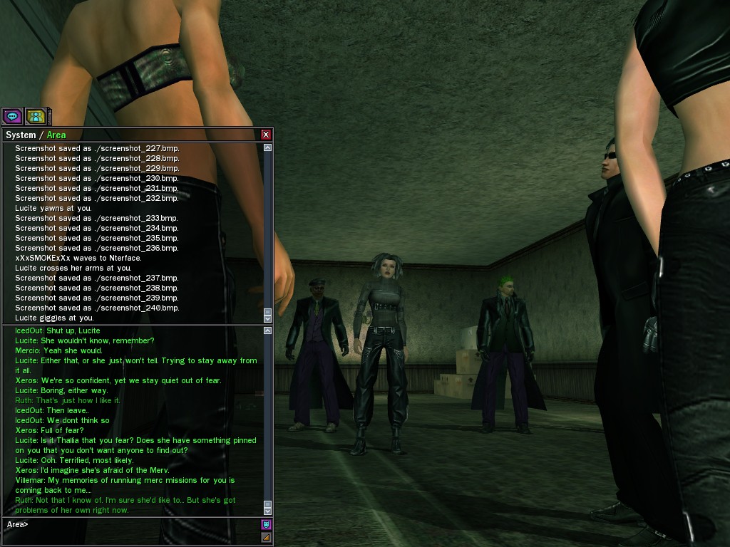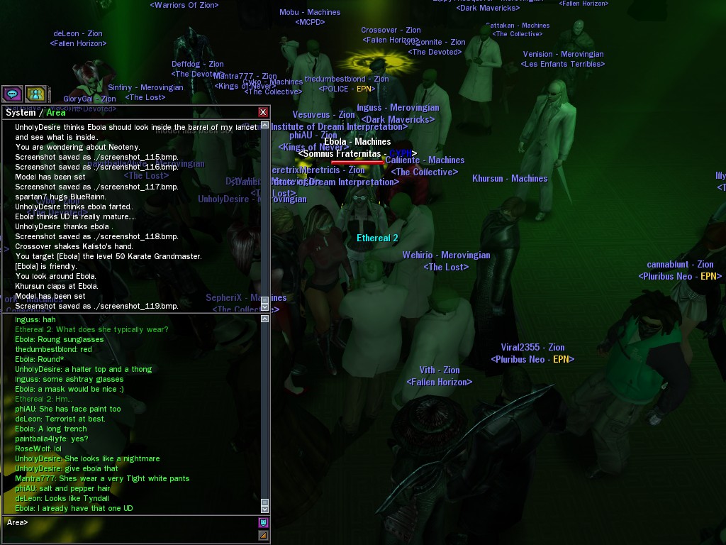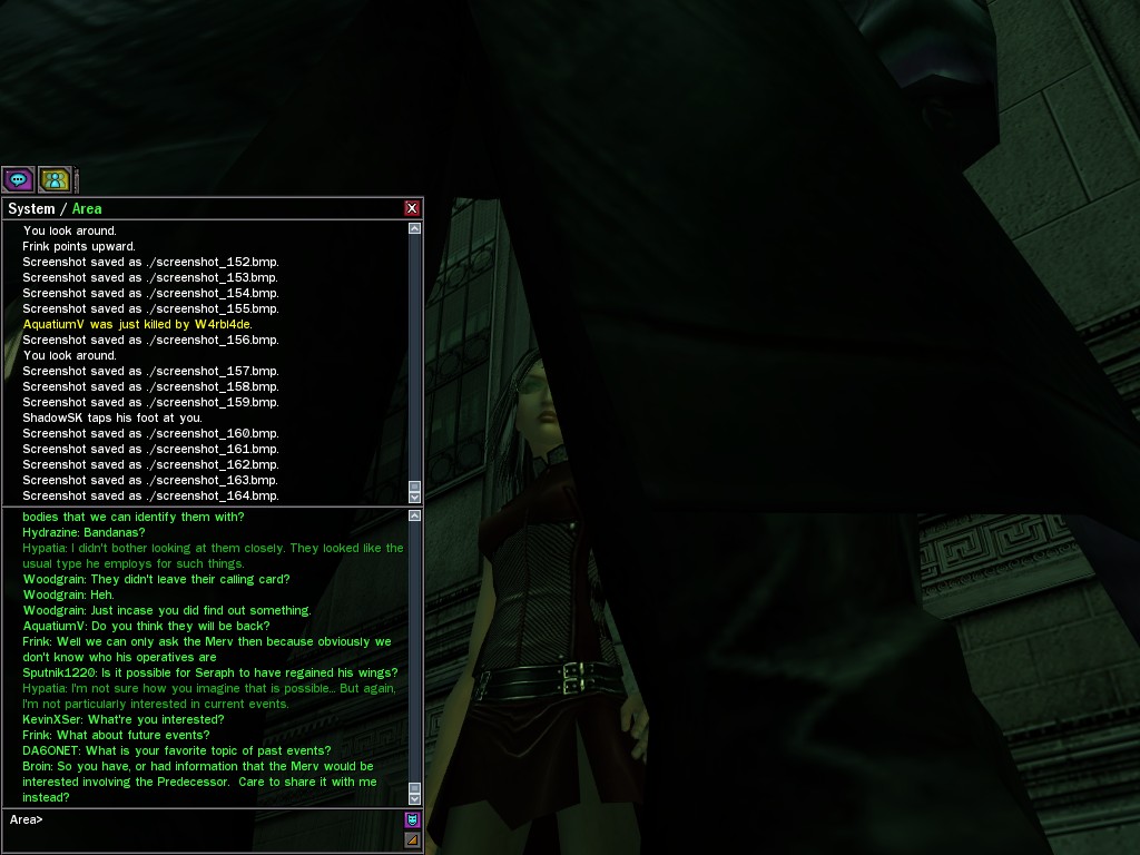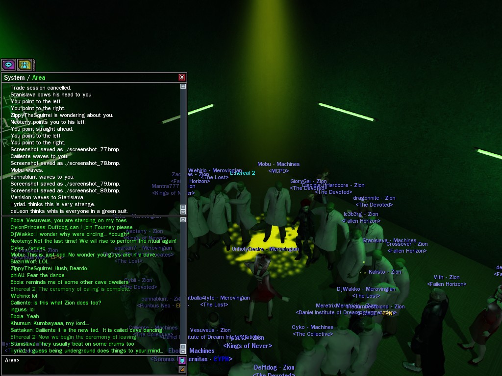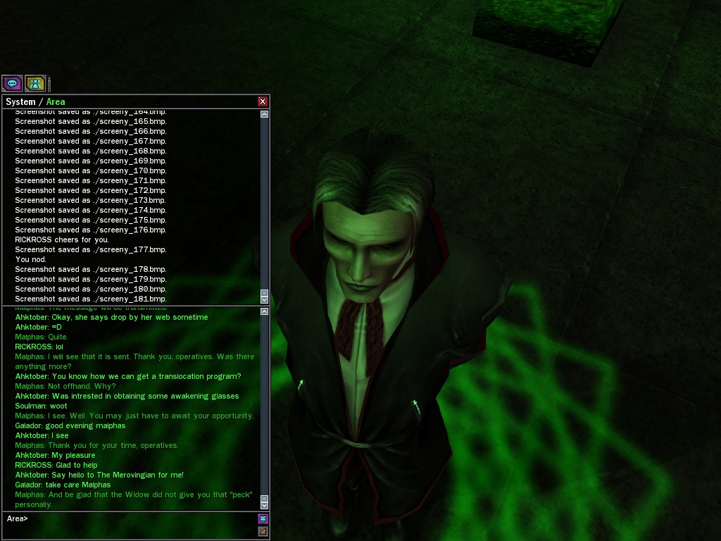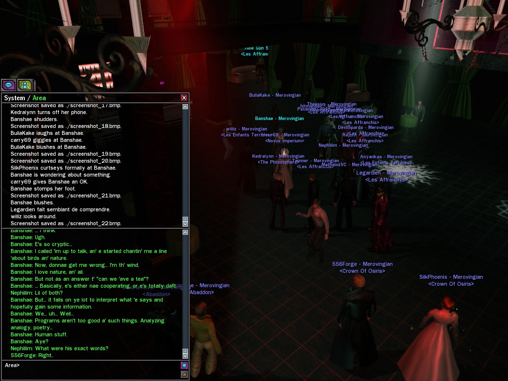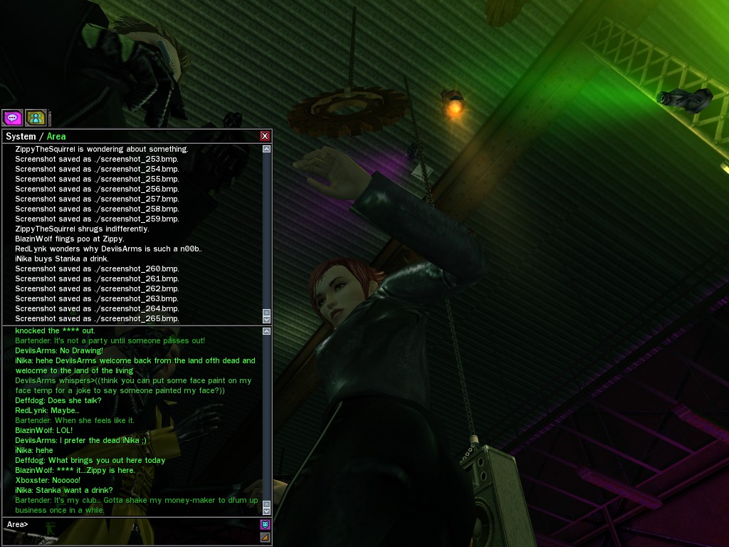 The leader of the reclusive Ethereals made a bold raid on Club Jade, apparently having been convinced by Anome that seizing it for his people would be an easy matter. A group of operatives who happened to be having a party there soon showed him the error of his ways. It is a sad day when even programs are fooled by the viper tongue of one of the worst examples of humanity this simulation has seen.