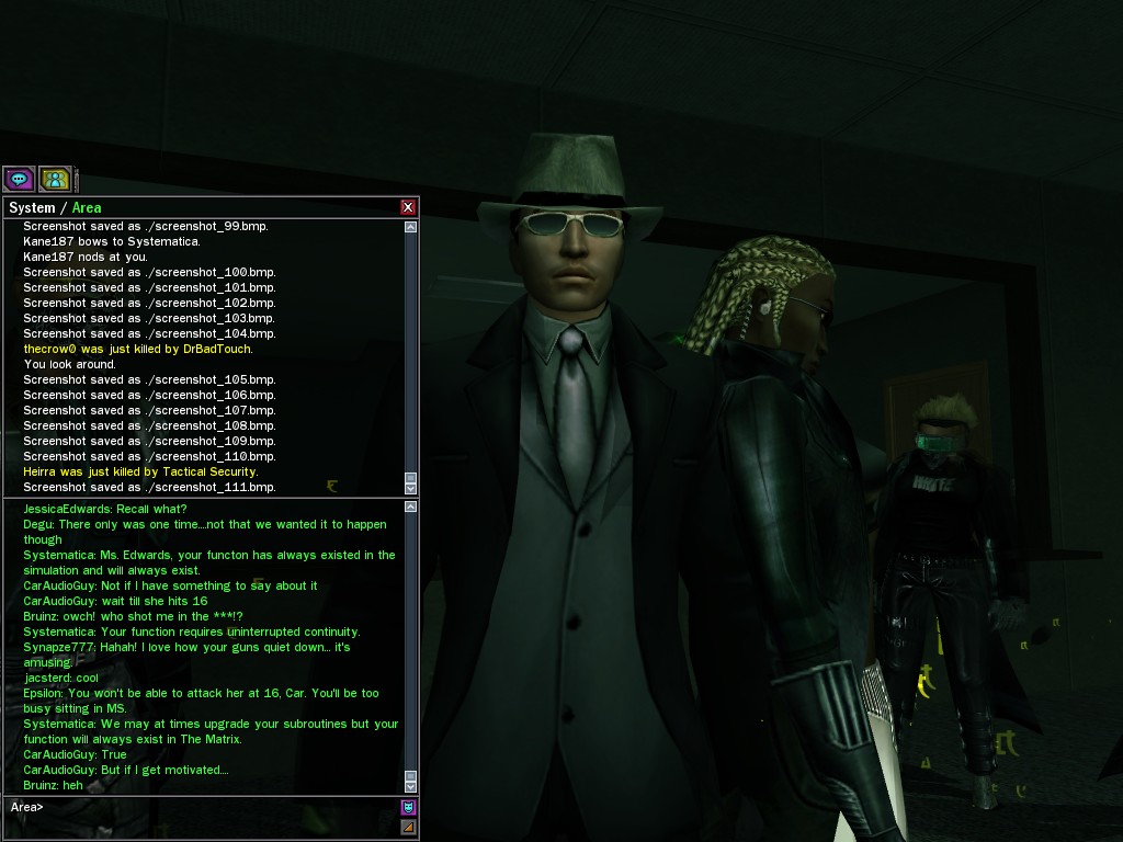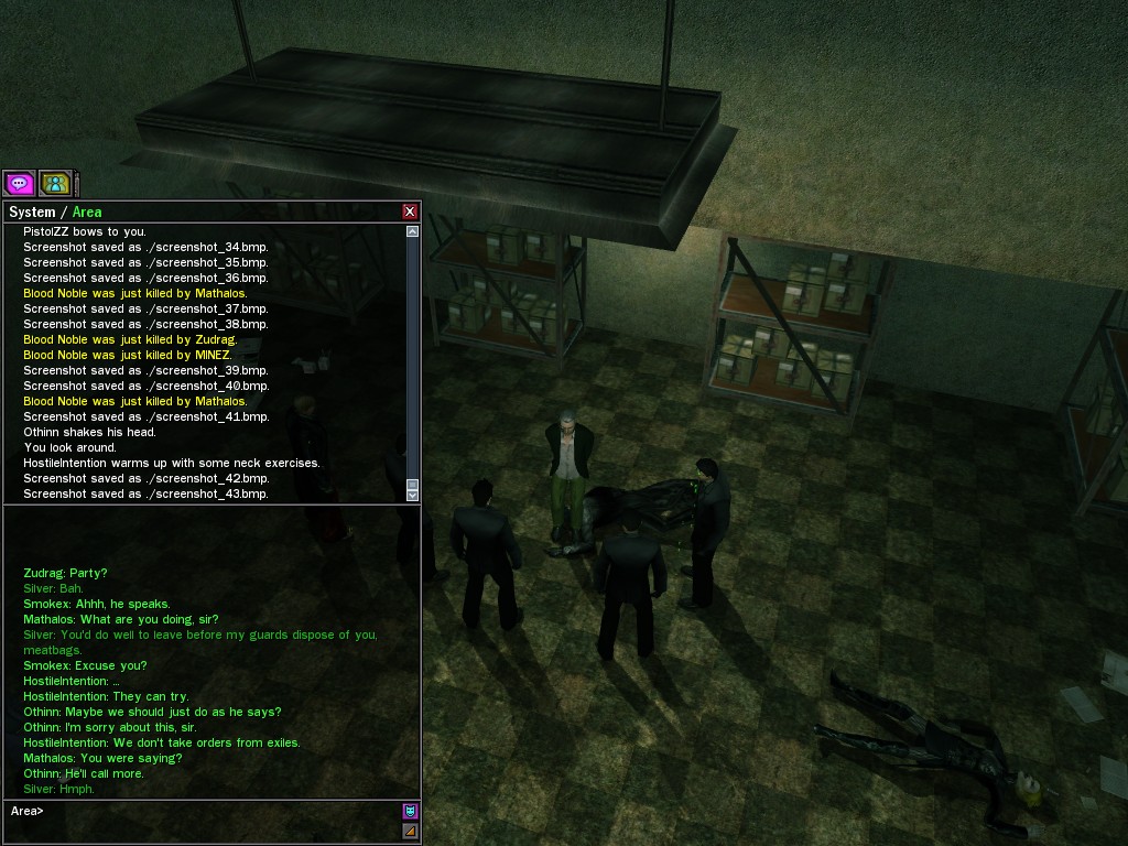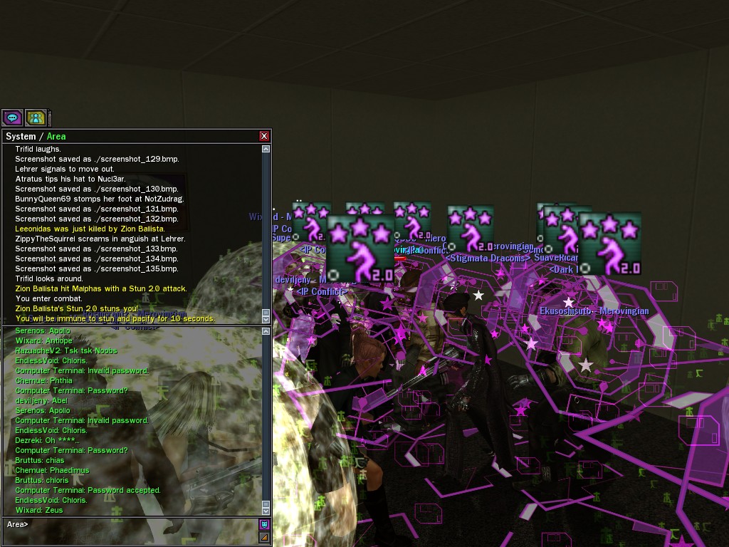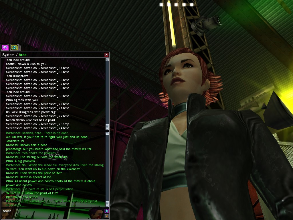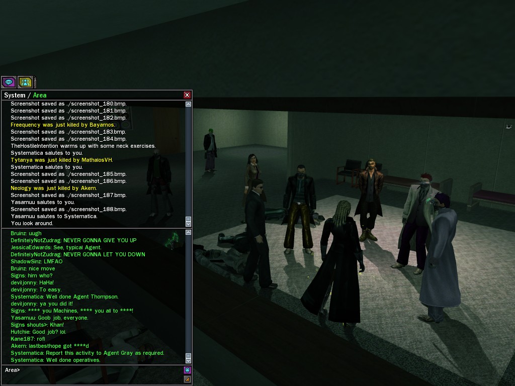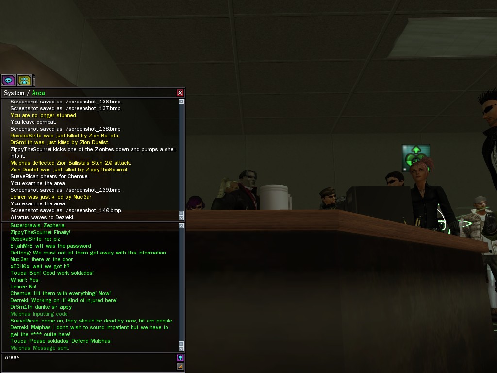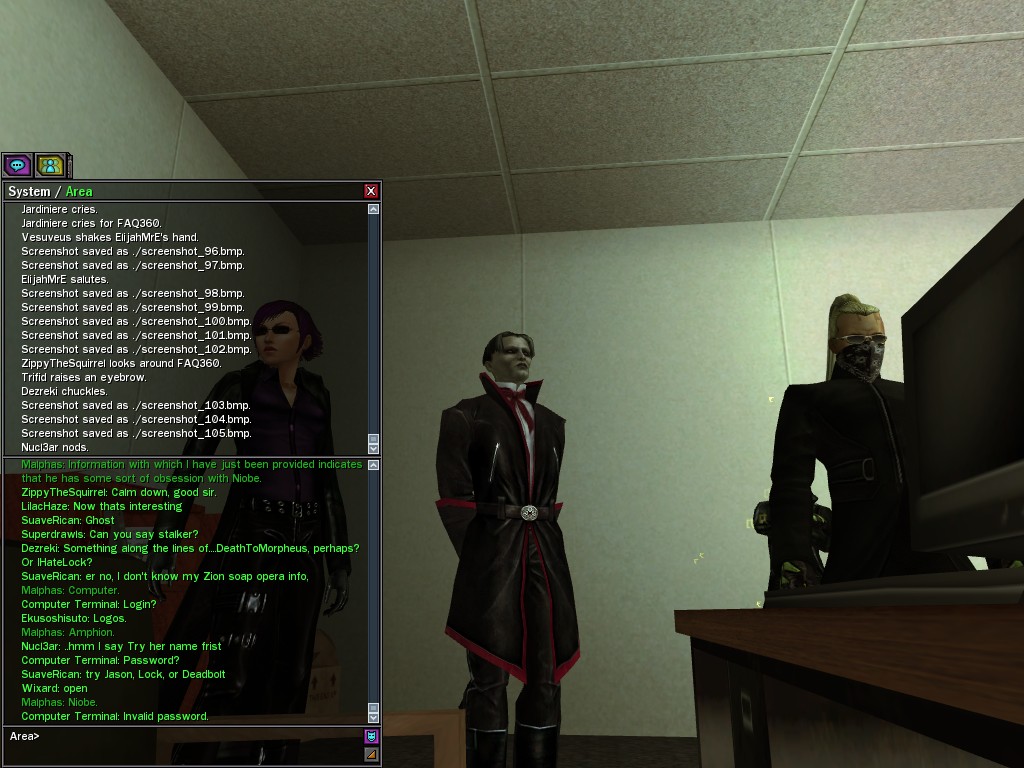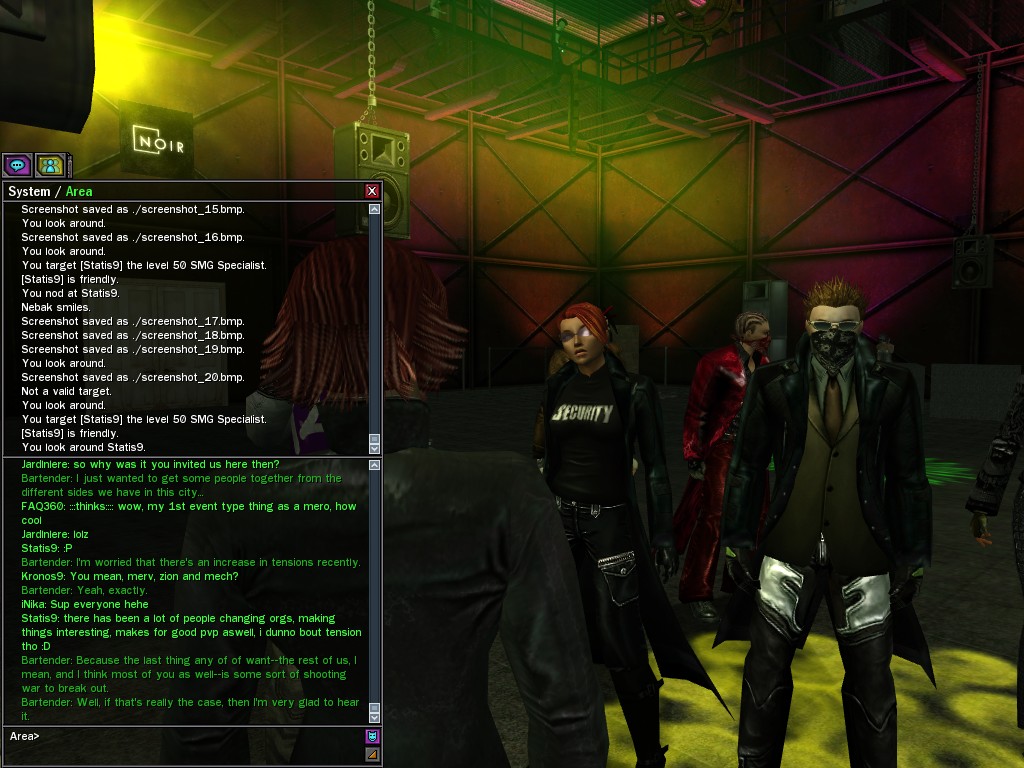 The leader of the reclusive Ethereals made a bold raid on Club Jade, apparently having been convinced by Anome that seizing it for his people would be an easy matter. A group of operatives who happened to be having a party there soon showed him the error of his ways. It is a sad day when even programs are fooled by the viper tongue of one of the worst examples of humanity this simulation has seen.