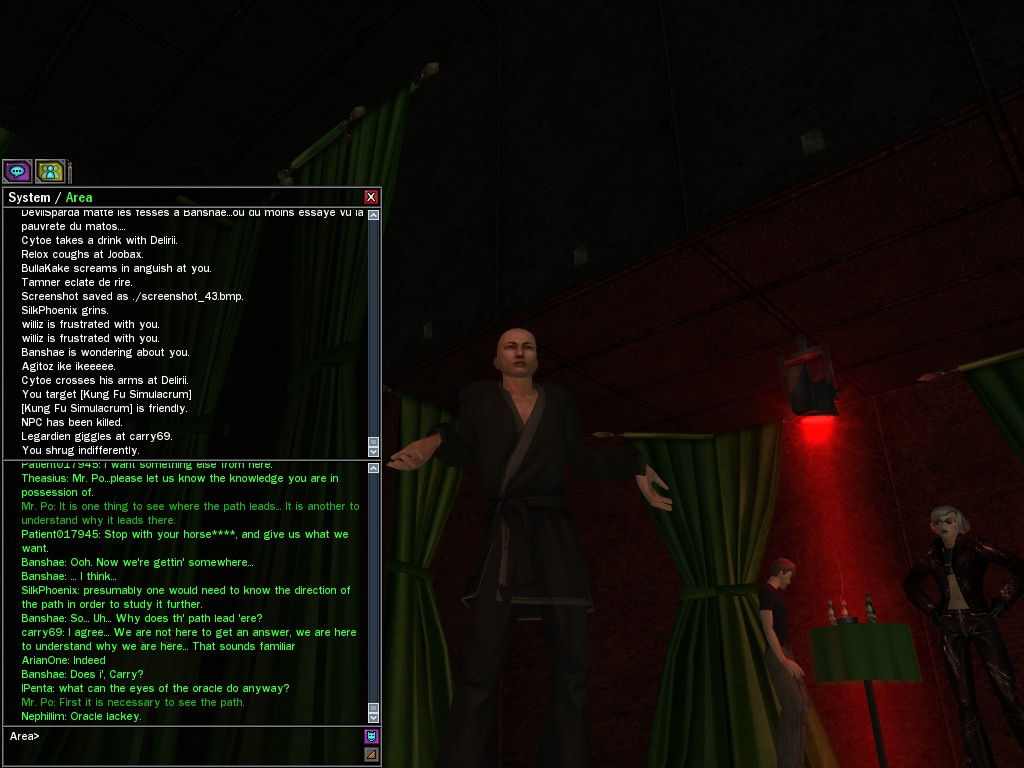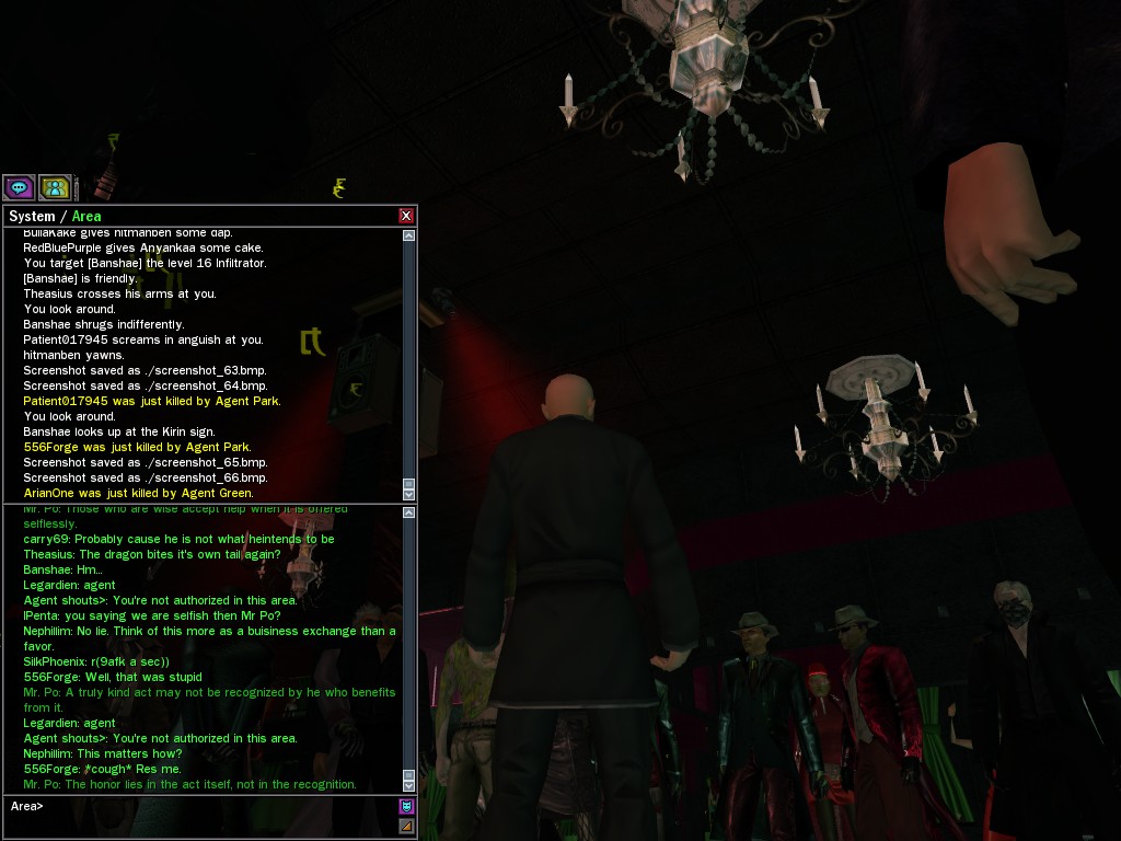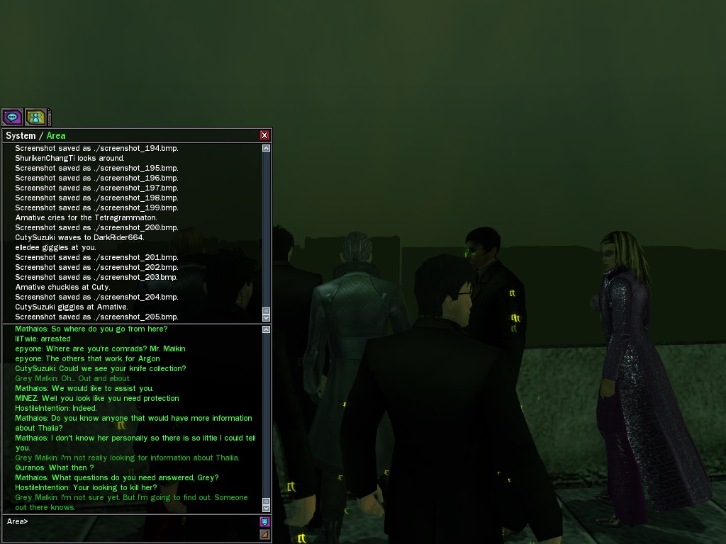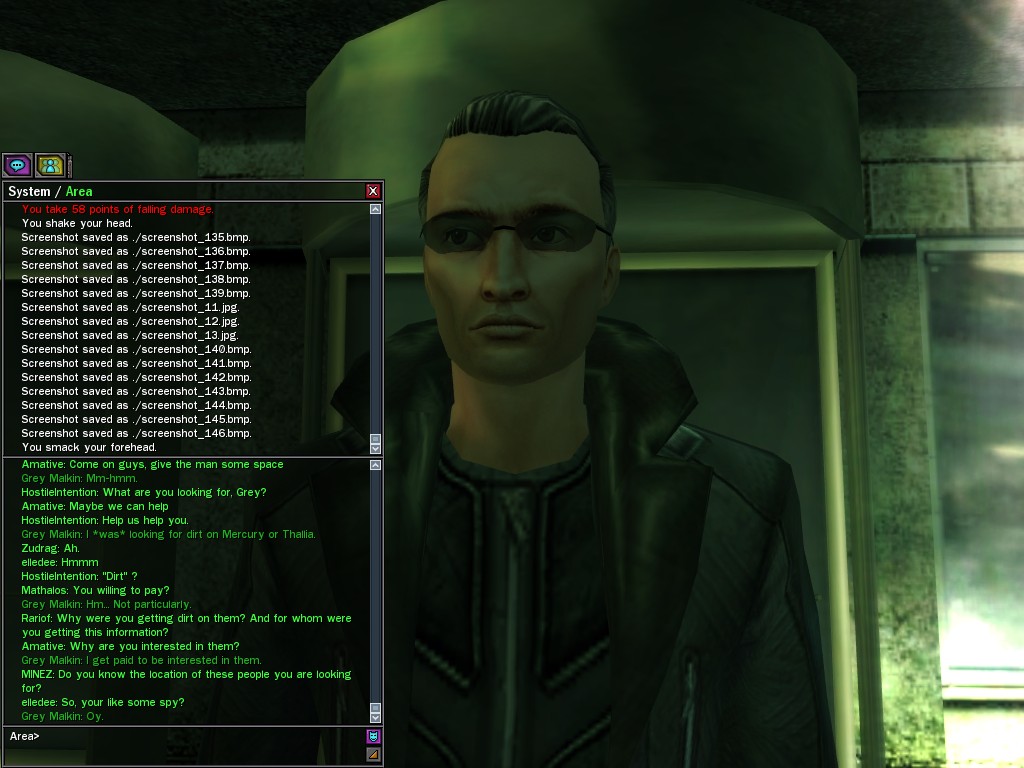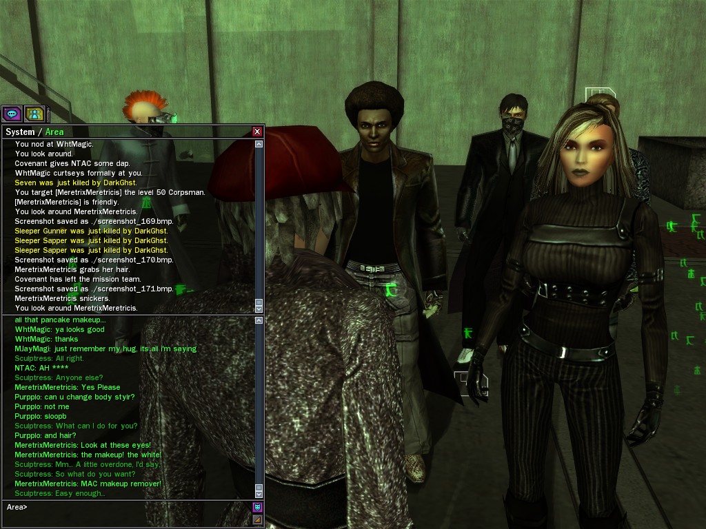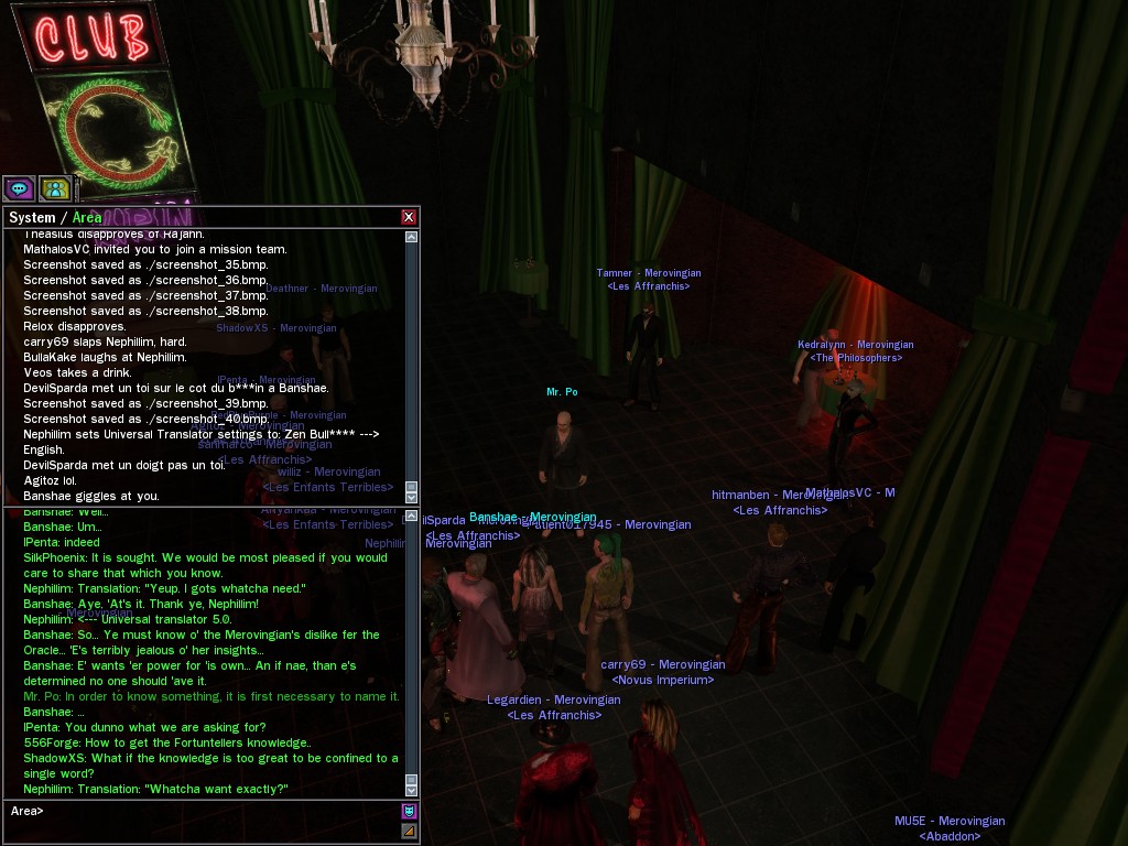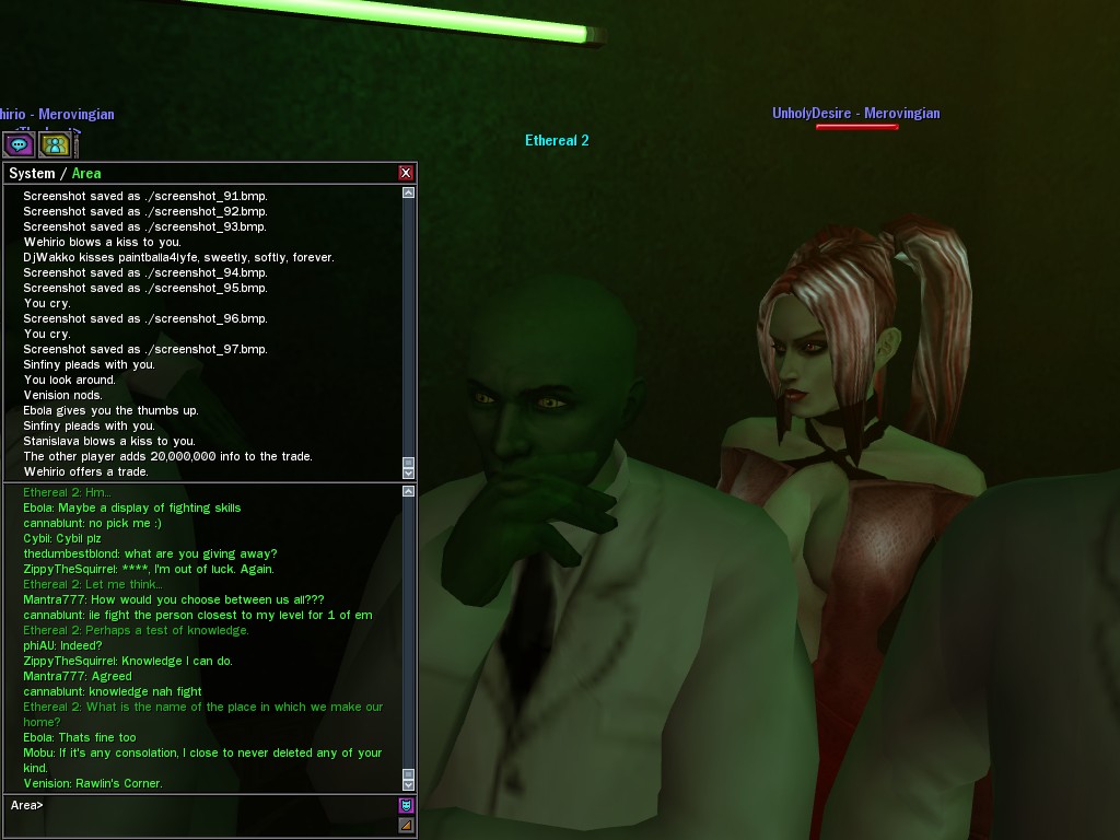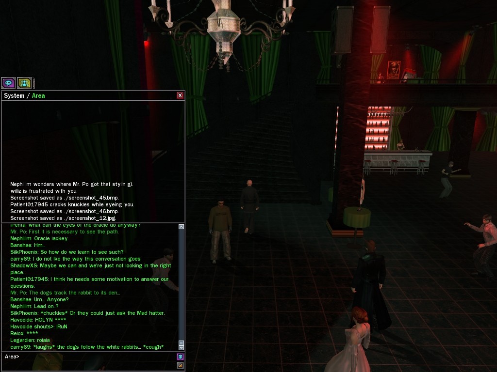 The leader of the reclusive Ethereals made a bold raid on Club Jade, apparently having been convinced by Anome that seizing it for his people would be an easy matter. A group of operatives who happened to be having a party there soon showed him the error of his ways. It is a sad day when even programs are fooled by the viper tongue of one of the worst examples of humanity this simulation has seen.