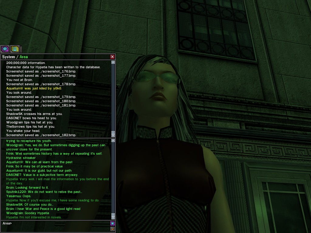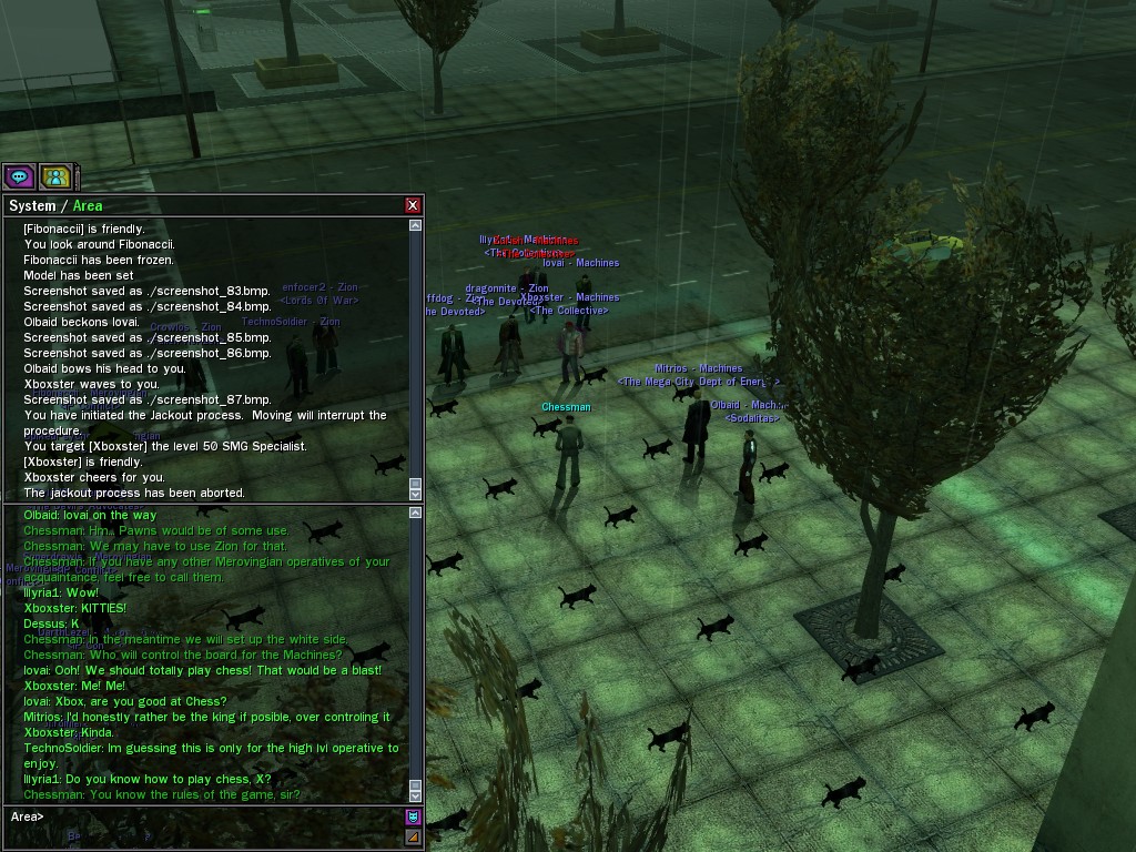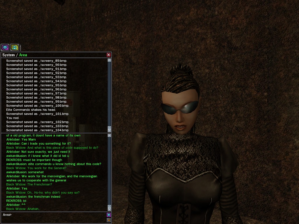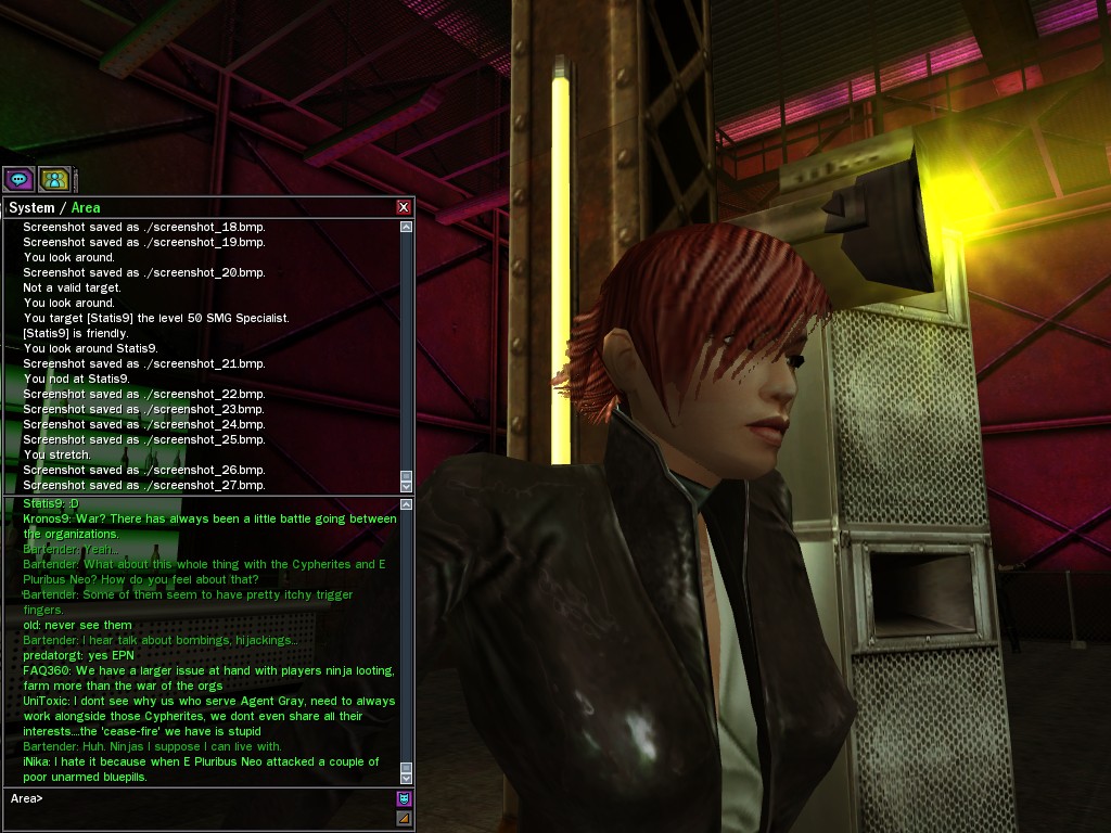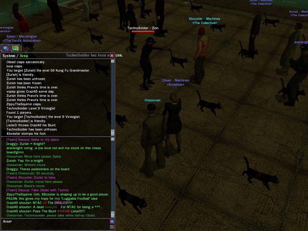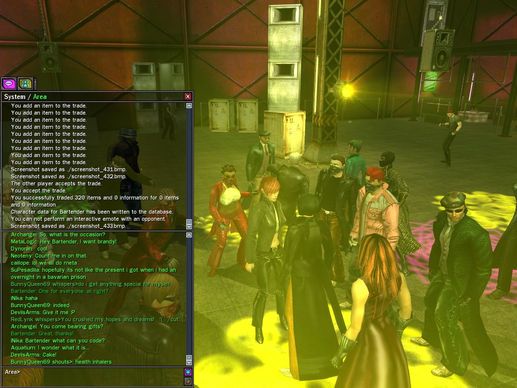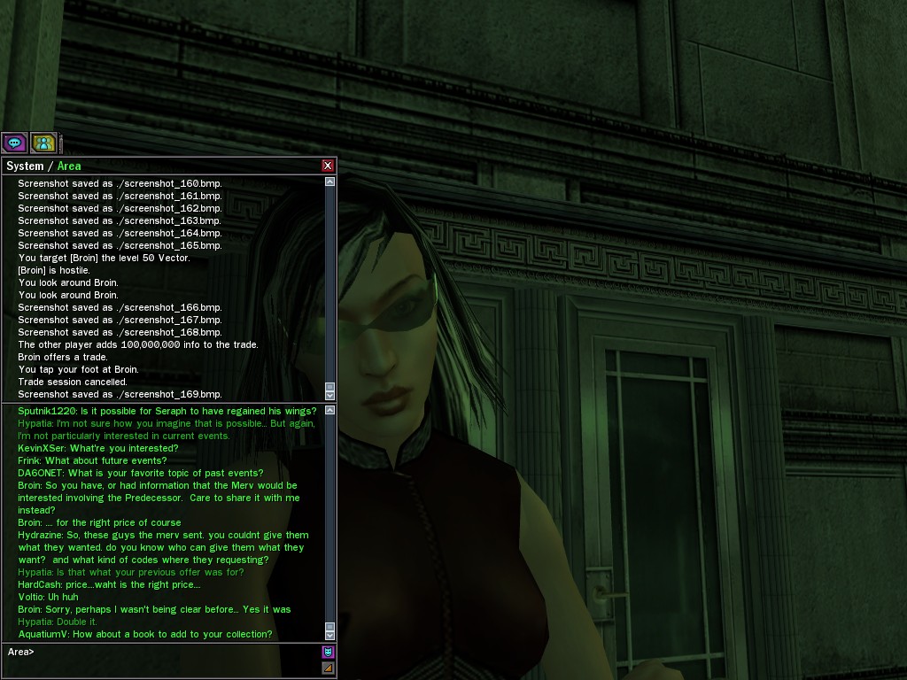 The leader of the reclusive Ethereals made a bold raid on Club Jade, apparently having been convinced by Anome that seizing it for his people would be an easy matter. A group of operatives who happened to be having a party there soon showed him the error of his ways. It is a sad day when even programs are fooled by the viper tongue of one of the worst examples of humanity this simulation has seen.
