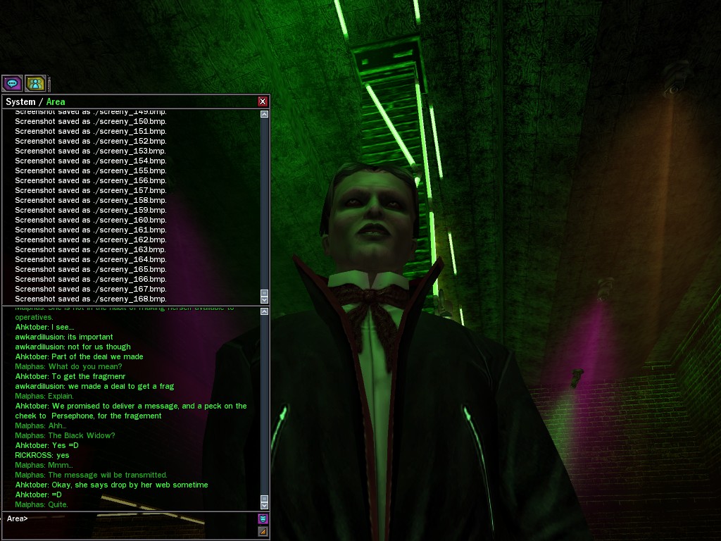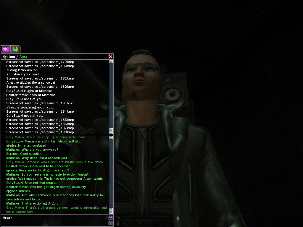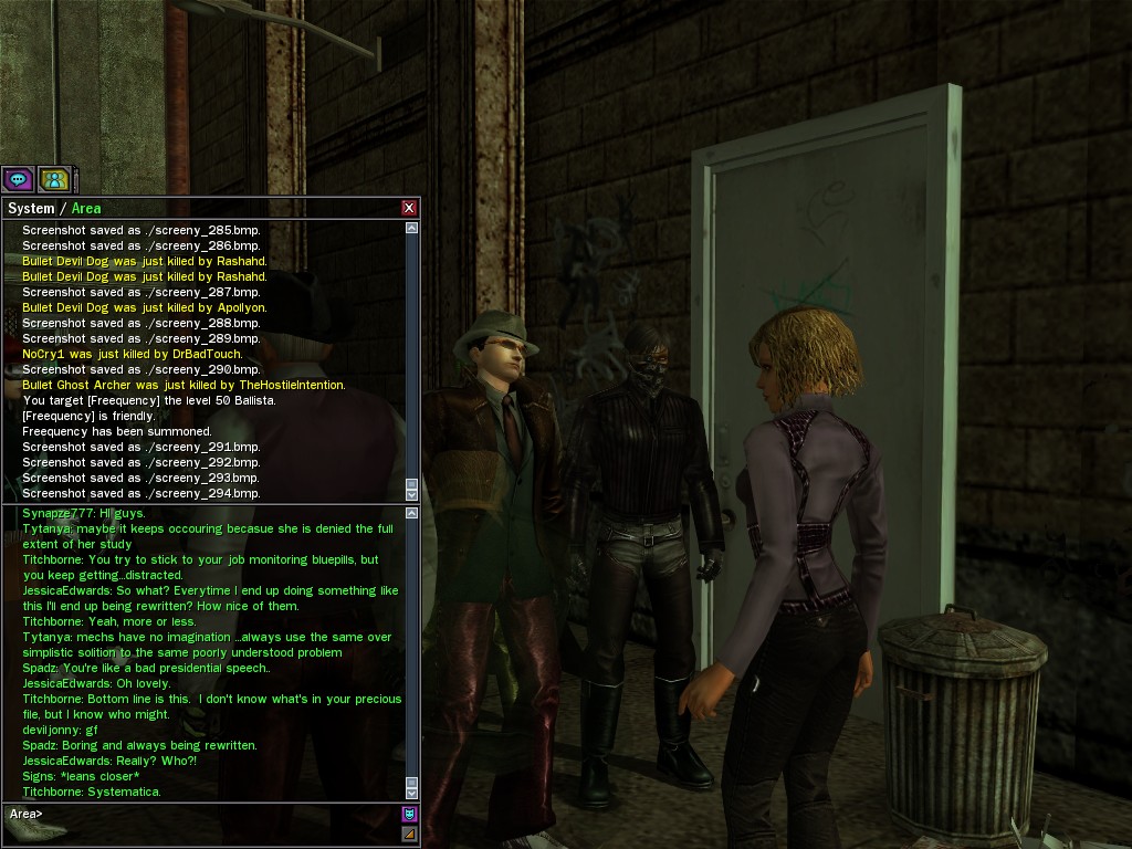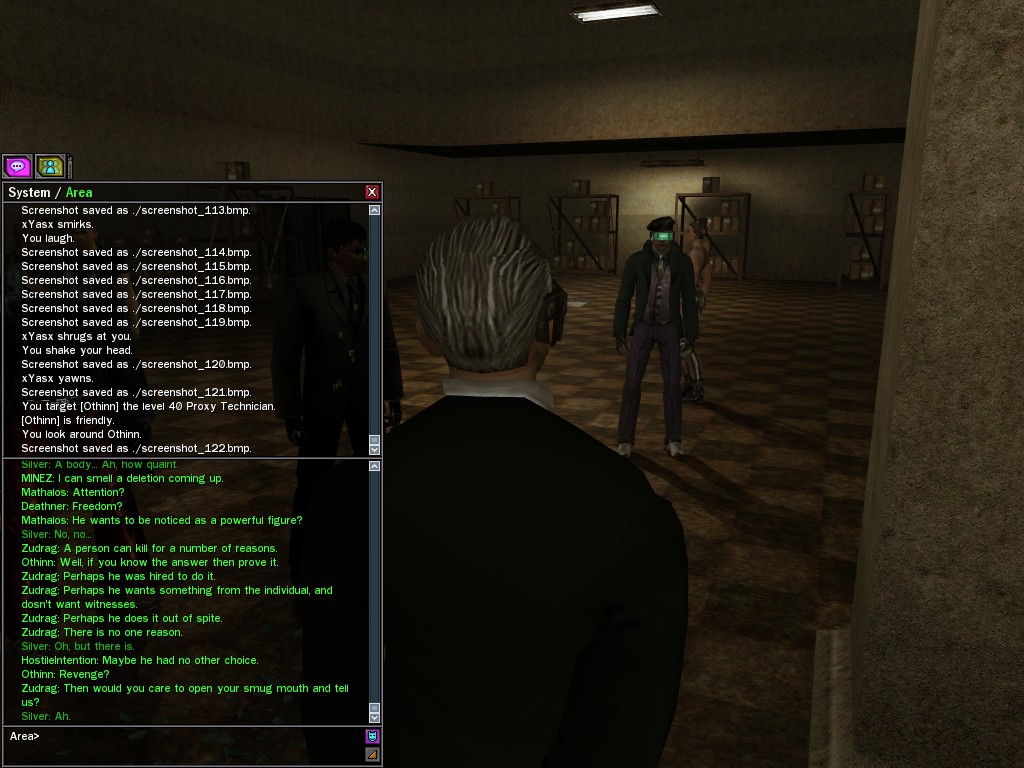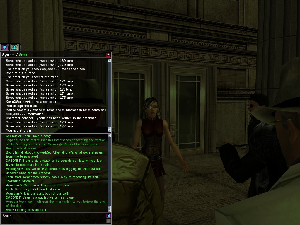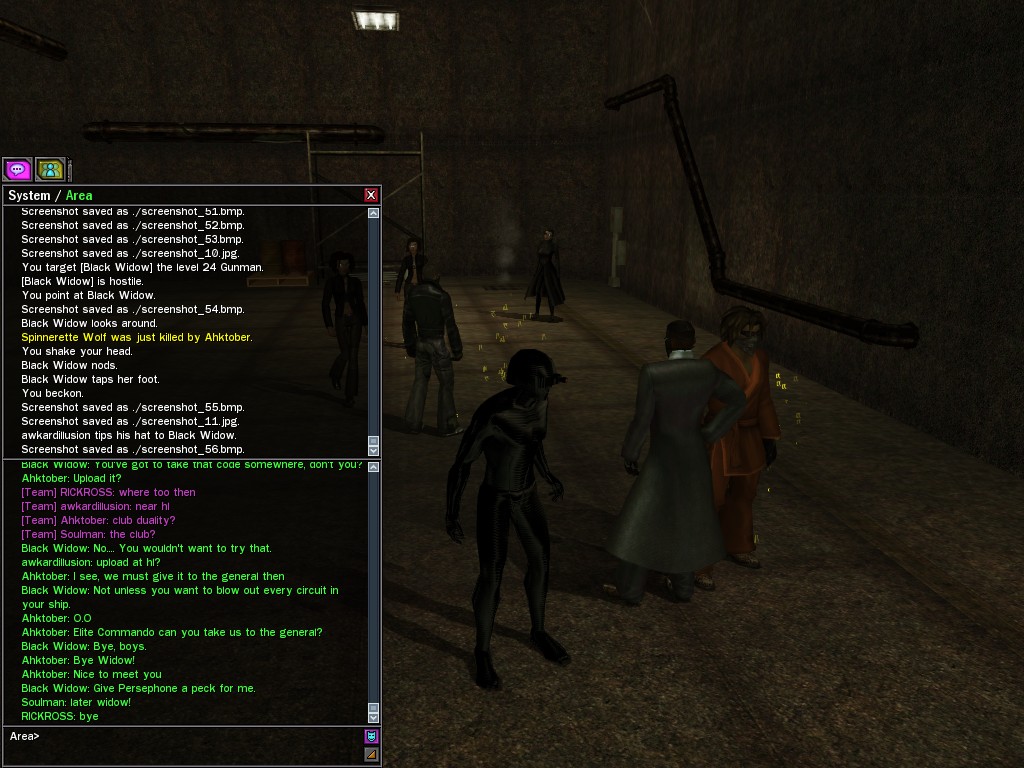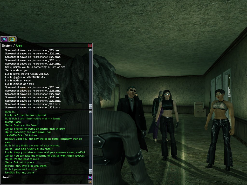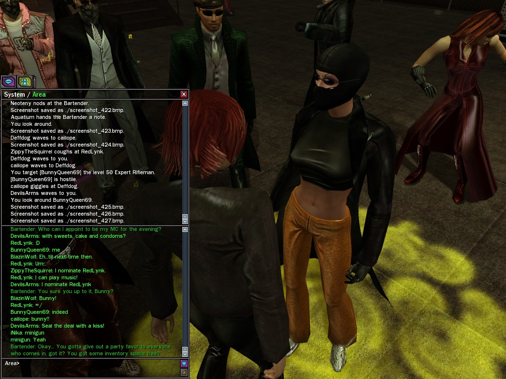 The leader of the reclusive Ethereals made a bold raid on Club Jade, apparently having been convinced by Anome that seizing it for his people would be an easy matter. A group of operatives who happened to be having a party there soon showed him the error of his ways. It is a sad day when even programs are fooled by the viper tongue of one of the worst examples of humanity this simulation has seen.