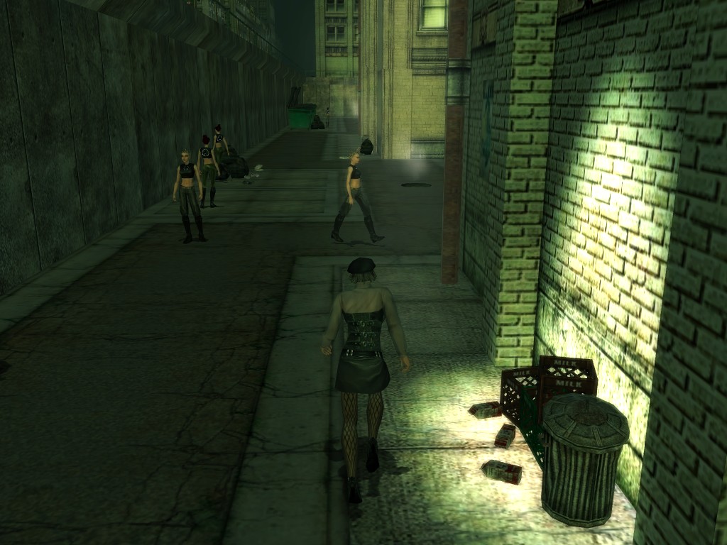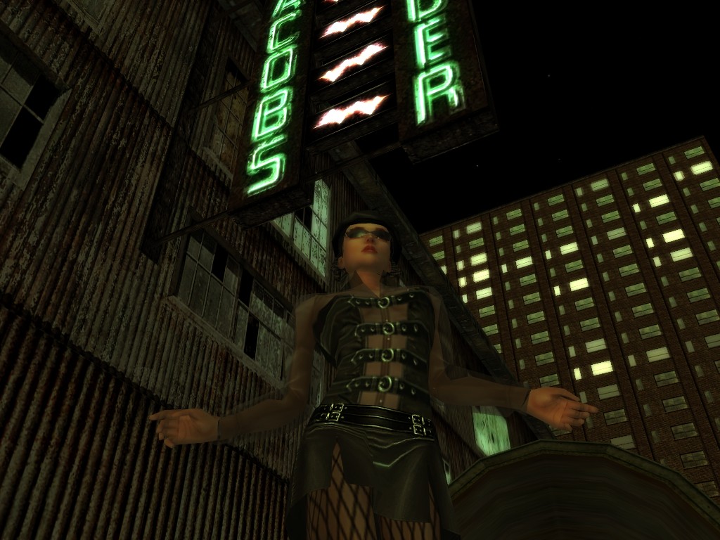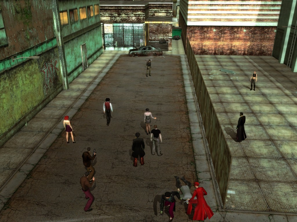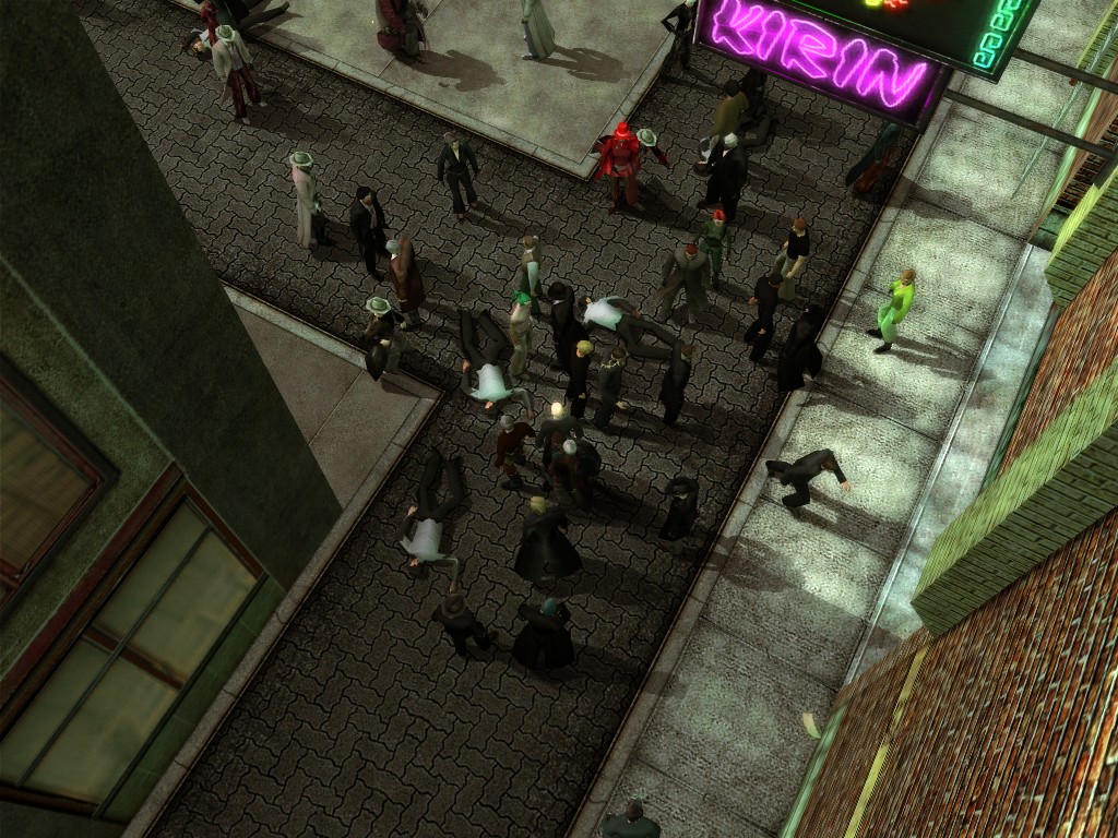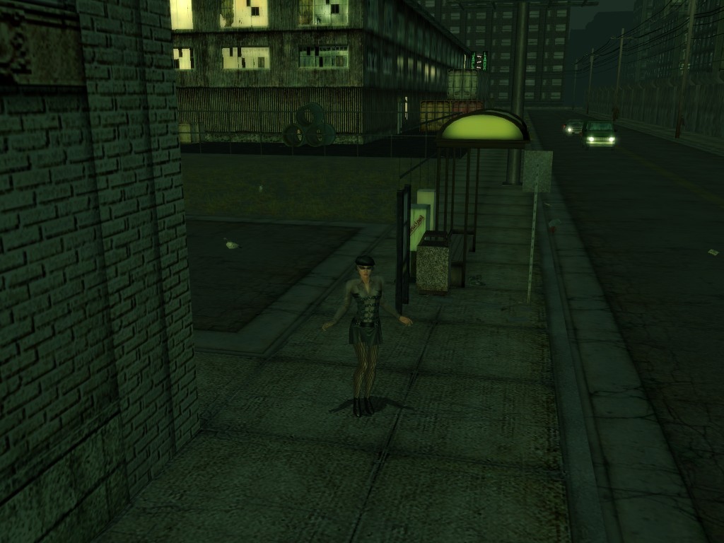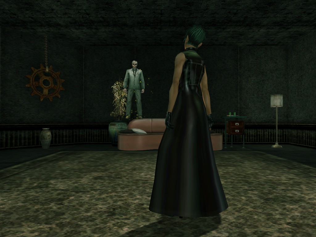 The body of our employee, wholly deceased, lies on the floor. Noticing nothing more of interest here, we might return outside, where our glance would naturally find its way to the gang members ceaselessly pacing about the vicinity. A quick check on these "Brothers of Destiny" uncovers a piece of information that would be more of the usual nonsensical filler found all too often in this dreary place, except that it brings to mind one of the rumors concerning the other party in question.