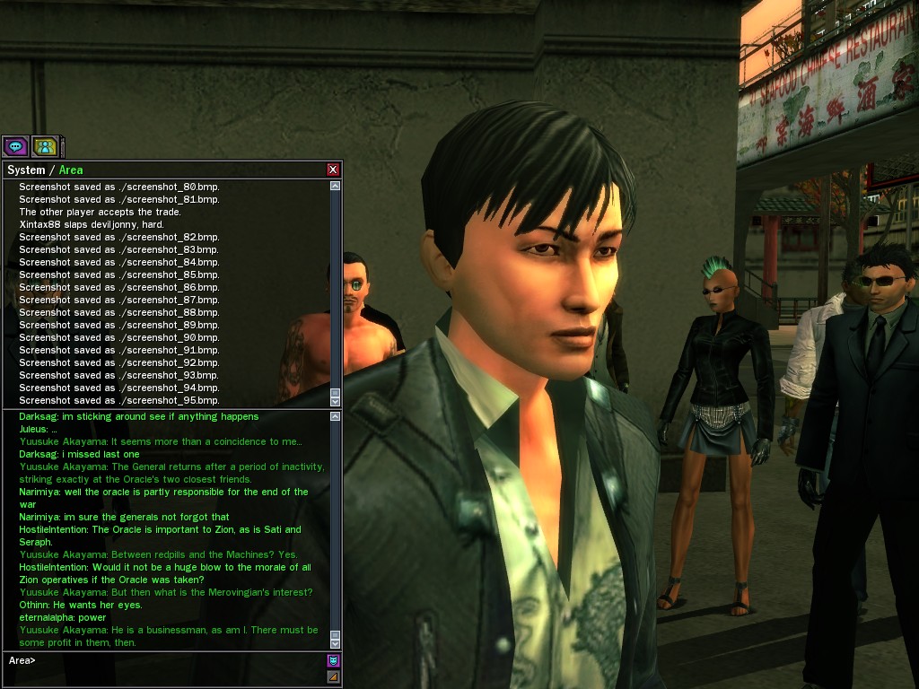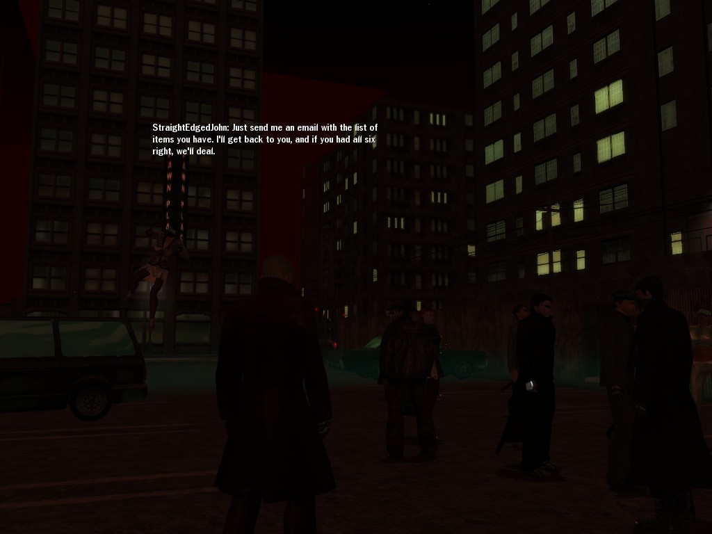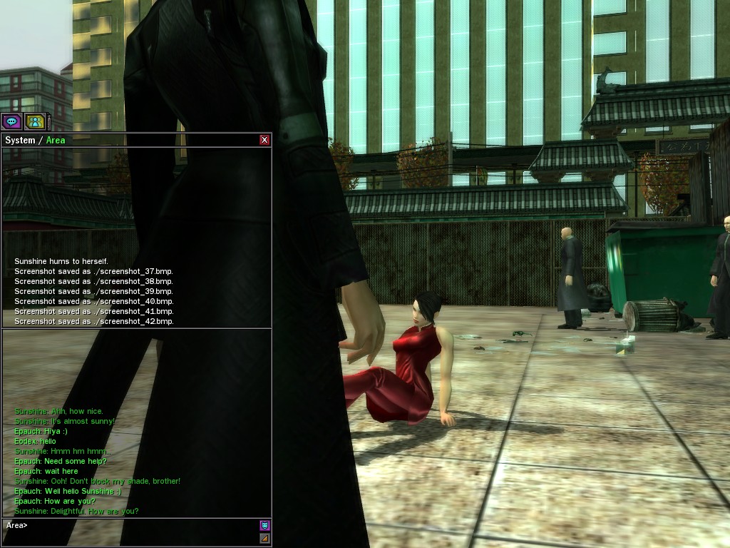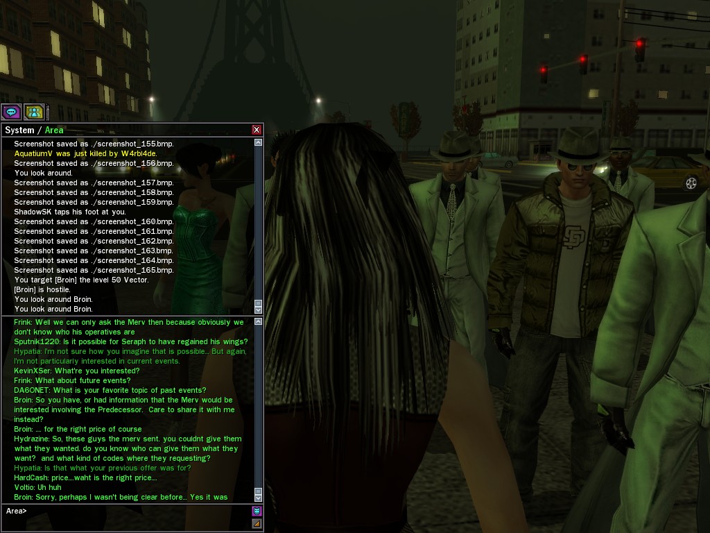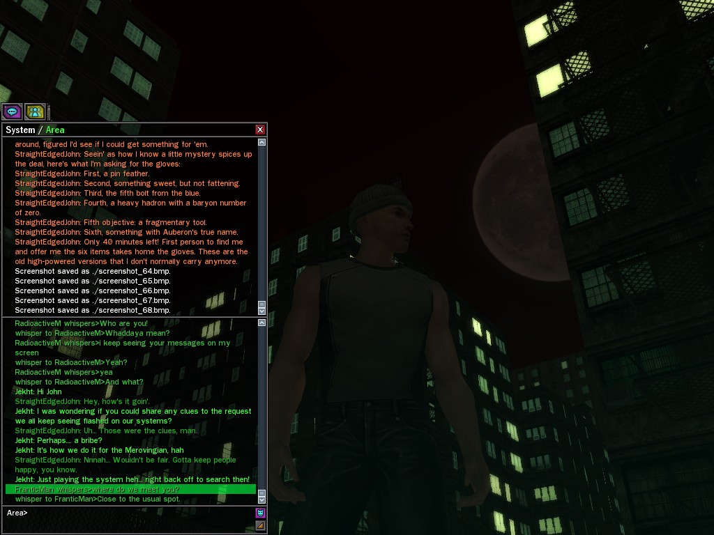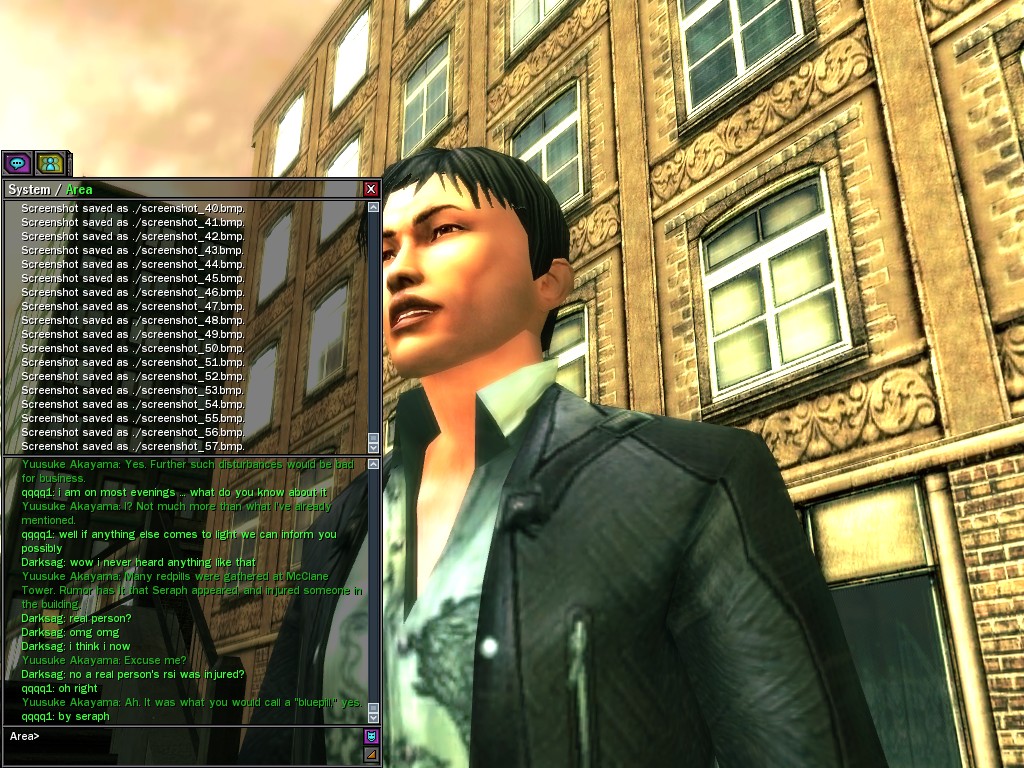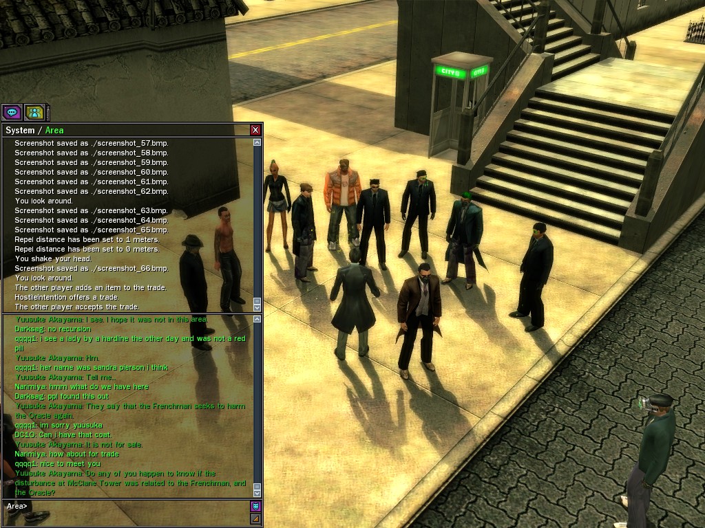 Excuse me. The Merovingian is offering a reward to the individual who locates two missing persons, both probably deceased. One was an employee of ours, on the trail of a scam artist who had defrauded our organization in office real estate dealings. Our employee was known to have a taste for Vietnamese noodles. It is suspected that he was done away with while stepping away from his work to indulge this habit in some exclusive, upper-story venue catering to the more...illegal ingredients in those dishes. His last report suggested that the scam artist was working with a local gang. As for the scam artist, it is rumored that he was killed by the leader of that gang's rival, having let his guard down after being lured into a compromising location not far from the leader's lair. That scam artist is the second person we wish located. The first clear photographs of both persons, sent to me via Private Message on the usual Data Node One exchange, and including the map display with the local coordinates, and an operative name showing in the upper right information window--the same name in both photos--will qualify for the reward, which will be sent to the operative whose name is shown. No incomplete evidence will be accepted. Your indulgence and discretion are appreciated.
