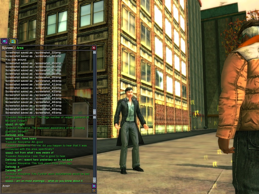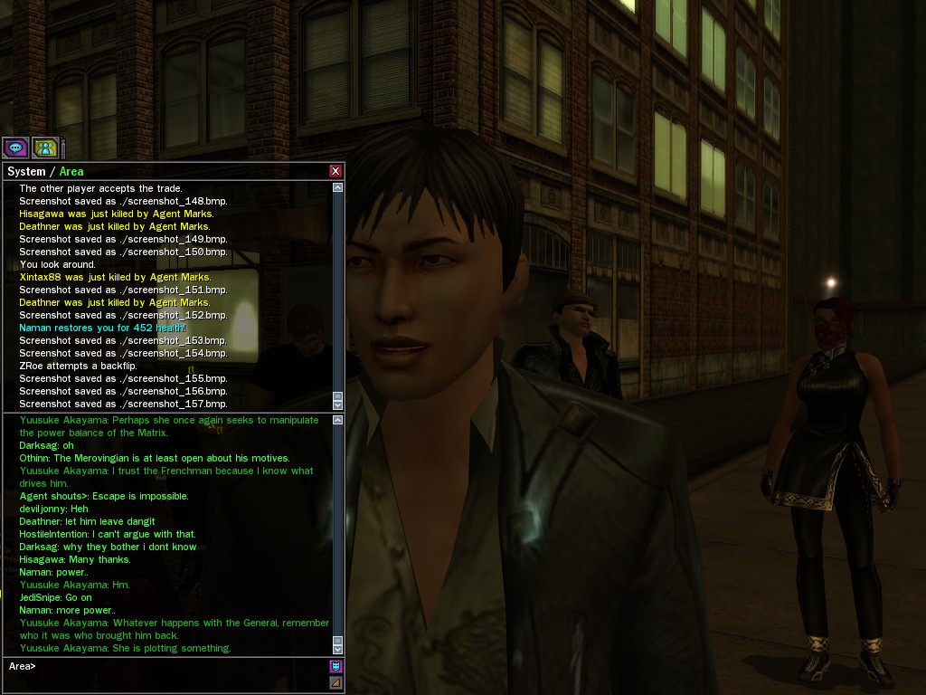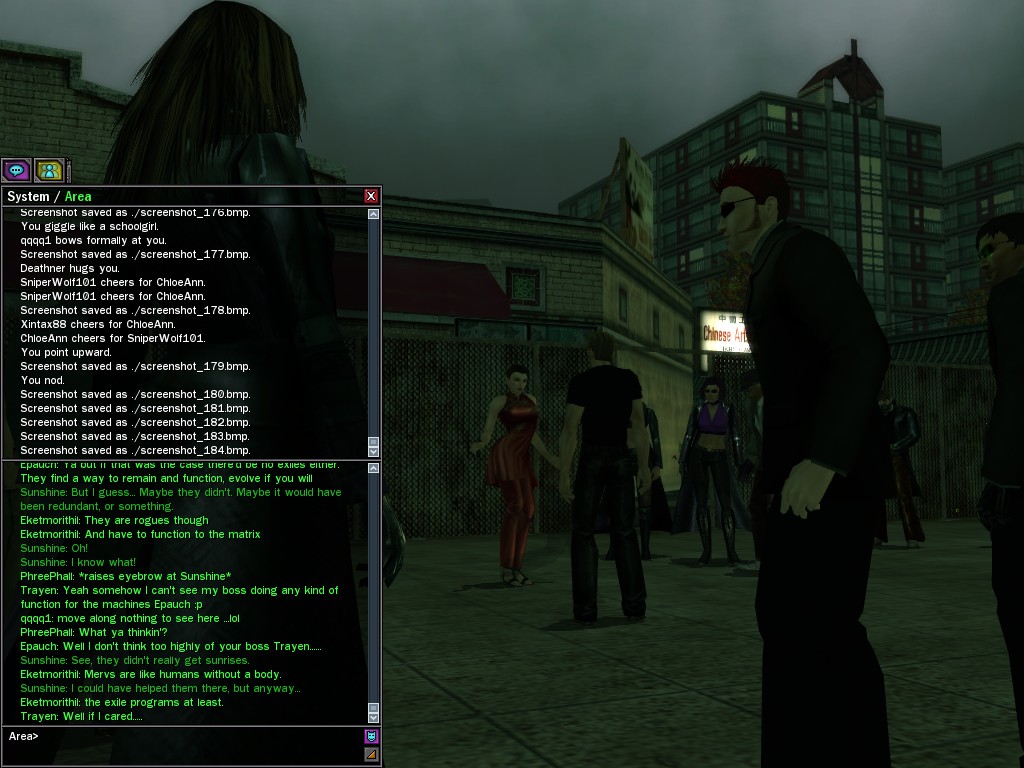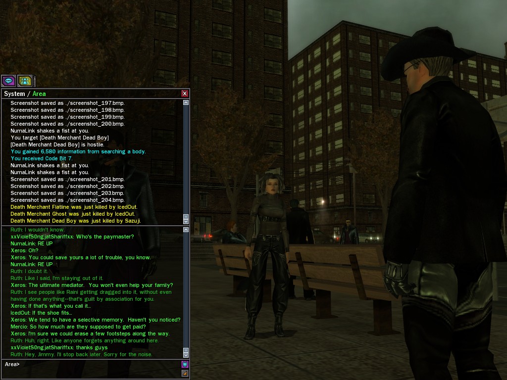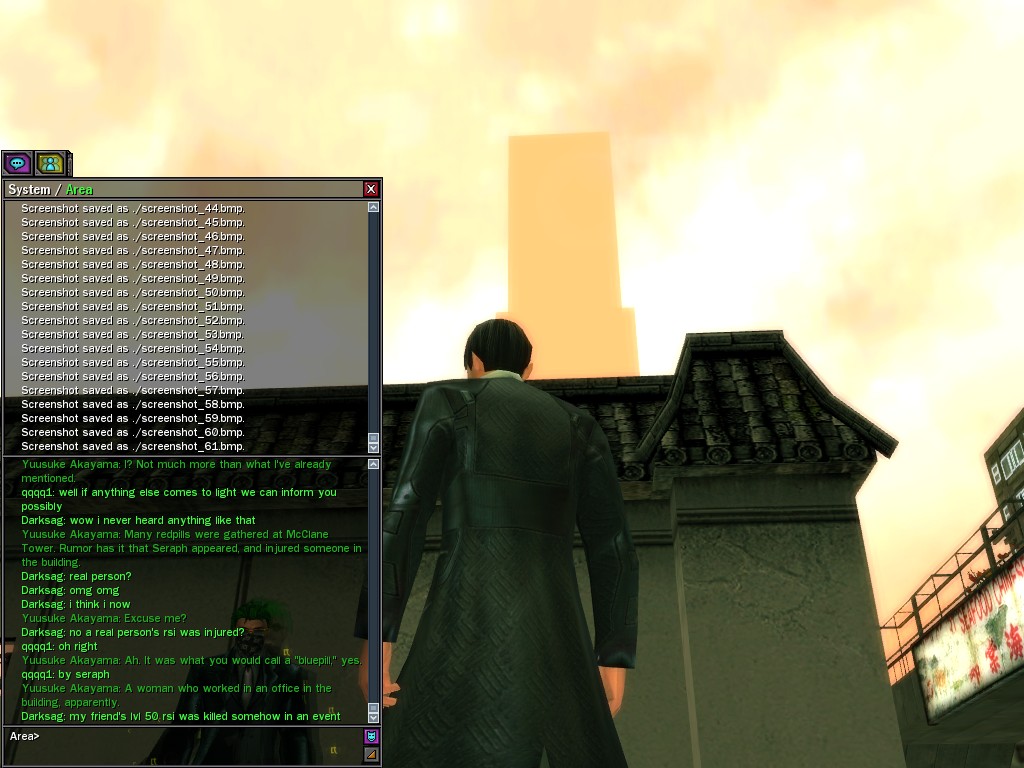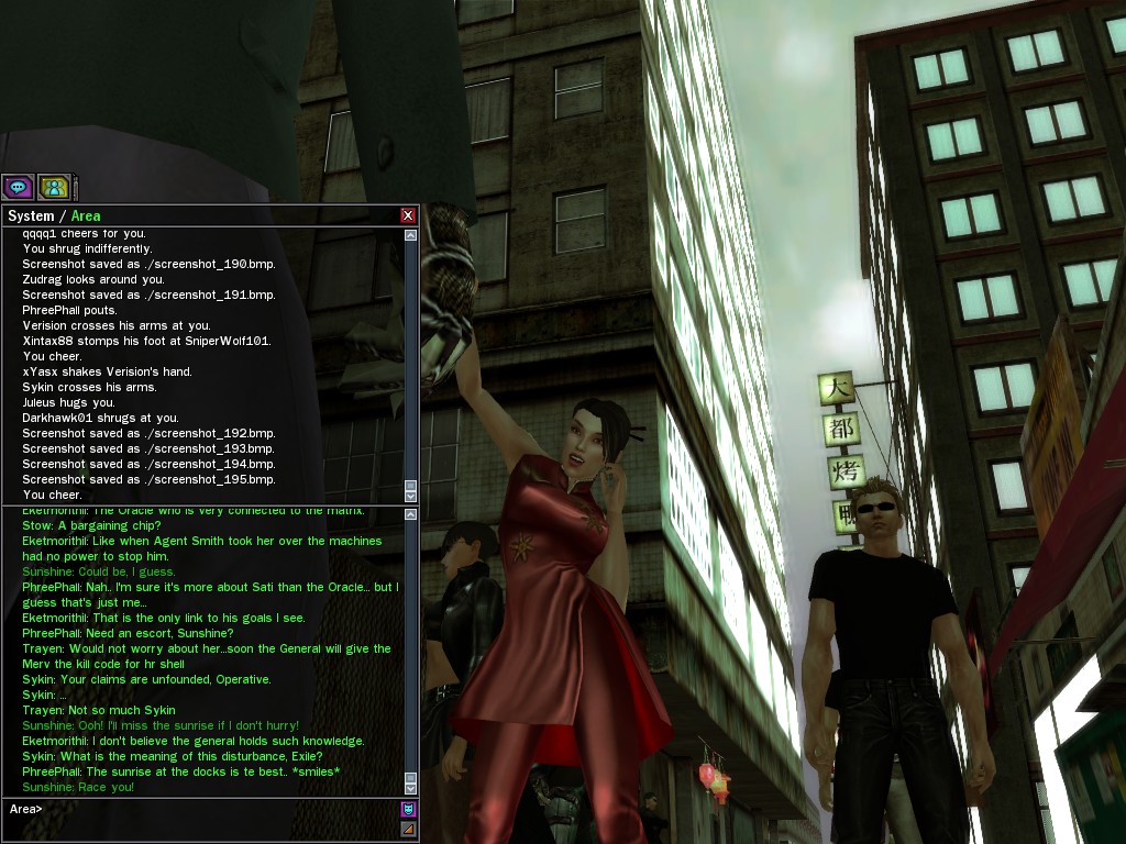 Excuse me. The Merovingian is offering a reward to the individual who locates two missing persons, both probably deceased. One was an employee of ours, on the trail of a scam artist who had defrauded our organization in office real estate dealings. Our employee was known to have a taste for Vietnamese noodles. It is suspected that he was done away with while stepping away from his work to indulge this habit in some exclusive, upper-story venue catering to the more...illegal ingredients in those dishes. His last report suggested that the scam artist was working with a local gang. As for the scam artist, it is rumored that he was killed by the leader of that gang's rival, having let his guard down after being lured into a compromising location not far from the leader's lair. That scam artist is the second person we wish located. The first clear photographs of both persons, sent to me via Private Message on the usual Data Node One exchange, and including the map display with the local coordinates, and an operative name showing in the upper right information window--the same name in both photos--will qualify for the reward, which will be sent to the operative whose name is shown. No incomplete evidence will be accepted. Your indulgence and discretion are appreciated.