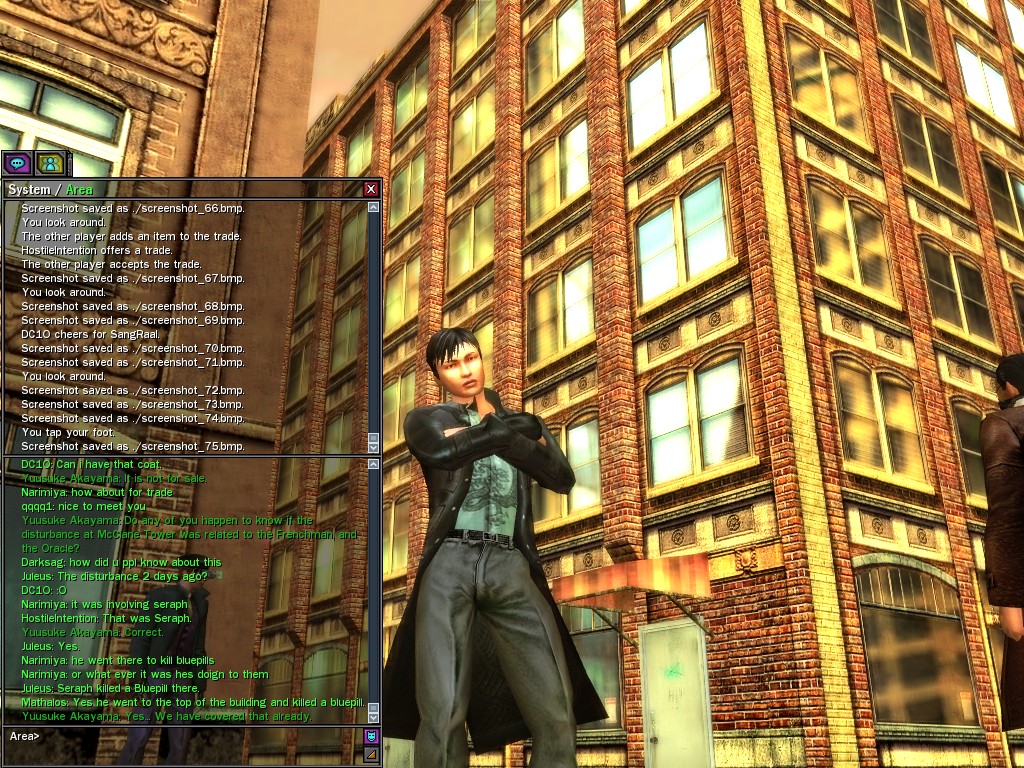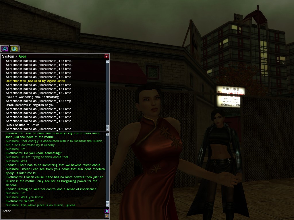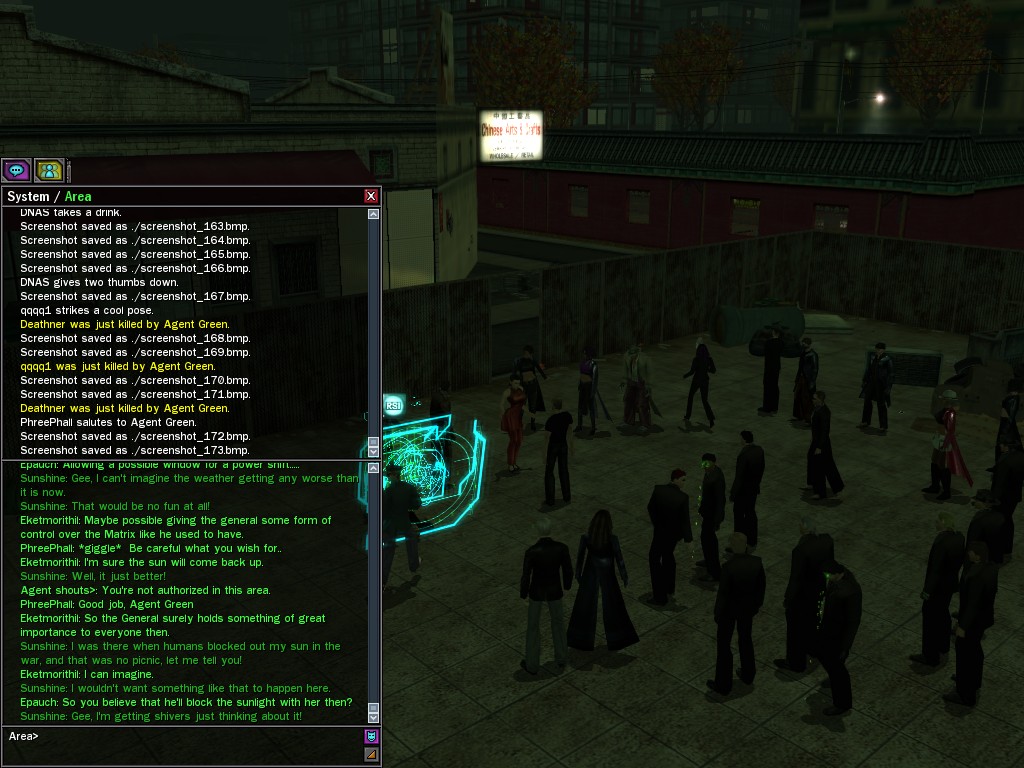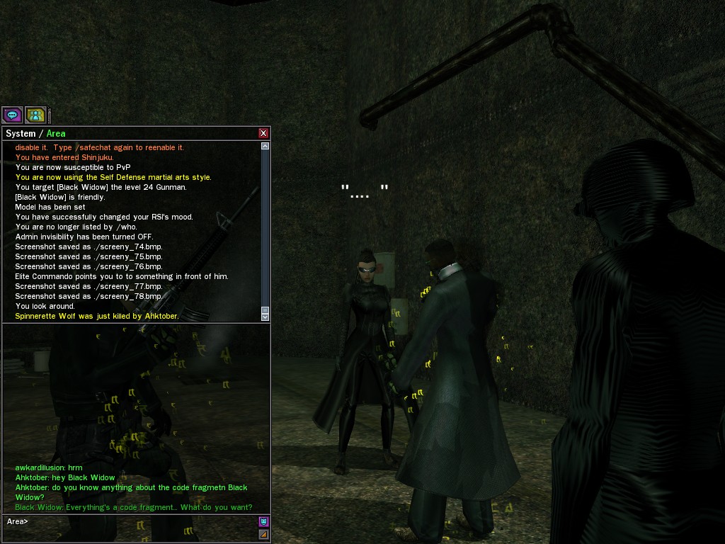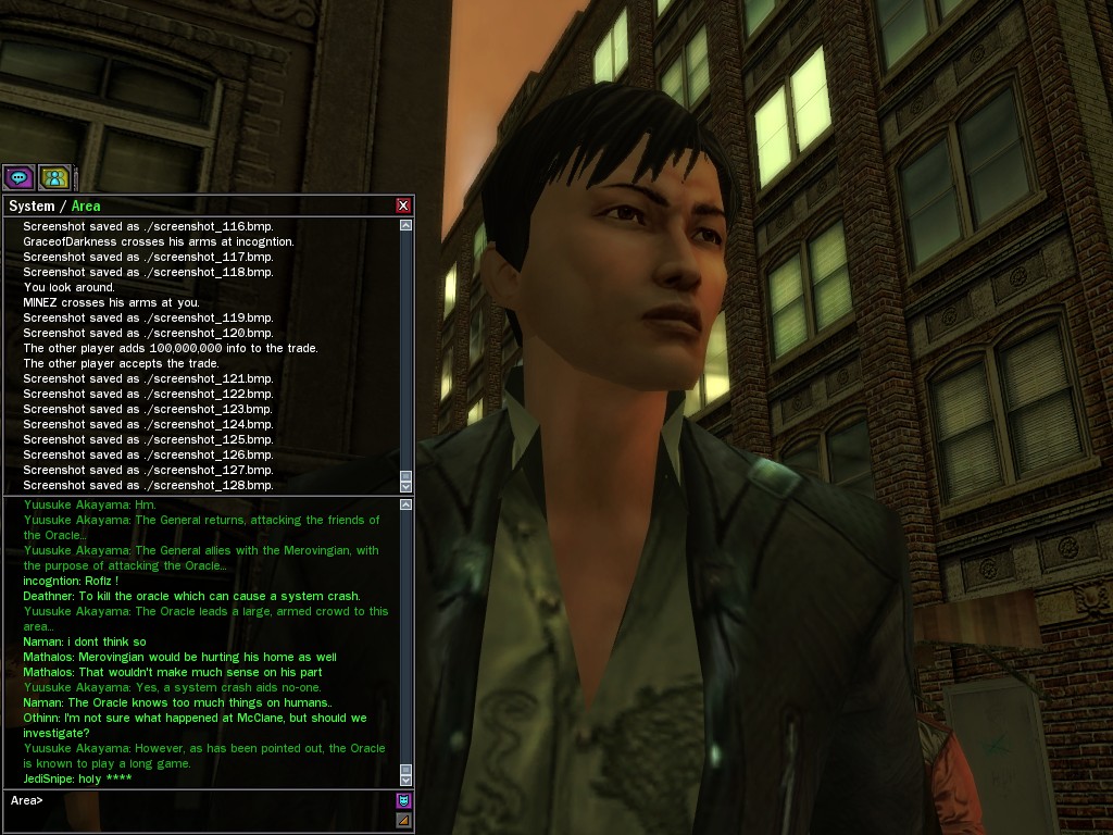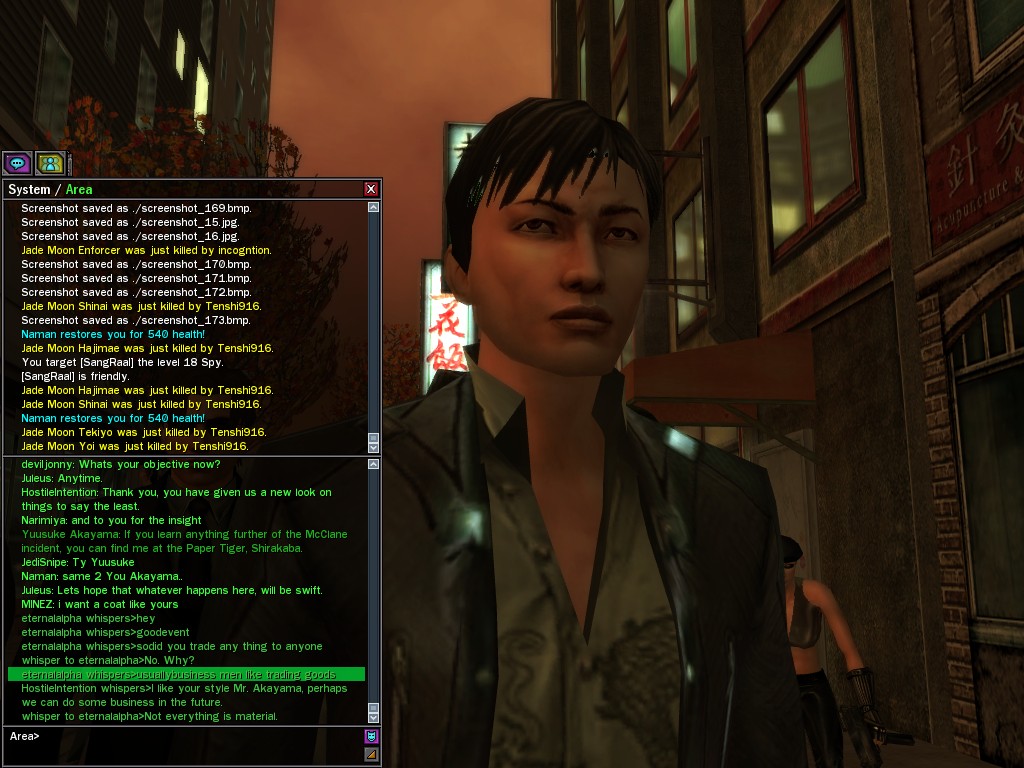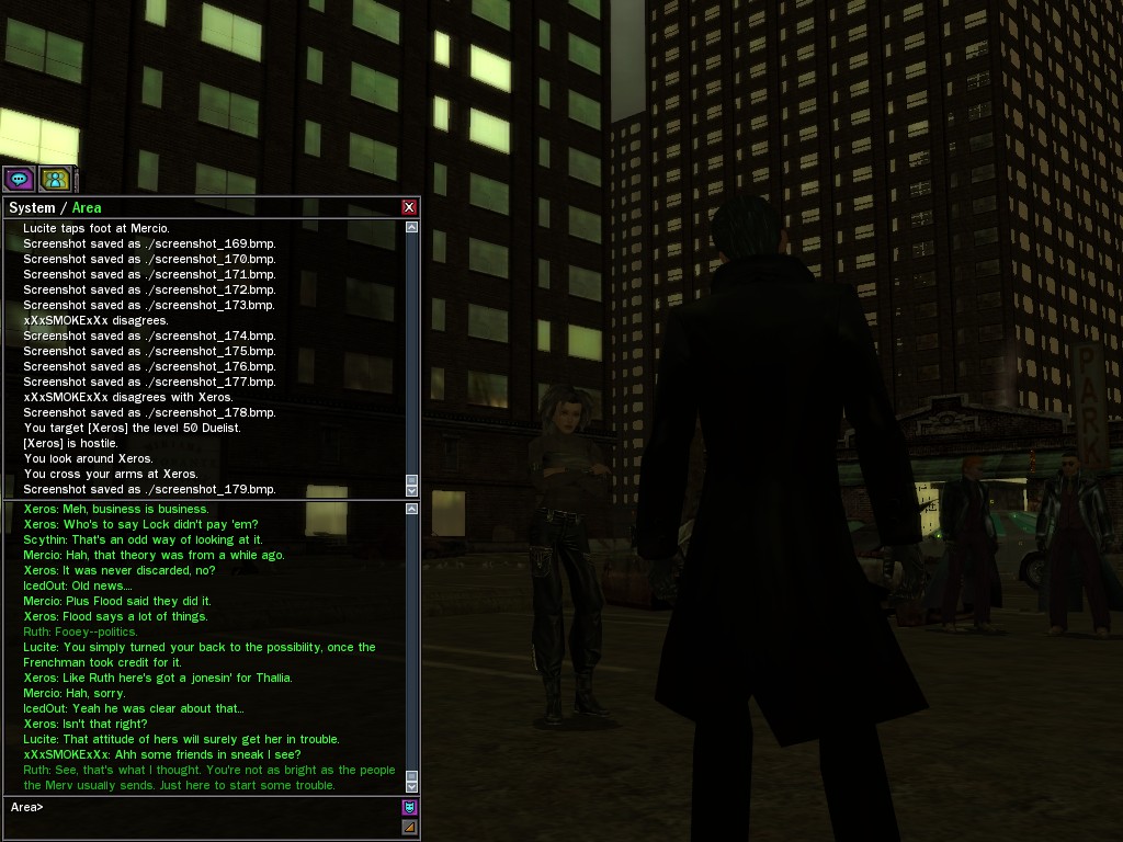 Excuse me. The Merovingian is offering a reward to the individual who locates two missing persons, both probably deceased. One was an employee of ours, on the trail of a scam artist who had defrauded our organization in office real estate dealings. Our employee was known to have a taste for Vietnamese noodles. It is suspected that he was done away with while stepping away from his work to indulge this habit in some exclusive, upper-story venue catering to the more...illegal ingredients in those dishes. His last report suggested that the scam artist was working with a local gang. As for the scam artist, it is rumored that he was killed by the leader of that gang's rival, having let his guard down after being lured into a compromising location not far from the leader's lair. That scam artist is the second person we wish located. The first clear photographs of both persons, sent to me via Private Message on the usual Data Node One exchange, and including the map display with the local coordinates, and an operative name showing in the upper right information window--the same name in both photos--will qualify for the reward, which will be sent to the operative whose name is shown. No incomplete evidence will be accepted. Your indulgence and discretion are appreciated.
