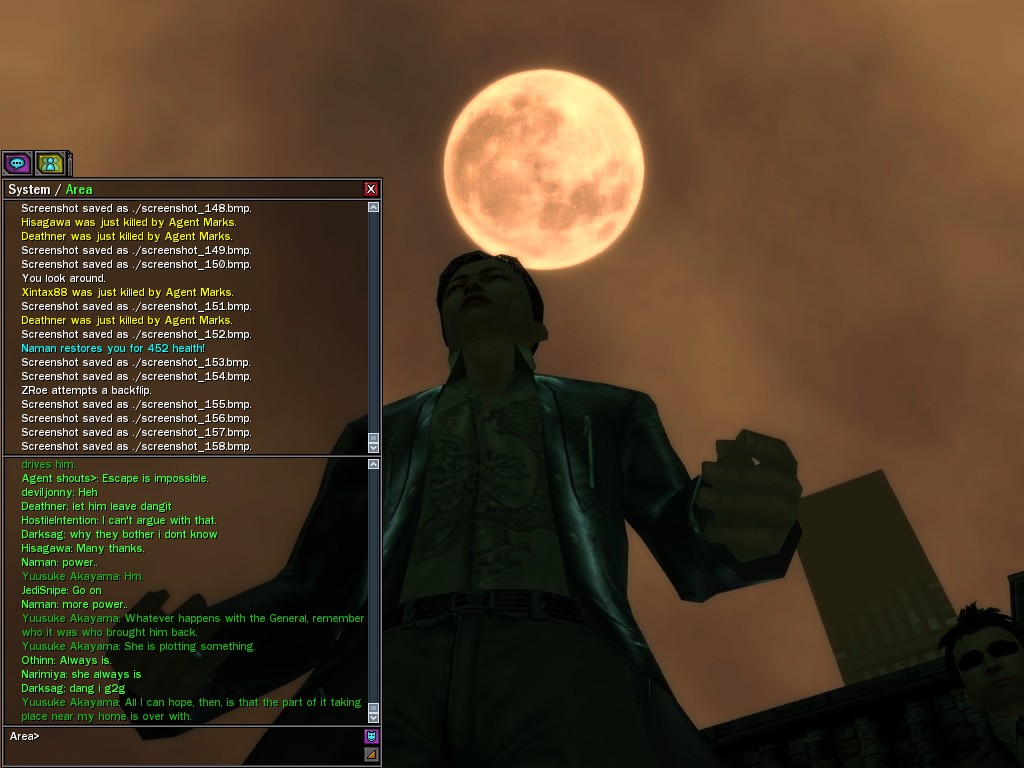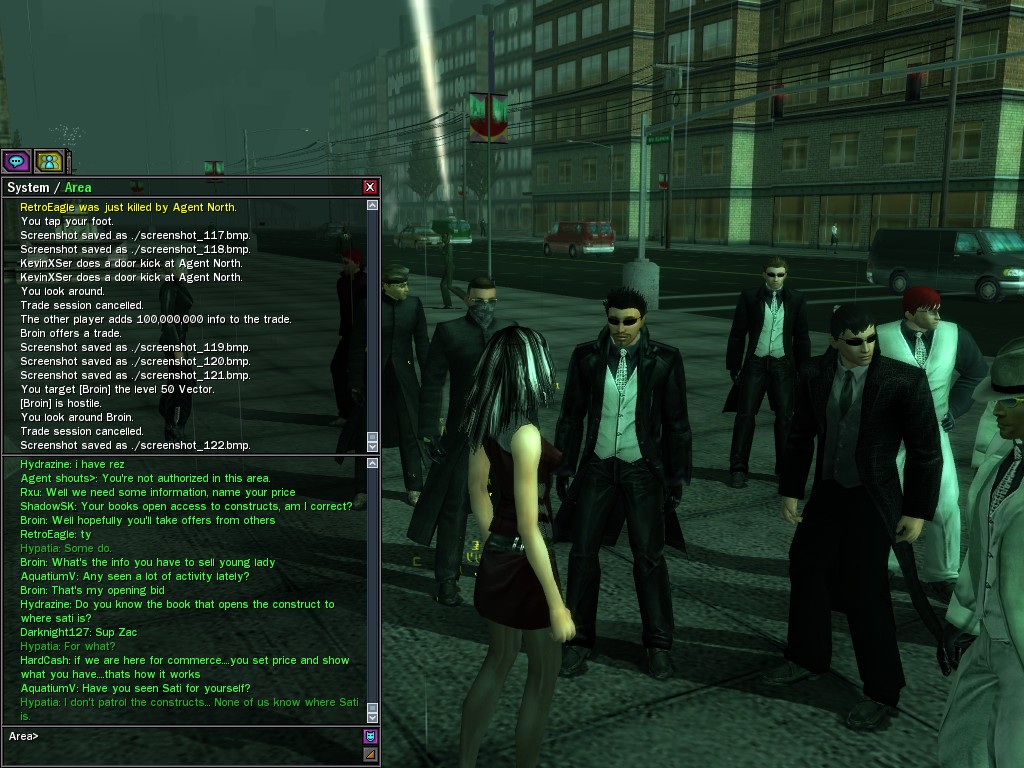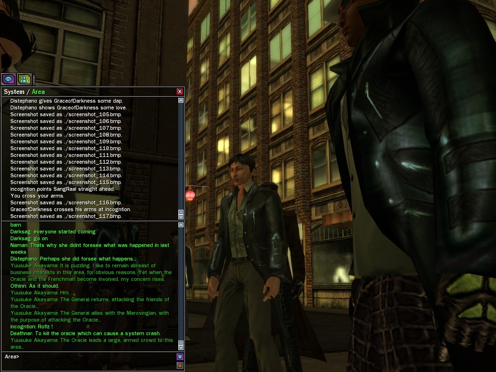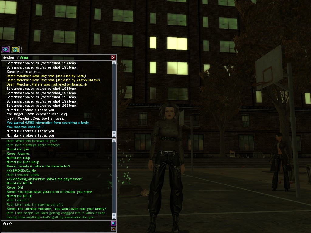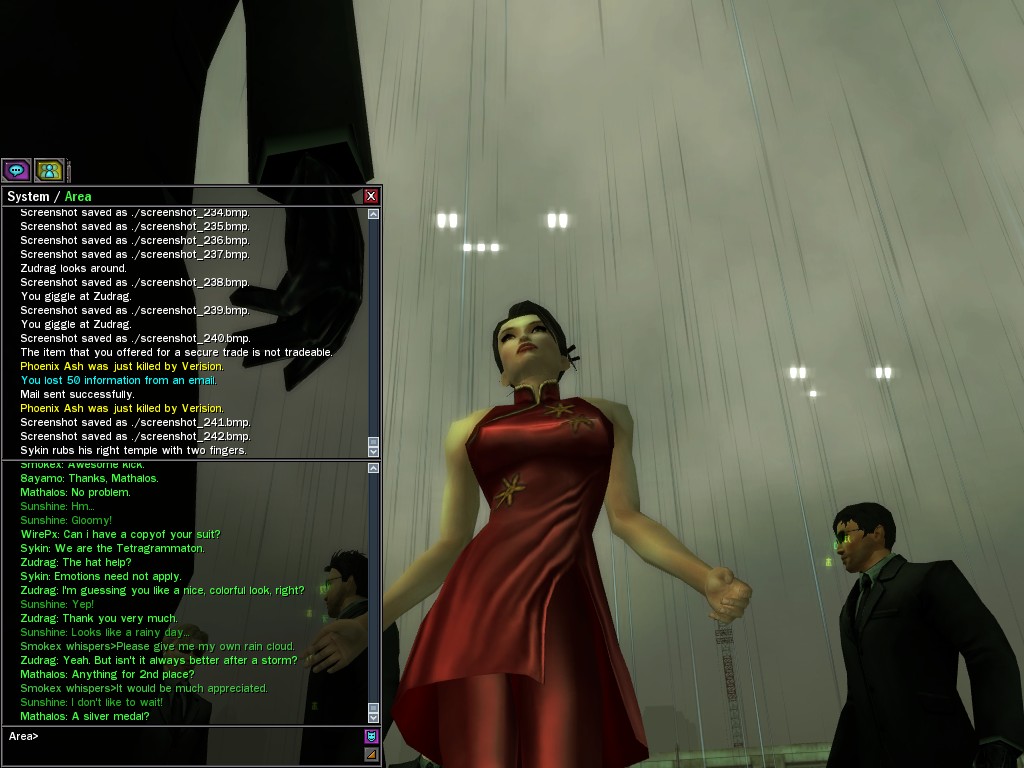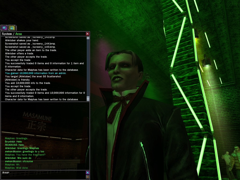 Excuse me. The Merovingian is offering a reward to the individual who locates two missing persons, both probably deceased. One was an employee of ours, on the trail of a scam artist who had defrauded our organization in office real estate dealings. Our employee was known to have a taste for Vietnamese noodles. It is suspected that he was done away with while stepping away from his work to indulge this habit in some exclusive, upper-story venue catering to the more...illegal ingredients in those dishes. His last report suggested that the scam artist was working with a local gang. As for the scam artist, it is rumored that he was killed by the leader of that gang's rival, having let his guard down after being lured into a compromising location not far from the leader's lair. That scam artist is the second person we wish located. The first clear photographs of both persons, sent to me via Private Message on the usual Data Node One exchange, and including the map display with the local coordinates, and an operative name showing in the upper right information window--the same name in both photos--will qualify for the reward, which will be sent to the operative whose name is shown. No incomplete evidence will be accepted. Your indulgence and discretion are appreciated.