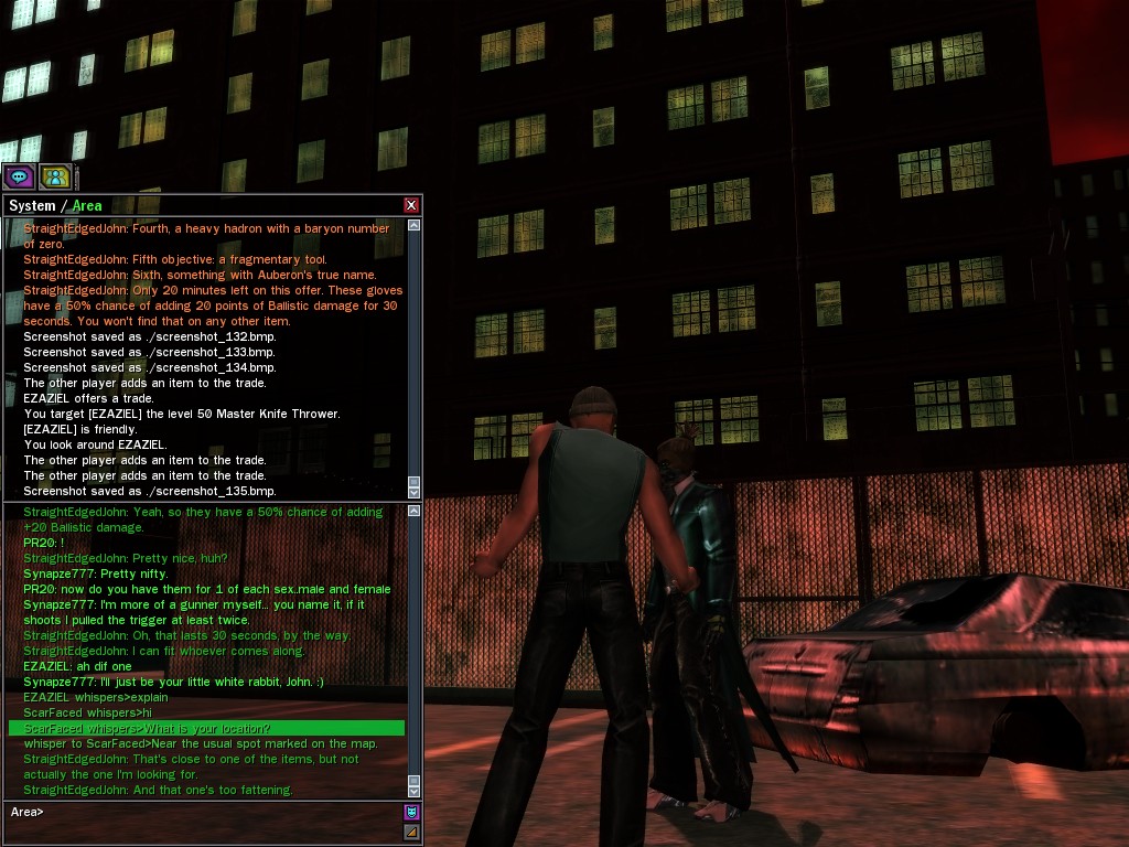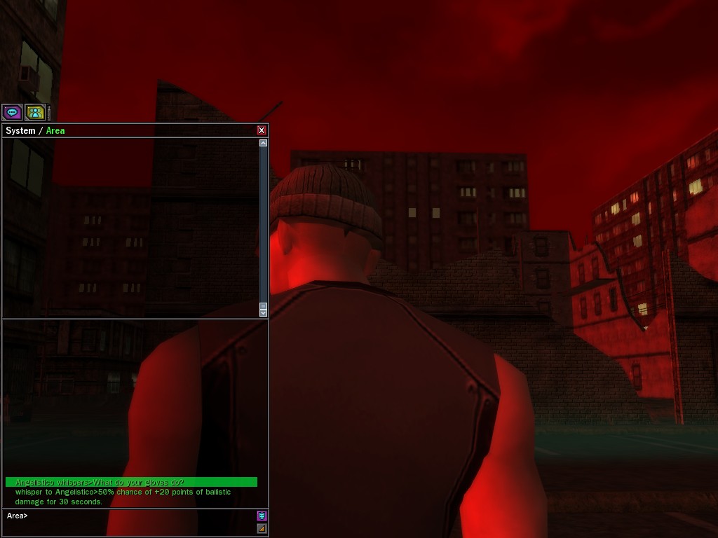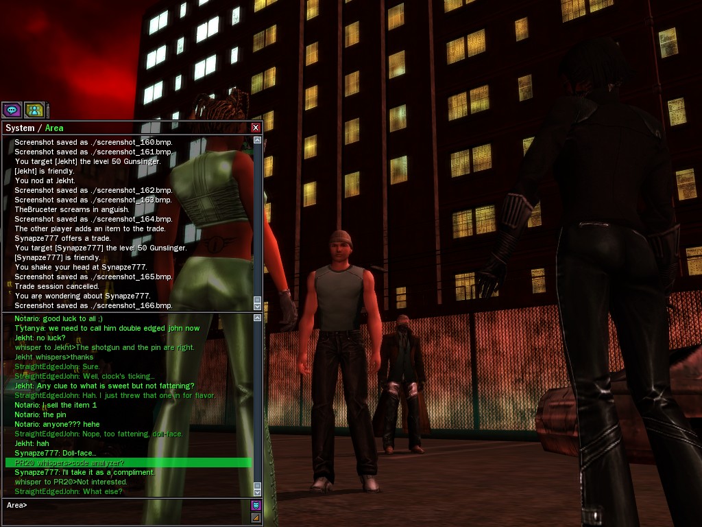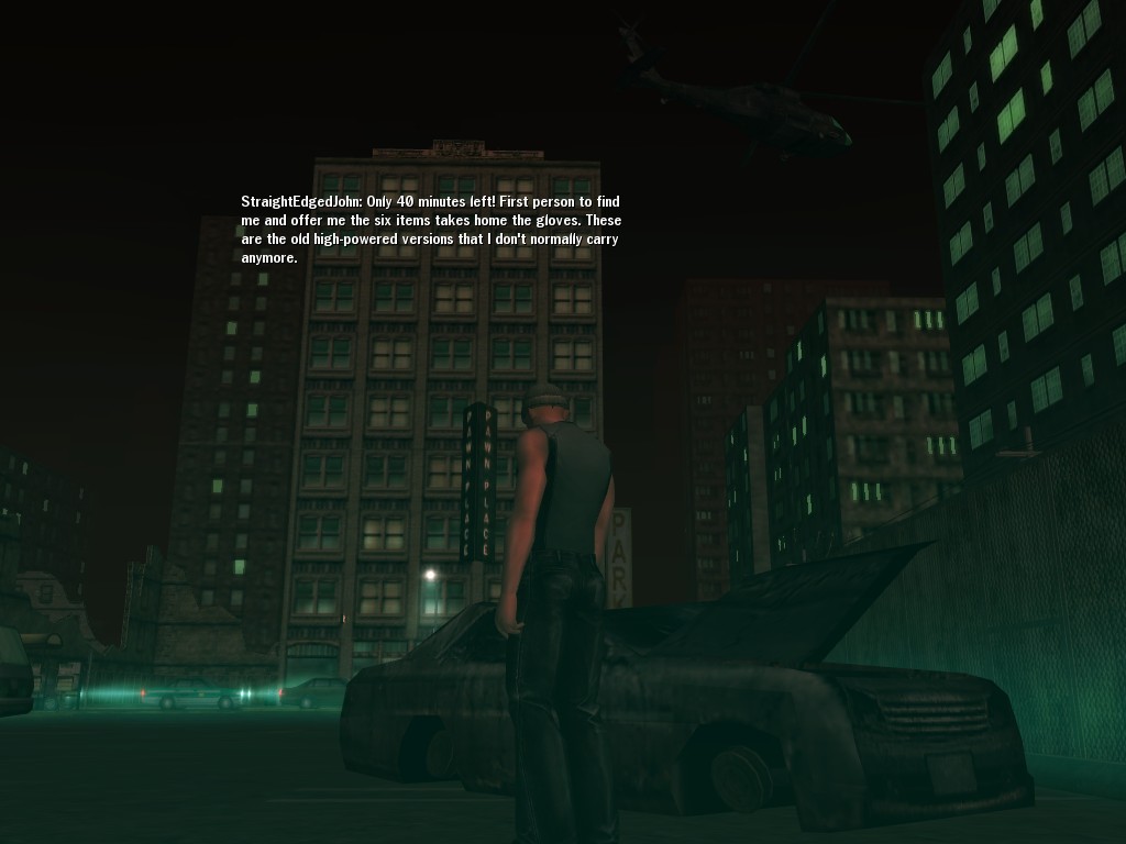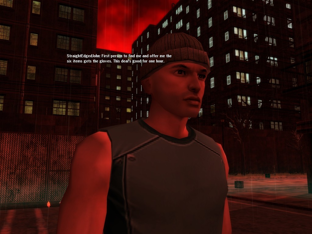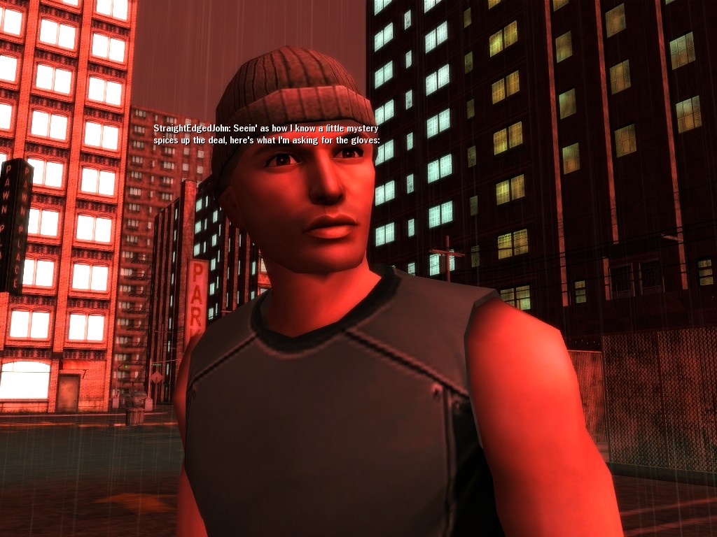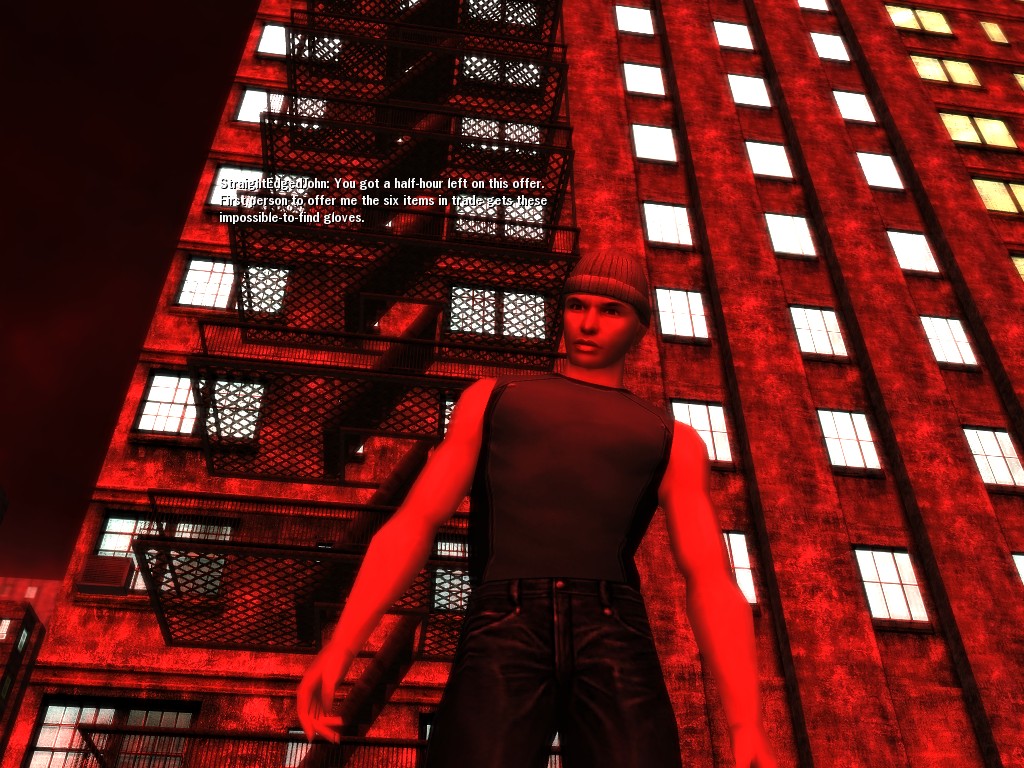 The revenge--or is it profit?--seeking Bathary Boy, StraightEdgedJohn, sent out a server-wide offer about an old version of his "Pugilist's Gloves"; it appears that he still has a pair from the old mold that was later deemed too dangerous, and banned by the Machines. It seems that desire for a quick profit--in the form of some unorthodox items--has inspired John to risk trade sanctions on his Gracy Heights turf.