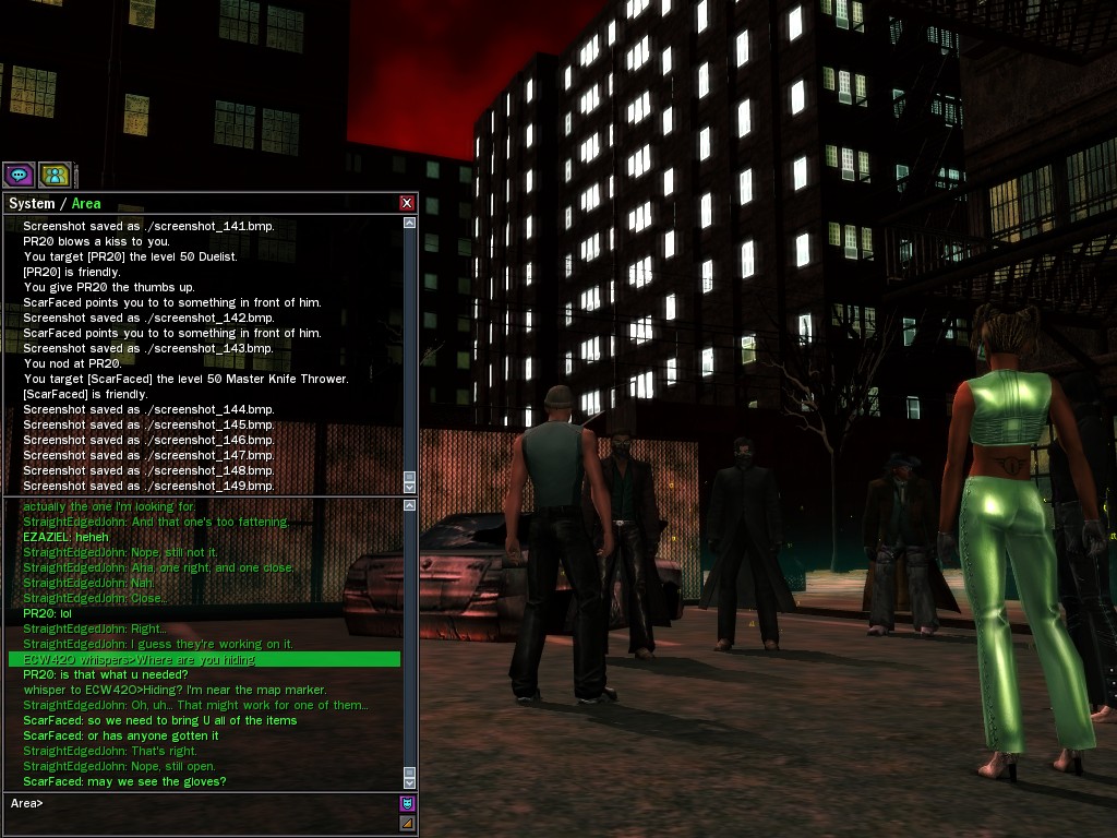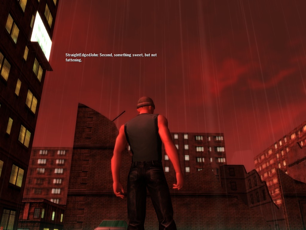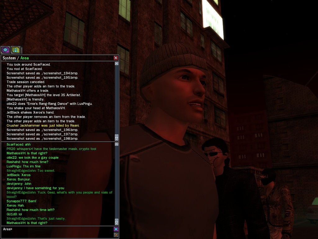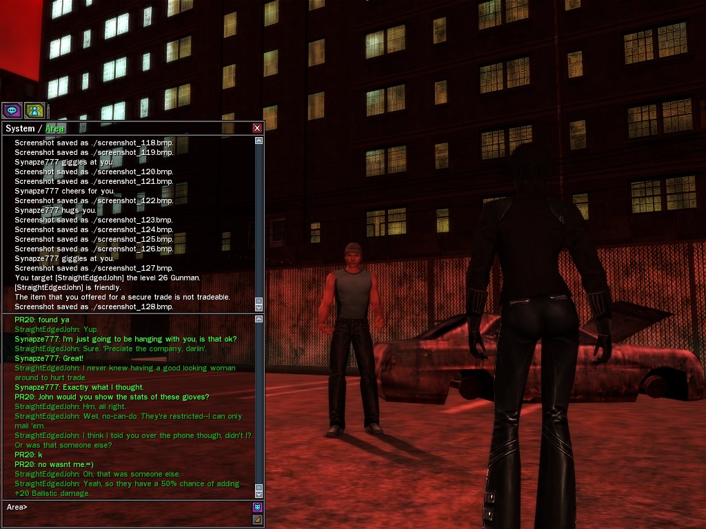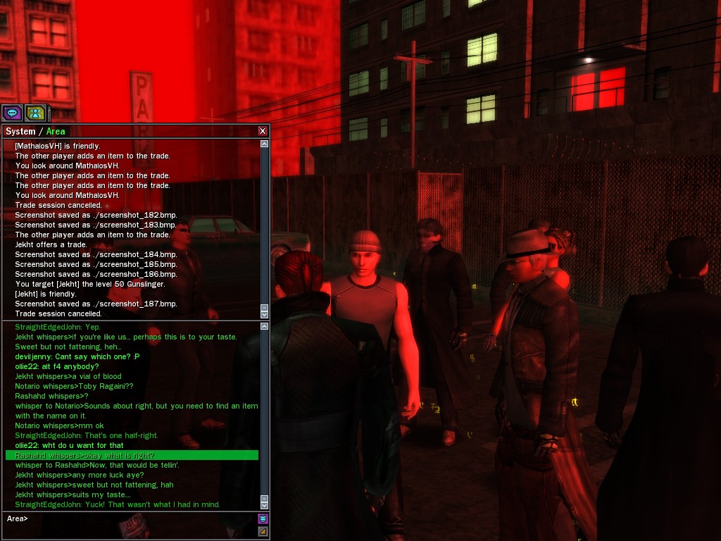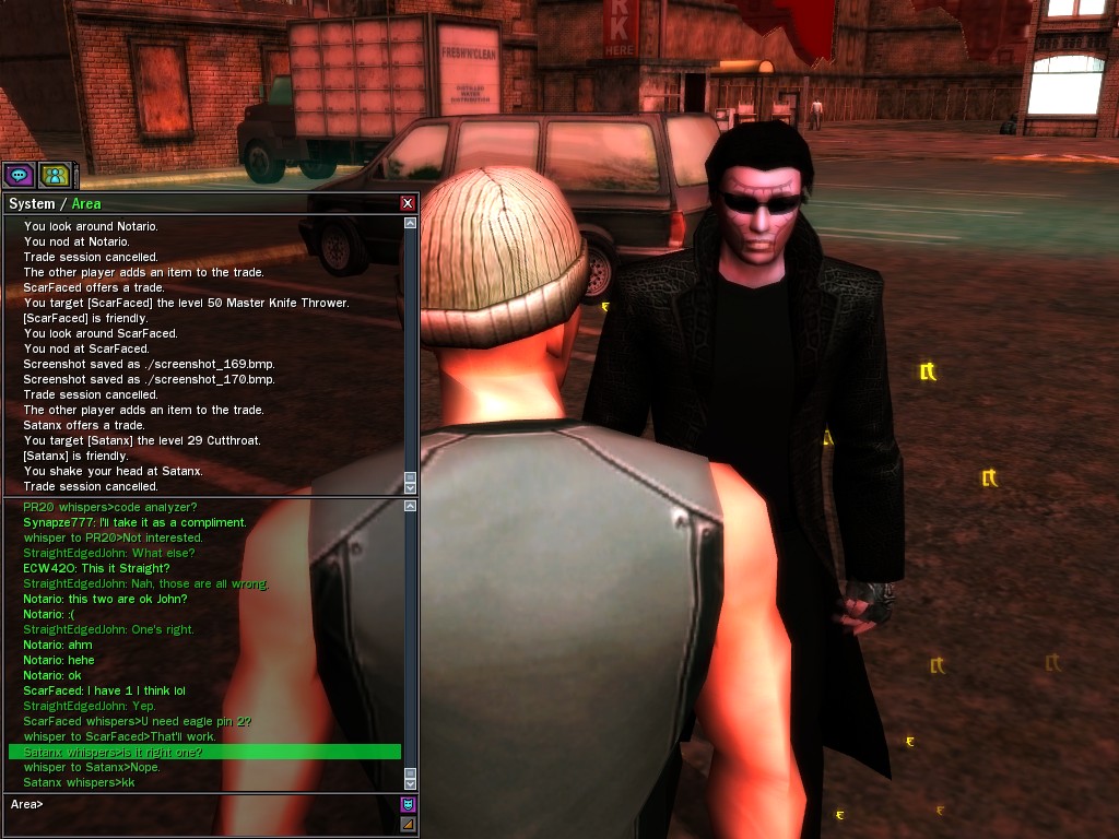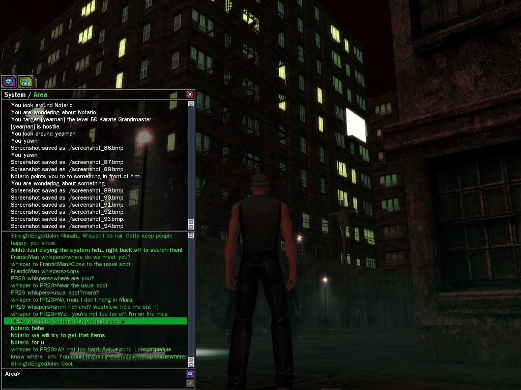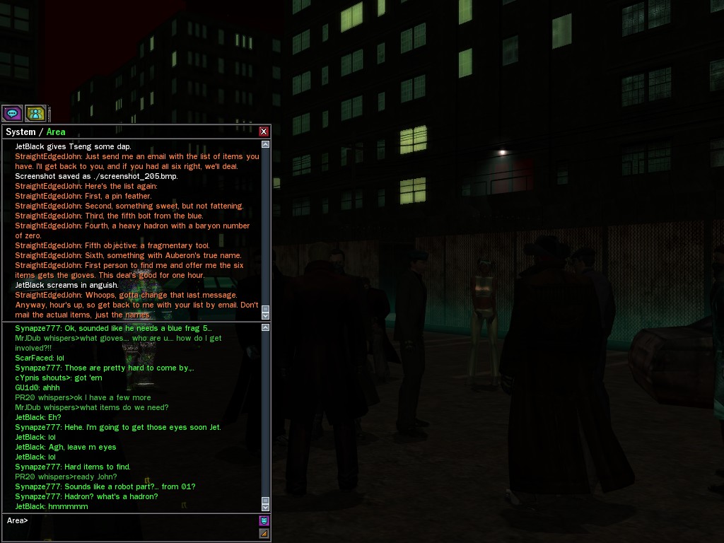 The revenge--or is it profit?--seeking Bathary Boy, StraightEdgedJohn, sent out a server-wide offer about an old version of his "Pugilist's Gloves"; it appears that he still has a pair from the old mold that was later deemed too dangerous, and banned by the Machines. It seems that desire for a quick profit--in the form of some unorthodox items--has inspired John to risk trade sanctions on his Gracy Heights turf.