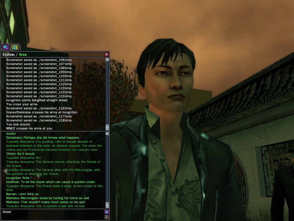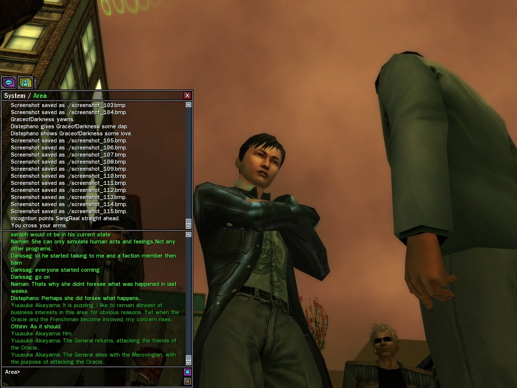 The Shirakaba businessman Yuusuke Akayama has been nosing about; he evinces concern about the possibility of current events disrupting his profits. This concern is prudent; his rambling conspiracy theories about the Oracle, however, are somewhat less productive in his line of work. It suffices that she resists the Merovingian's will. I shall have to have one of our people suggest to Mr. Akayama that he concentrate on minding his shop, and leave speculation on motives and purpose to those more qualified.