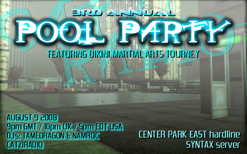 2pm Pacific - 3pm Mountain - 4pm Central - 5pm East ** 9pm GMT / 10pm BST come downtown and cool off in the pool this saturday. rez and recall available. * Bikini Martial Arts Tourny (no clothes, no heals, just ma's) No Entry Fees $50 million first $20 milliion second $5 million 3rd * /radio play http://Catzi.serverroom.us:6770 . CatziRadio Schedule