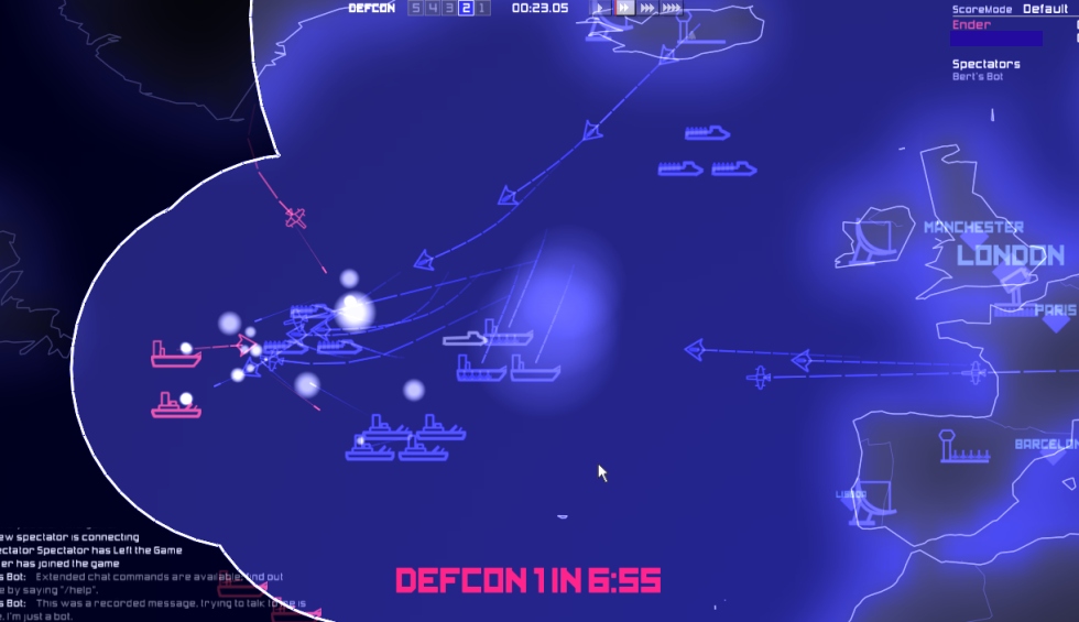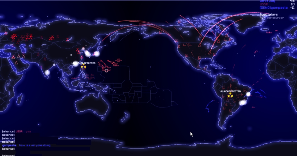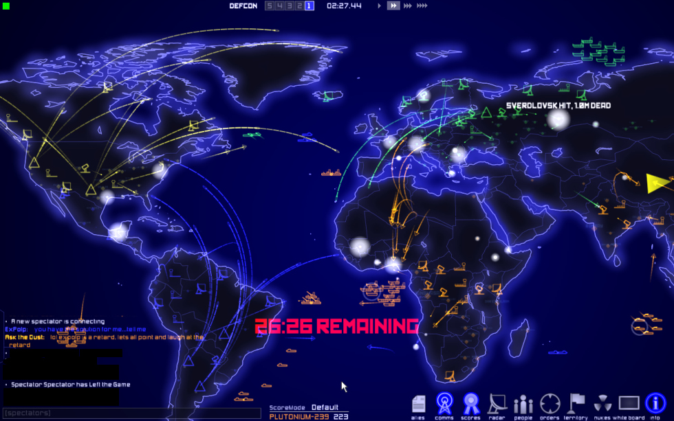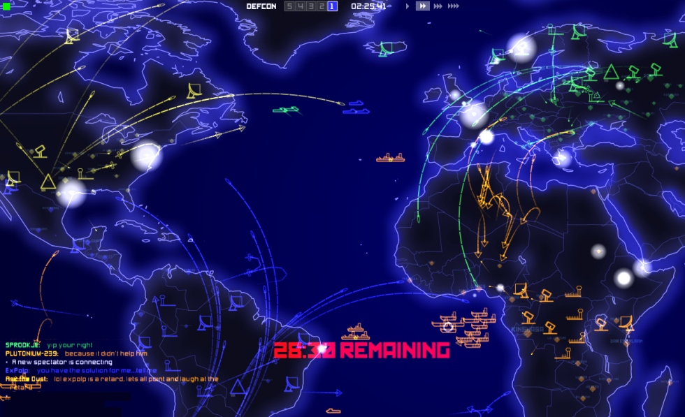 You are going to love this one. Based off the 1983 movie Wargames,        It's a real time Strategy game, up to six sides can play at once. They have chosen to keep the units simple and make it really easy to command your units and launch nasties. The air units consist of Bombers and Fighters. The Boats consist of Carriers, Battleships and Submarines. The land structures you can deploy are Silos, Radars & Airbases. All have a specific purpose. The game play works as Defcon levels, at Defcon 5 and 4 you must place your units and structures, get your boats into place. At Defcon 3 you can launch planes and at Defcon 1 it's possible to launch Nukes (from Silos, Planes or Submarines) Structures: *Silos automatically defend against incoming Planes and Nukes. Putting them into launch mode temporarily disables the defense function. (around 6 can be placed) *Radars give you circular view at the edge or center of your land. Can see strategy possibilities here. (around 6 can be placed, depending on game mode) *Airbases let you launch fighter and bomber planes, these can also be destroyed. Planes can land back at the airbase, provided they have enough fuel. (around 4 can be placed) Units: *Planes have a fuel radius indicated by a blue circle when you select them. This is their fuel estimate. If you don't have enough fuel to land at the airbase you better hope there is an aircraft carrier around. Bombers are slower, have allot of fuel, are good against ground targets and boats. Fighters are quicker, have a short amount of fuel, and are effective against Planes and other targets. *Battleships are mainly for see scuffles, Carriers can launch and re-fuel planes, they also have submarine detection and depth charges. Submarines can't give you radar data but can fire nukes, detected when in fire mode. Population: The other blips you may notice are cities, population is listed for each city, points are scored for eliminating residents with nuke and air strikes. KK where!? You can download and play this game right now, it's around 58mb in size and comes with a Demo mode, only one demo player per war game is permitted. If you like it and plan to do lots of multi player you can register for around 20bux (one time charge). This is a fun game that doesn't take allot of time, it's good for people who don't have time for two MMO's but want a different multi player game. http://www.everybody-dies.com windows, linux, mac. (note, if you have issues goto their forums, router/firewall rules might need to be modified)