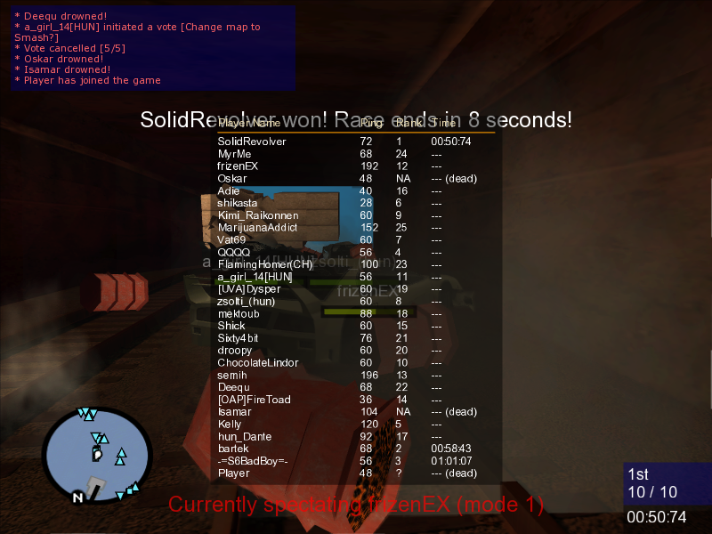 I was just wondering if anyone from the MxO community plays GTA:SA online as if on the very short times I am not here, I am sometimes there. I will just pick a screen, and random one, this one will do, a screen of a race that just finished and I came in first, 8 seconds before second place