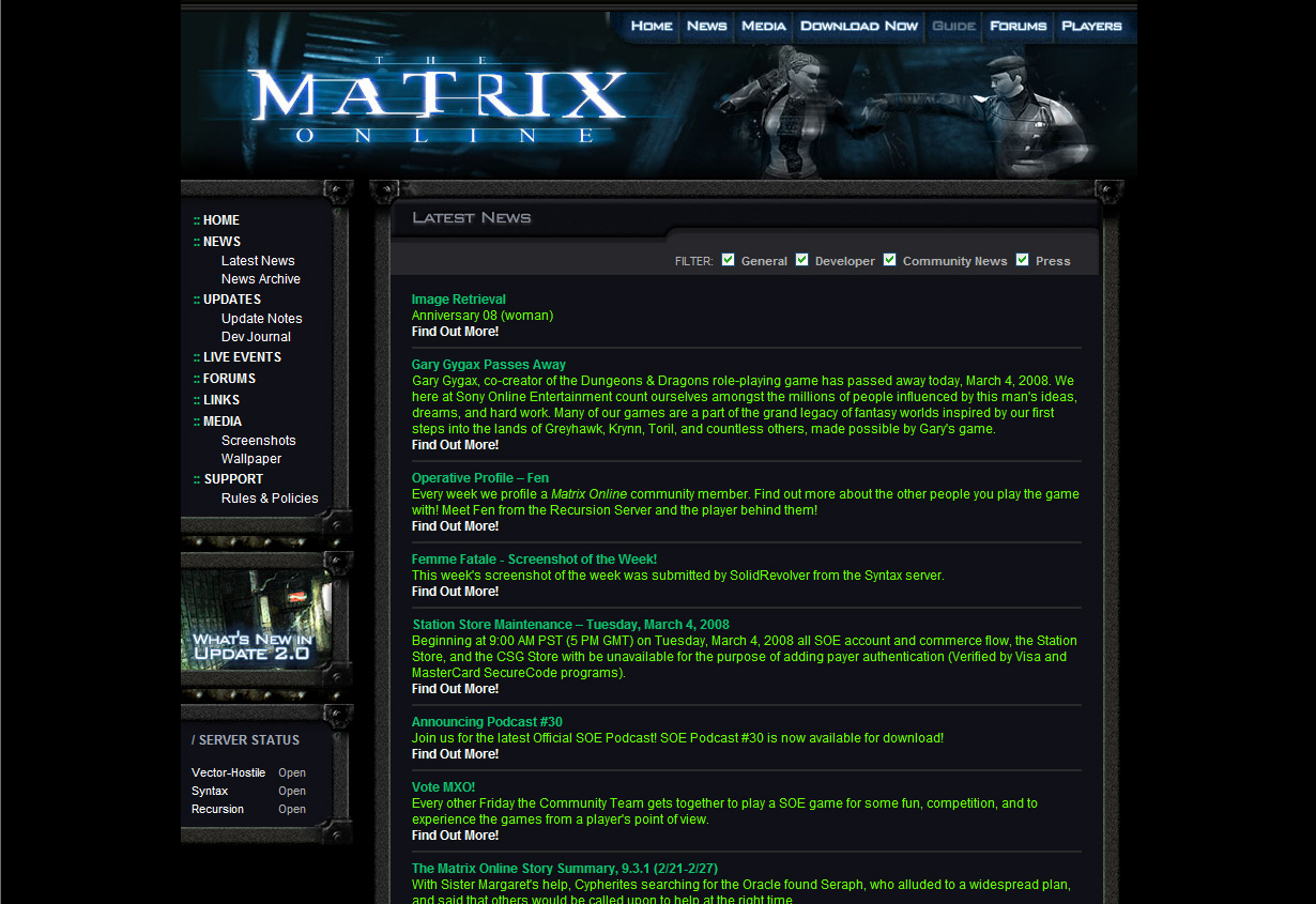 Okay, I asked about this in the Dev Roundtable. I asked about it in Virrago's MxO Community thread. Since no one here seems to be able to do much about our website, I'd like to know to whom we should direct our correspondence to ask/beg/harrass about improving the game's http://thematrixonline.station.sony.com/players/site? Cause this: