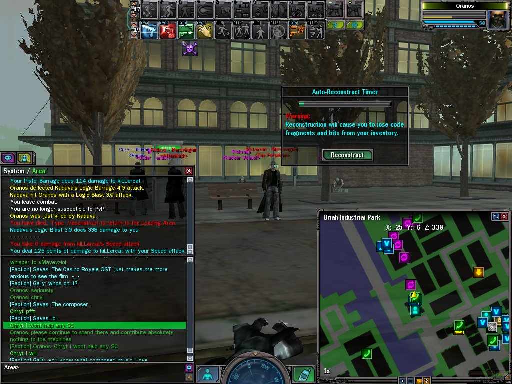 So I go to Mara, which is the village bicycle of PvP, and begin to fight. I end up getting tag teamed by a Zion and a Merv while a former-factionmate just watches, and rezzes them each time they die, and a lowbie in another Machine faction insults me. Then the reds, each of which I killed, insult me too. I know I'm just going to get flamed, but hell I felt like venting.