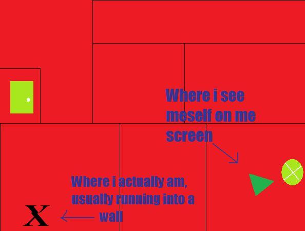 As it turns out, i'm actually not where i appear to be on my screen, or where my map shows me as being, i'm stuck somewhere else running up against a wall (though occasionaly just standing there). Here's a detailed technical drawing to illustrate -