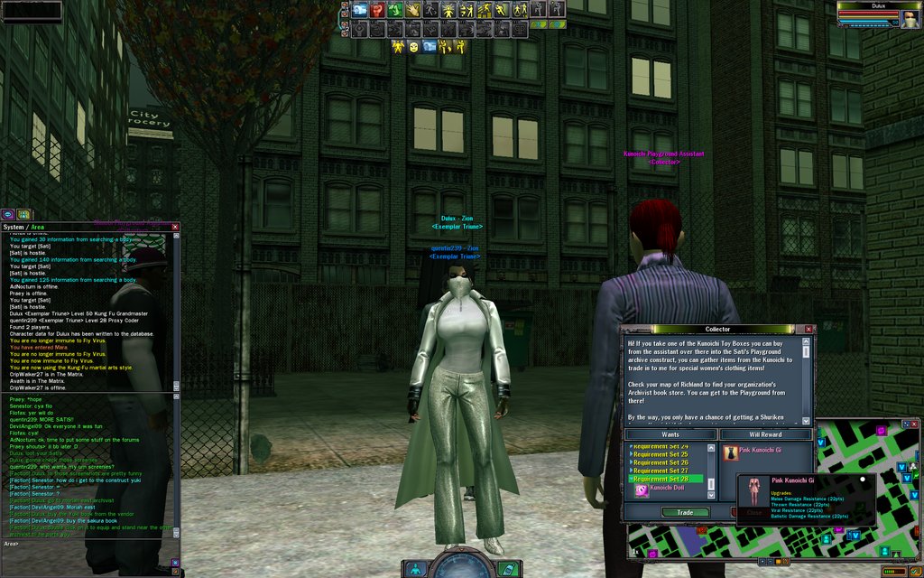 Anywho, i'm currently still with my zion faction as i don't know too many machines at the moment, and it's a good way to keep in touch with them, but am looking to spread my wings a bit and join in with the machine community i.e meetings, liasons, other faction and also any others who are missioning cause i'm kinda stuck doing archives at the moment cause i hate missioning solo (also haven't hit 25 yet and really need hyper speed), and currently any time i've come across any machines in game and asked 'is anyone doing any missions?' i get the old 'lets pretend she's not talking to us manouever' (or maybe it's cause my tag says Zion they might not think i'm talking to them, who knows).
