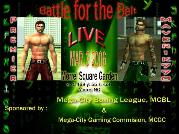On March 3rd, 2006 we will see two of our fellow Recursionists duke it out for fame and glory. The title fight. All is on the line...they have nothing to lose and everything to gain. As CEO of The Mega-City Boxing League and Chariman of The Mega-City Gaming Commission I present to you......