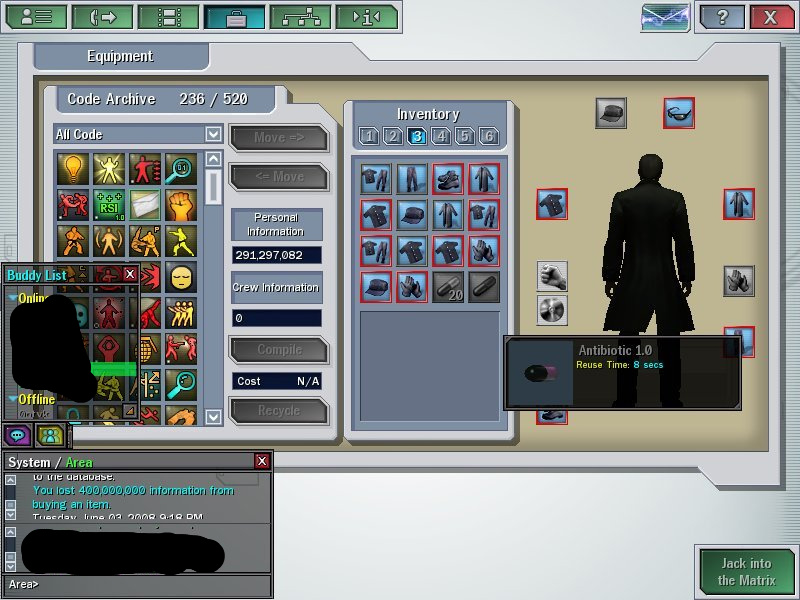 The market on recursion is so out of whack. The other day I was going through the marketplace in order to check the prices on health pills, I hit the "go to" button for the consumable pills and my computer froze, when it stopped I hit the "go to" button again, but the game got lagged or SOMETHING because I actually hit the "buy" button and purchased the first item on the list....which happened to be a 400,000,000 $info Antibiotic 1.0 All I have to say is...WOW....Obviously this was a setup for someone who would screw up (like I did) with enough cash to make the purchase. So I submitted a /ccr in the hopes of POSSIBLY being reimbursed of the $info, but no luck. They said that it's impossible to trace where the item came from so I'm screwed out of 400,000,000 $info that took me about 4 years to make (i don't do anything but missions).