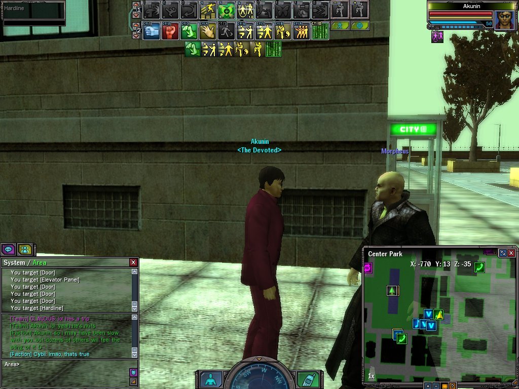 Okay, I'm downtown at Club Janus. I come out of the club to go to the HL and there is Morpheus. At first all I could see was his back and his name...I thought it was some noob with the name so I go to his front...and BOOM it's ACTUALLY the real Morpheus. I hit f12 as soon as I could, and got this pic. When I went to talk to him he just vanished...slow computer. I swear on my life this is not doctored or anything. Check it out.