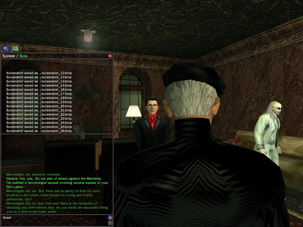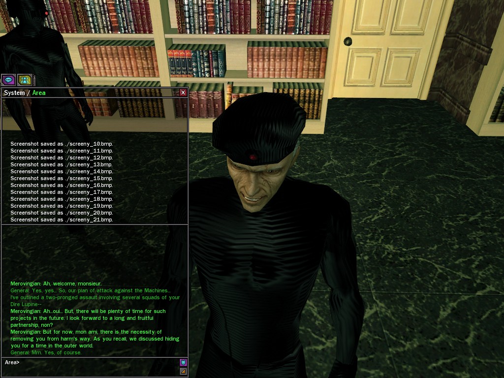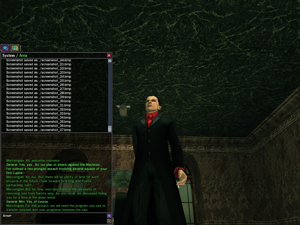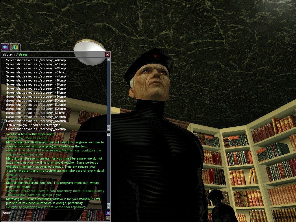 To those who say such ungenerous things, I reply that, in my experience, the General has shown himself to be an eminently reasonable man. He has made every effort to cooperate while in the most grievous of circumstances. Par exemple, he has willingly given us the use of his program that transfers his soldiers between the two worlds, as he realizes that with the use of this tool, it is in our power to save the lives of his loyal men. Is this the act of an irrational being, mes amis? Certainement pas. Monsieur le Général follows the course dictated by his instincts of true leadership, for which I salute him. Au revoir, The Merovingian
