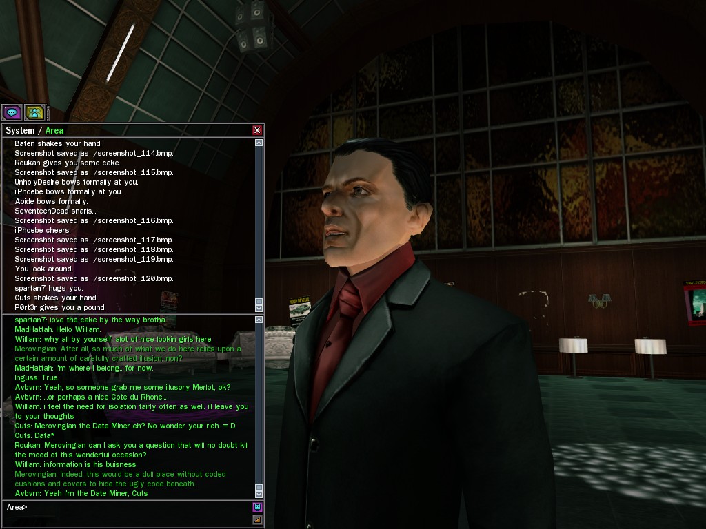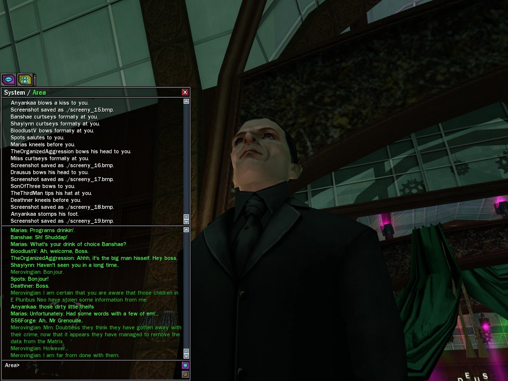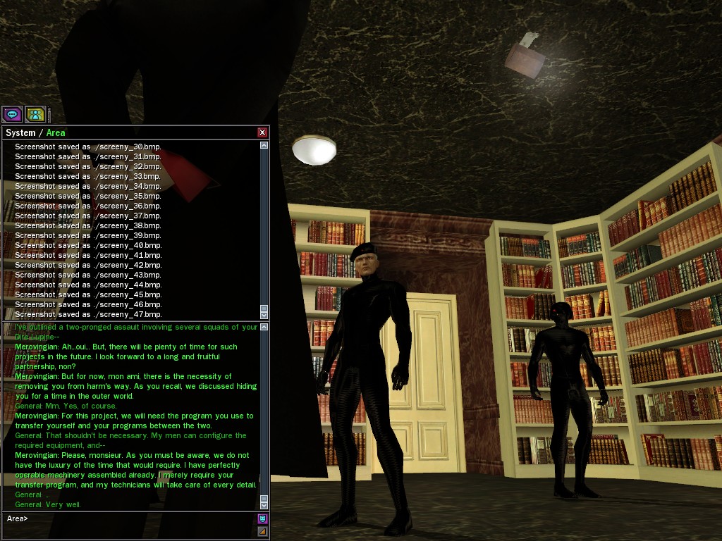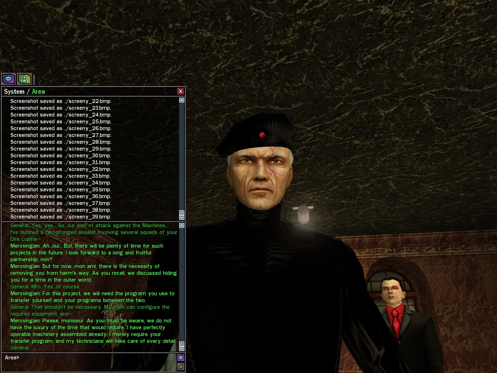 To those who say such ungenerous things, I reply that, in my experience, the General has shown himself to be an eminently reasonable man. He has made every effort to cooperate while in the most grievous of circumstances. Par exemple, he has willingly given us the use of his program that transfers his soldiers between the two worlds, as he realizes that with the use of this tool, it is in our power to save the lives of his loyal men. Is this the act of an irrational being, mes amis? Certainement pas. Monsieur le Général follows the course dictated by his instincts of true leadership, for which I salute him. Au revoir, The Merovingian