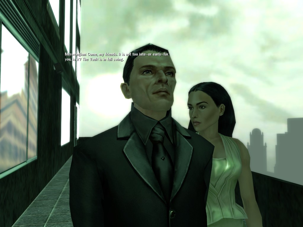 Despite the outbreak of the Machines' much-vaunted "war" against the cave-dwellers, our power base remains as strong as ever. Our many allies realize that while man and machine have proven unreliable, our own organization continues to prove its power and profitability. À bientôt, The Merovingian