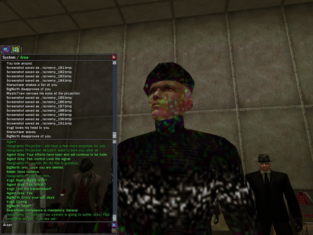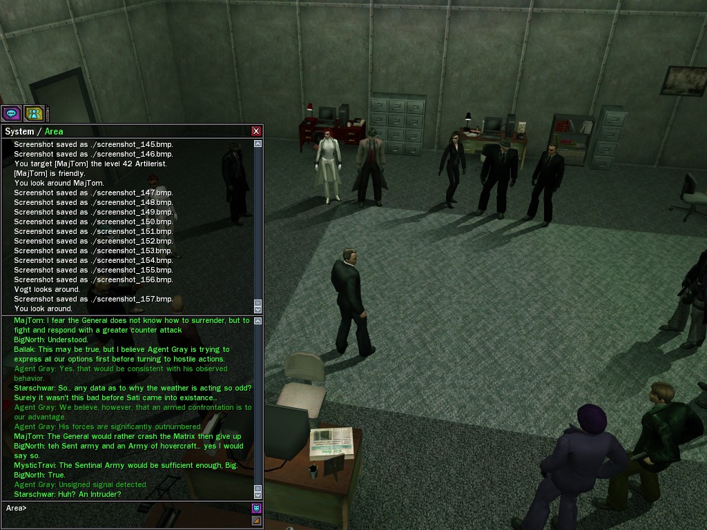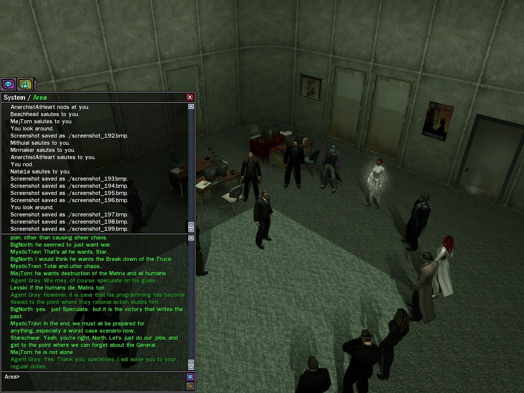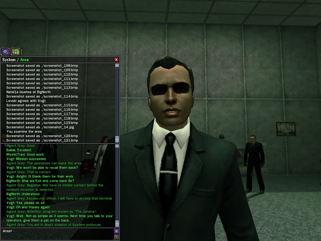 The General's base of operations within the Matrix has been detected and neutralized, along with many of his combat programs. This in effect marks an end to his military threat within the System. Be aware that the group of Exiles known as "Project Nine" were found to be assisting the General at his base location. Although their leader, Colonel Strong, was terminated by operative deviljonny, we must anticipate that they have backup programs prepared. Their activities are to be monitored carefully. Efficiently, Agent Gray