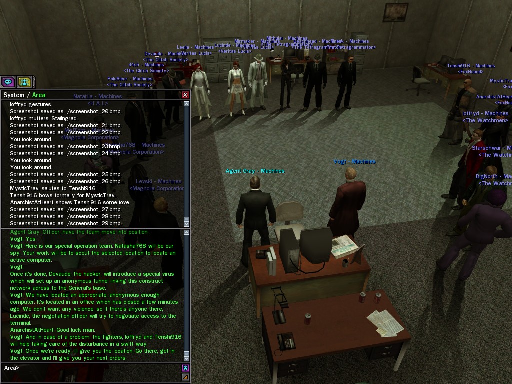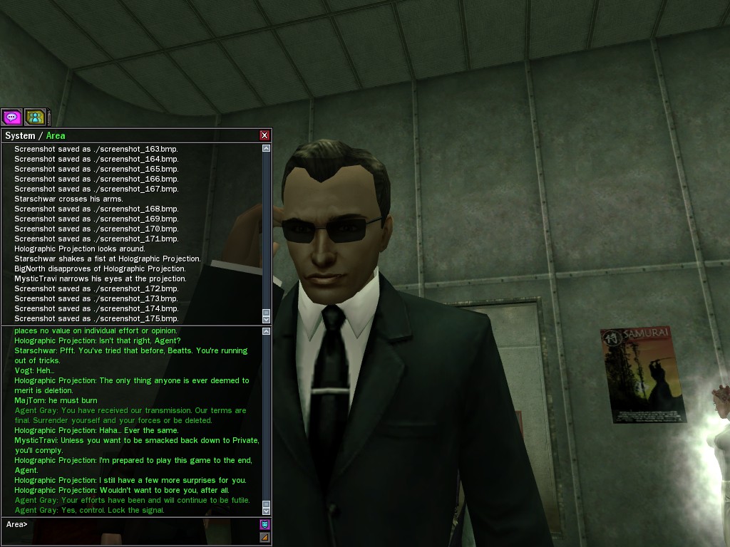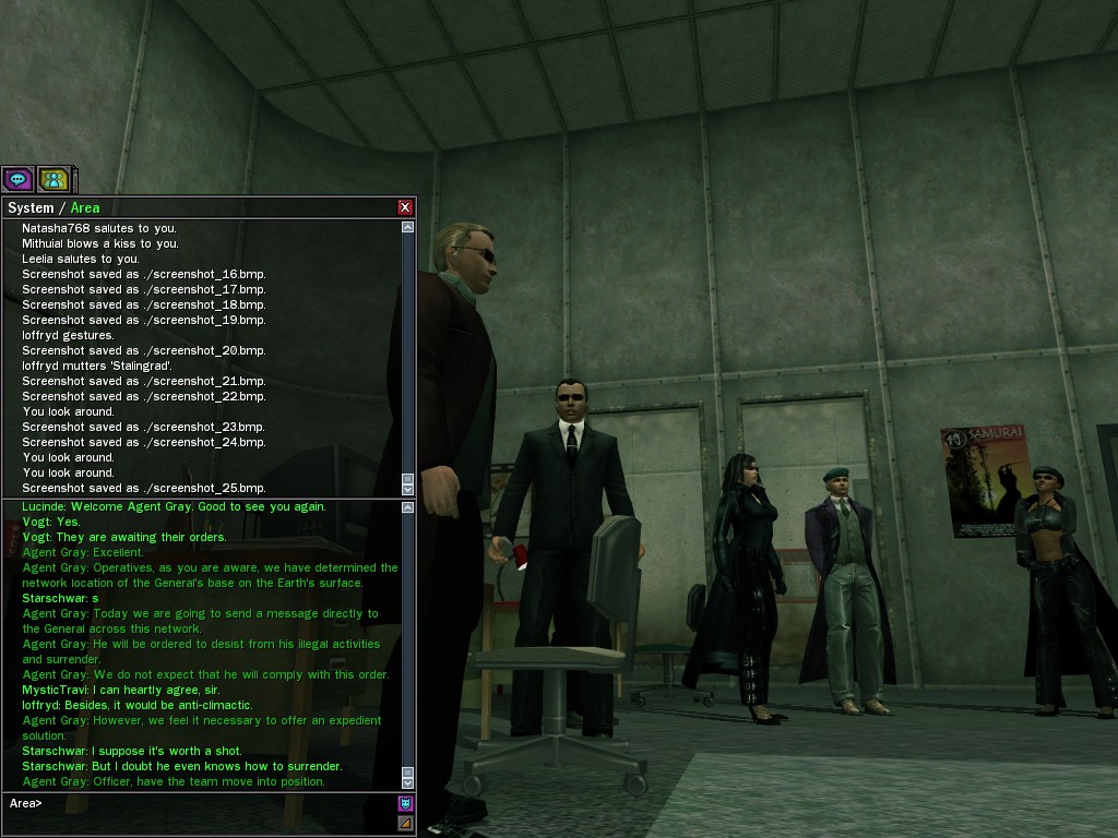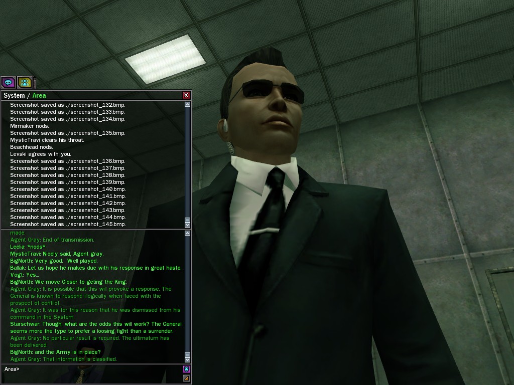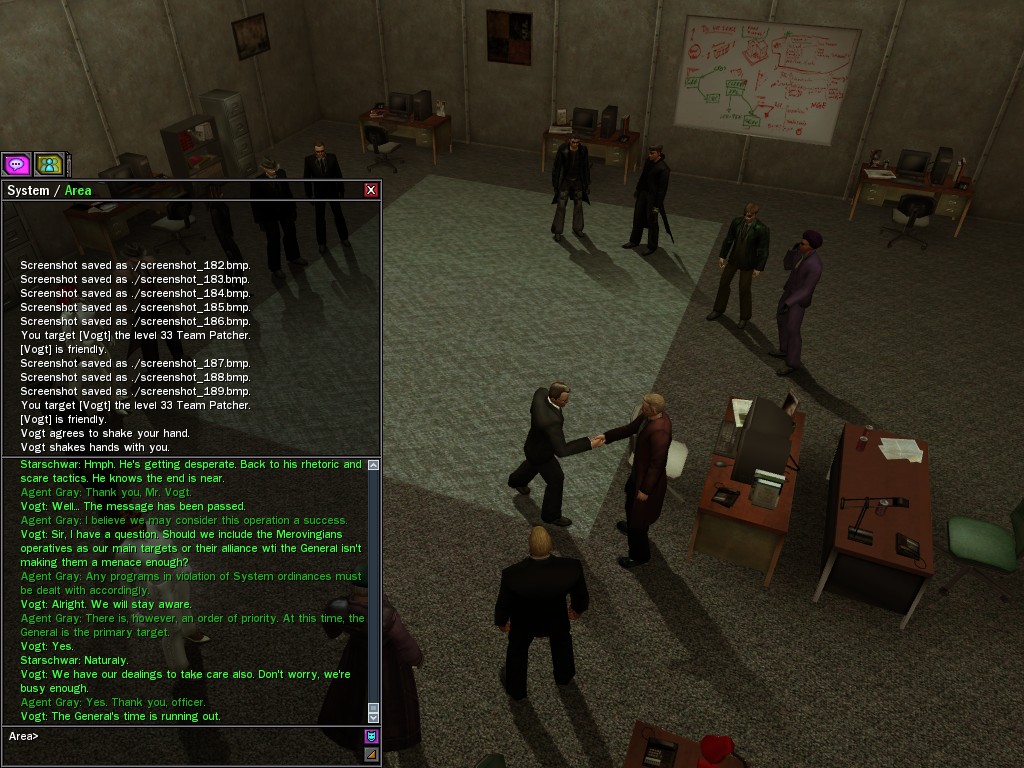 The General's base of operations within the Matrix has been detected and neutralized, along with many of his combat programs. This in effect marks an end to his military threat within the System. Be aware that the group of Exiles known as "Project Nine" were found to be assisting the General at his base location. Although their leader, Colonel Strong, was terminated by operative deviljonny, we must anticipate that they have backup programs prepared. Their activities are to be monitored carefully. Efficiently, Agent Gray