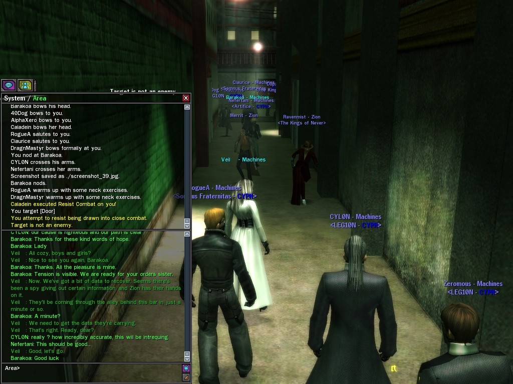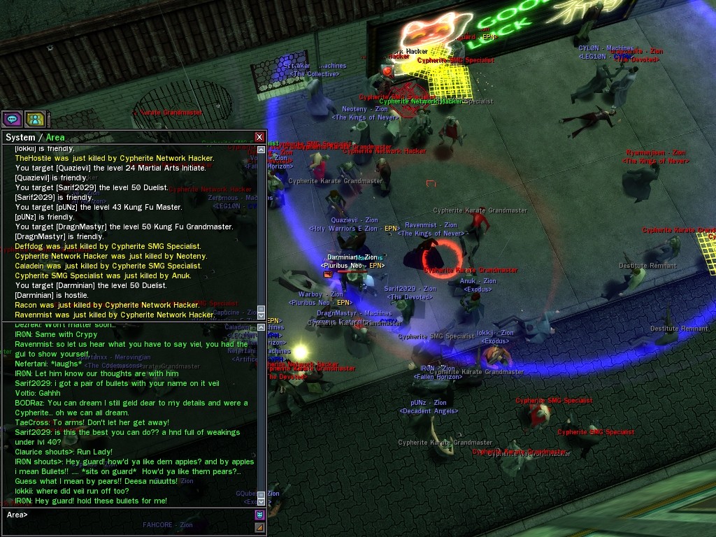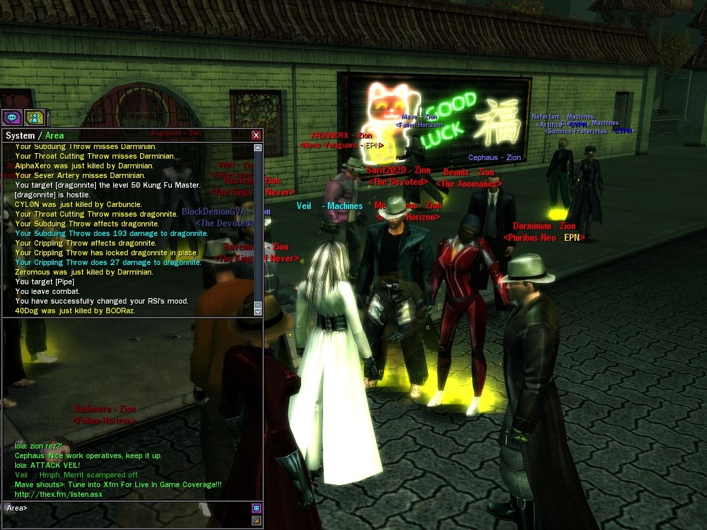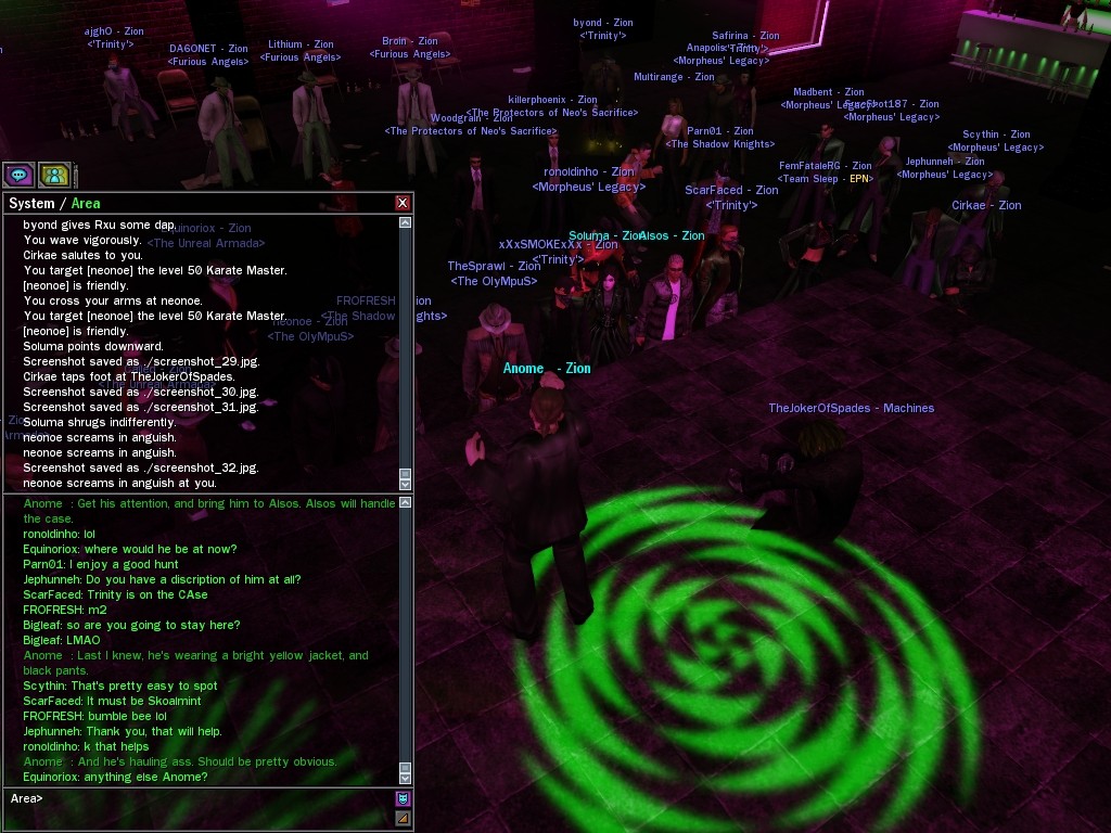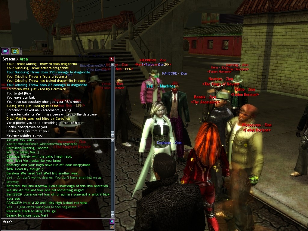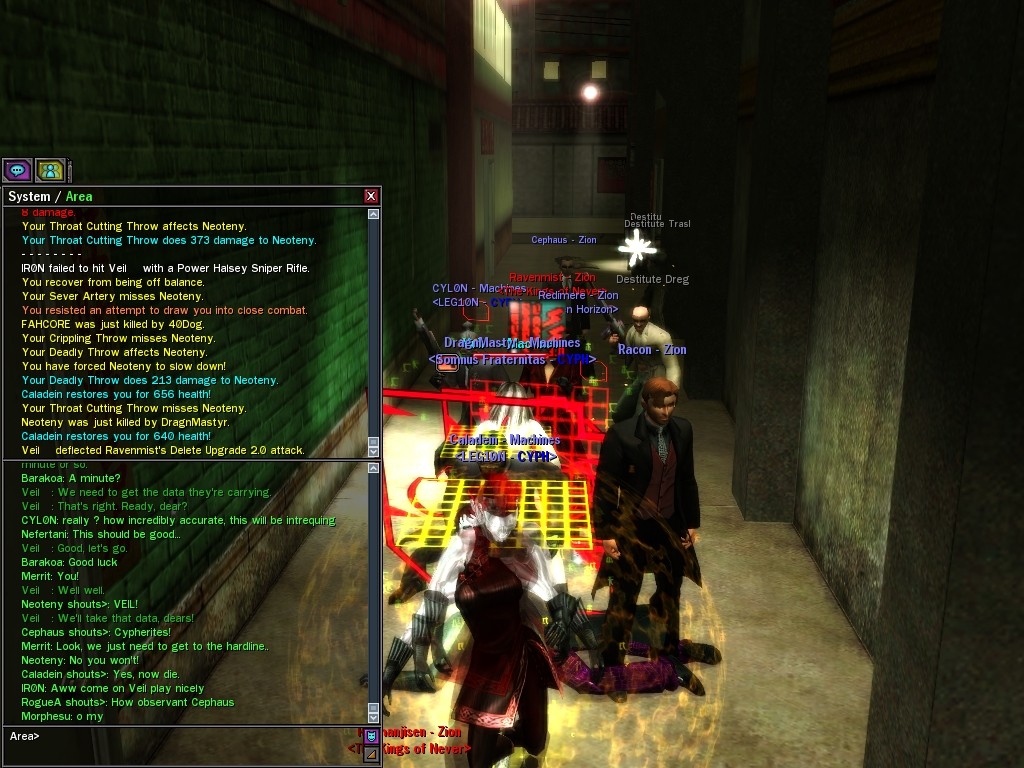 The Exile Eris, identified by transmissions from the Hovercraft Scanline as a member of a group of mercenaries who blackmail redpills, was eliminated by EPN and Zion operatives in Club Deus. The operatives were directed there by one "Sykco," apparently an associate of Unese, the person identified by the public Scanline broadcasts as having access to Eris' whereabouts. Tyndall Mission Control Zion Command
