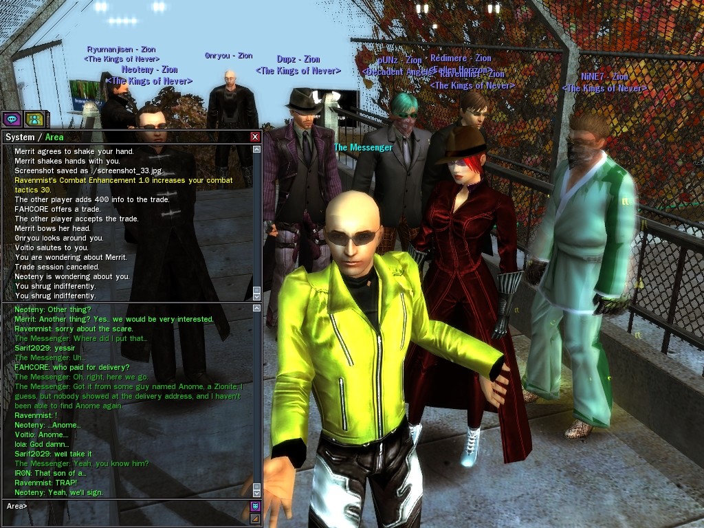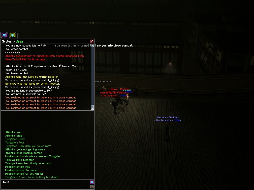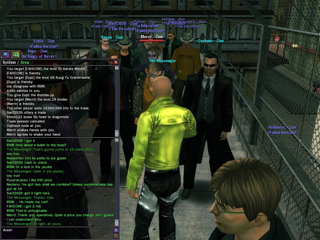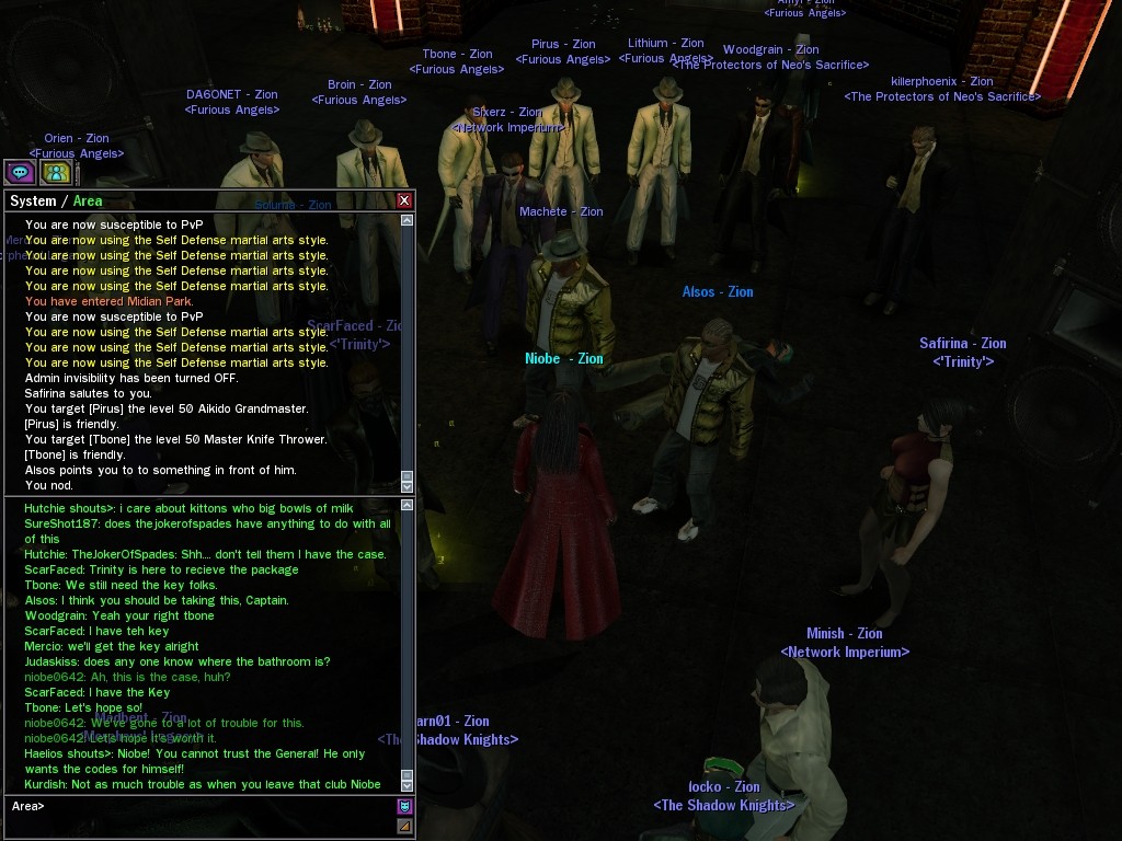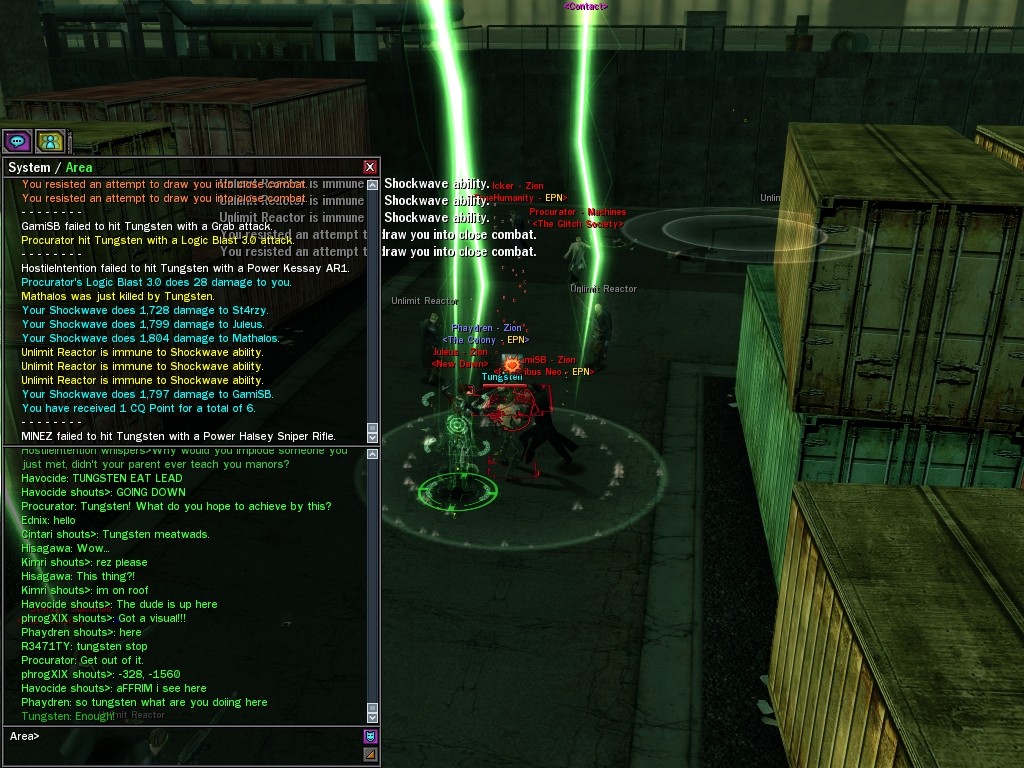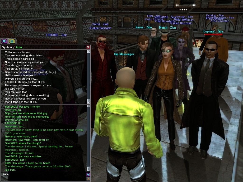 The Exile Eris, identified by transmissions from the Hovercraft Scanline as a member of a group of mercenaries who blackmail redpills, was eliminated by EPN and Zion operatives in Club Deus. The operatives were directed there by one "Sykco," apparently an associate of Unese, the person identified by the public Scanline broadcasts as having access to Eris' whereabouts. Tyndall Mission Control Zion Command