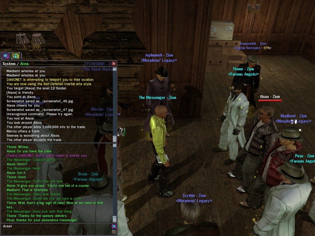 The General's case is safely in our possession. At a meeting arranged by liaison officers Soluma and Alsos, Anome met with operatives, briefing them on the general whereabouts of the General's messenger, who has been safeguarding the case of cheat codes. After a prolonged high-speed chase throughout Richland, our fighters, with warriors Pirus and Tbone at the forefront, caught up with the messenger and brought him to Alsos, who presented the case to Niobe. Our operatives then escorted Niobe to a nearby hardline, where she was able to jack out safely with the case.