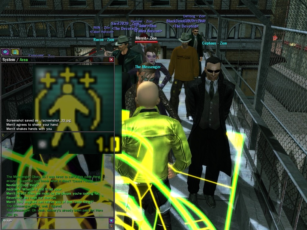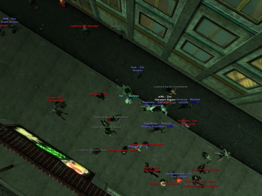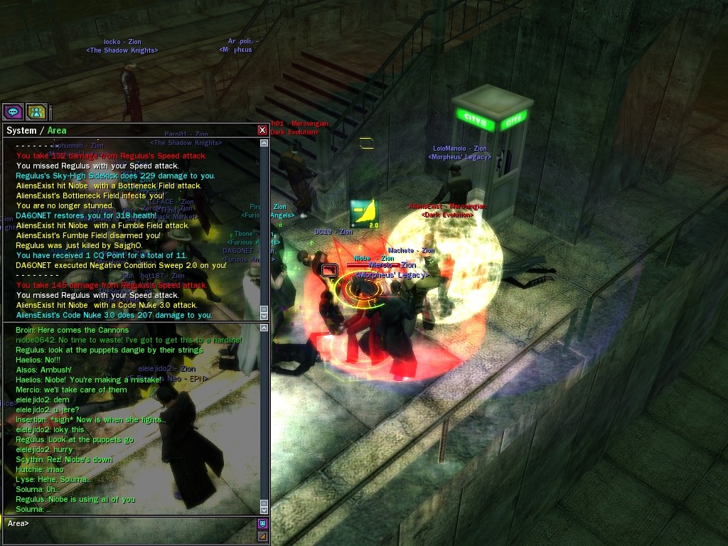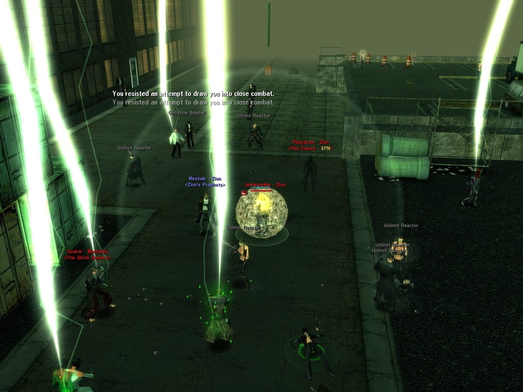 Operatives responded in large numbers to an outbreak of the Smith Virus in Downtown. Although the strain of the massive battle literally brought the simulation to a halt at one point, the operatives finally prevailed, with Ventio taking the shot that finally brought the virus down. Smaller manifestations of the virus throughout a large part of the district followed, but at this time we believe that operatives have the situation well in hand. Tyndall Mission Control Zion Command